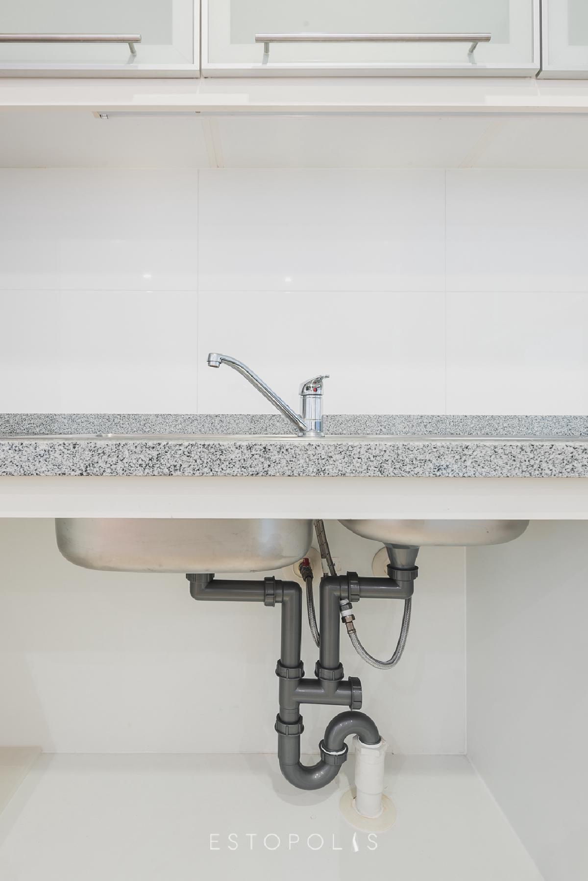 เมื่อเปิดประตูห้องเข้ามาจะพบกับโซนครัวแบบเปิดทางขวามือ เคาน์เตอร์ครัวปูด้วยหินอ่อนในโทนสว่าง เฟอร์นิเจอร์ในส่วนนี้เป็นสีขาว ส่วนพื้นปูด้วยกระเบื้องเพื่อรองรับน้ำขณะทำอาหาร พร้อมกับมีช่องว่างเพื่อวางตู้เย็น