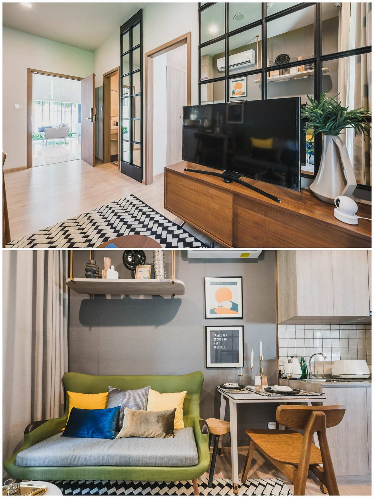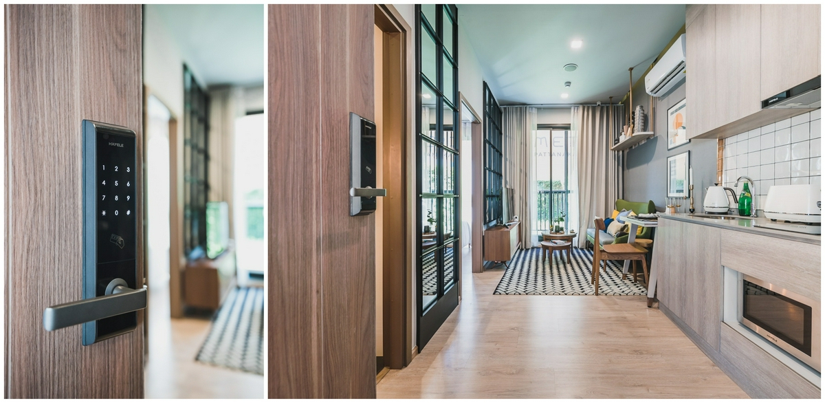 เชื่อมต่อเข้าสู่ห้องพักอาศัยแสนอบอุ่นผ่าน Digital Door Lock จากแบรนด์ Hafele ที่ทางโครงการให้มา ภายในห้องตกแต่งแบบ Fully Fitted เพดานสูง 2.6 เมตร ให้ความรู้สึกค่อนข้างโล่งโปร่งสบาย พื้นห้องทั้งหมดเป็นวัสดุลามิเนตหนา 8 มิลลิเมตร ขวามือจากทางเข้าเป็นเคาน์เตอร์ครัว ซ้ายมือเป็นห้องน้ำ ถัดไปด้านในเป็นพื้นที่นั่งเล่นติดระเบียง มีแสงส่องสว่างจากด้านนอกเข้ามาภายในห้องได้อย่างทั่วถึง ซ้ายมือติดกันกับห้องนั่งเล่นเป็นทางเข้าพื้นที่ส่วนตัวอย่างห้องนอนตามลำดับ