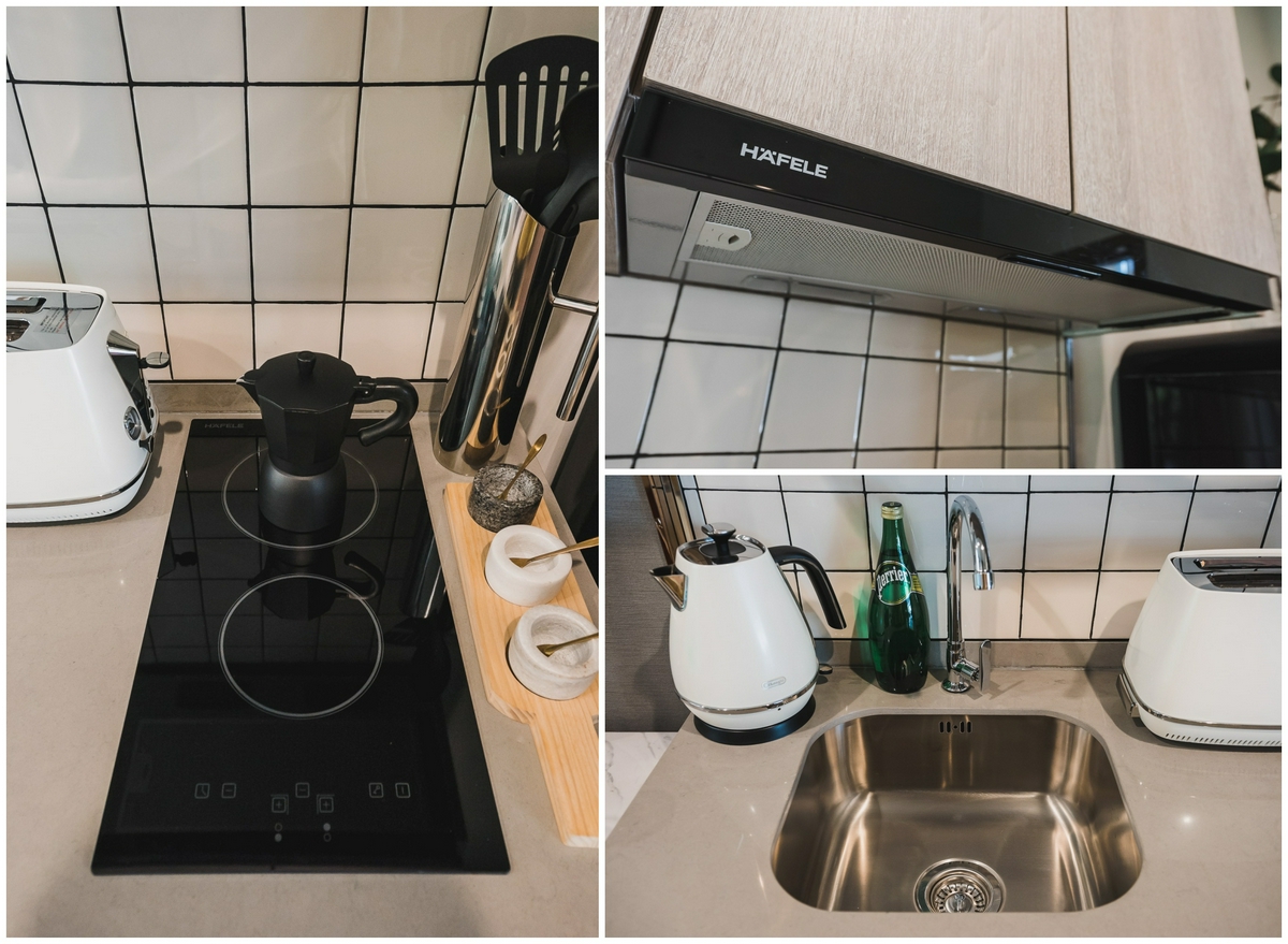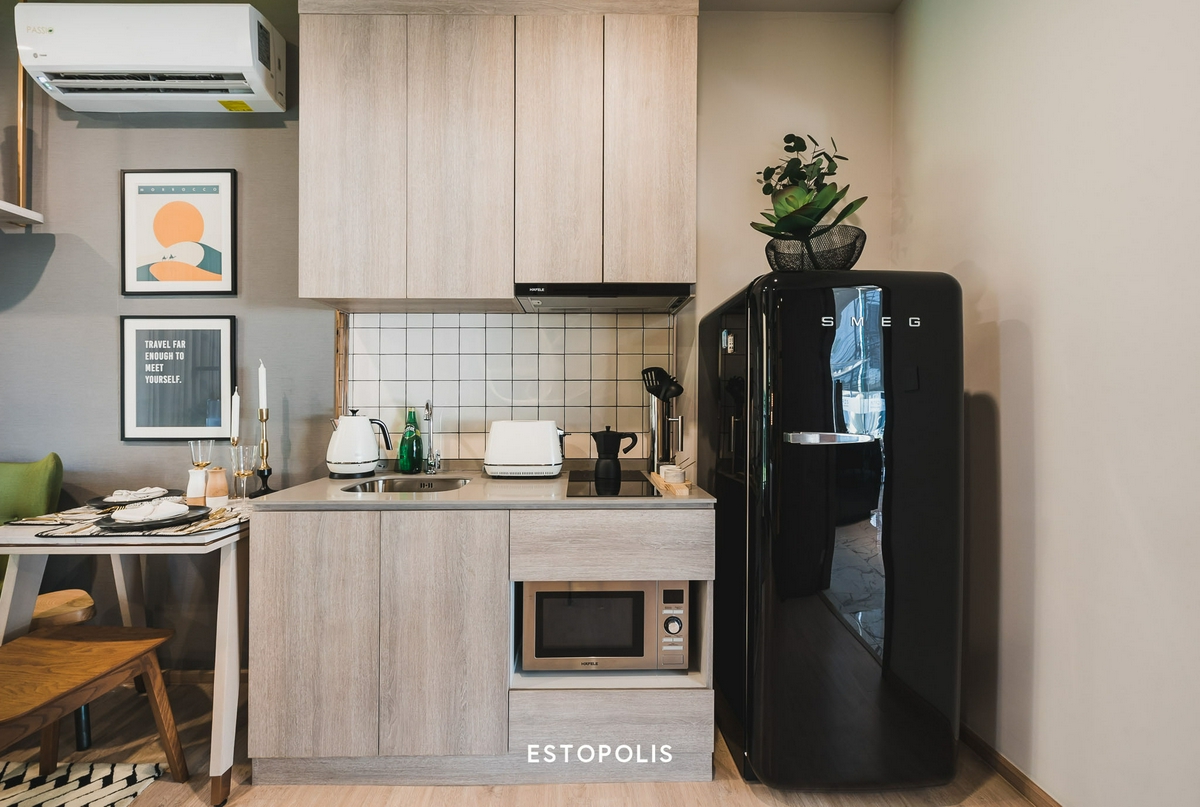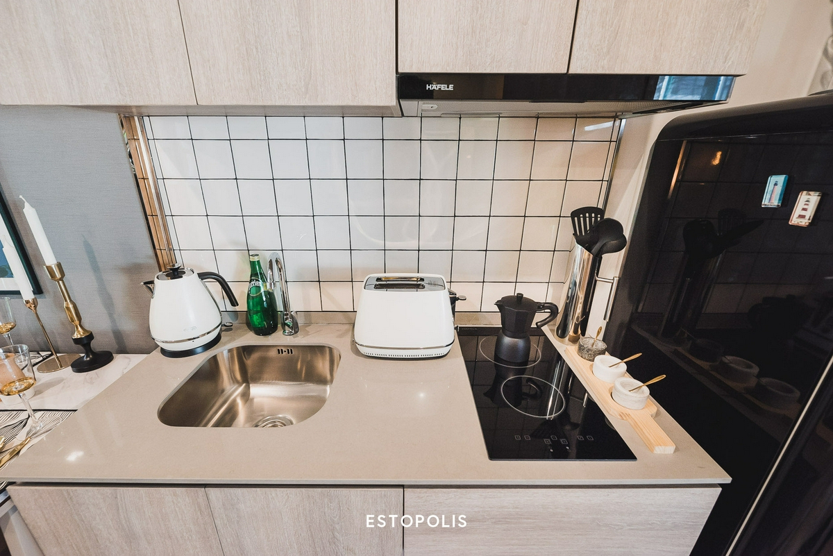 ส่วนชุดครัวที่ทางโครงการให้ จะประกอบไปด้วยเตาไฟฟ้า 2 หัว พร้อม Hood และซิงก์ล้างจานจากแบรนด์ Hafele แบรนด์ชั้นนำระดับโลกที่ทุกคนให้ความไว้วางใจ
