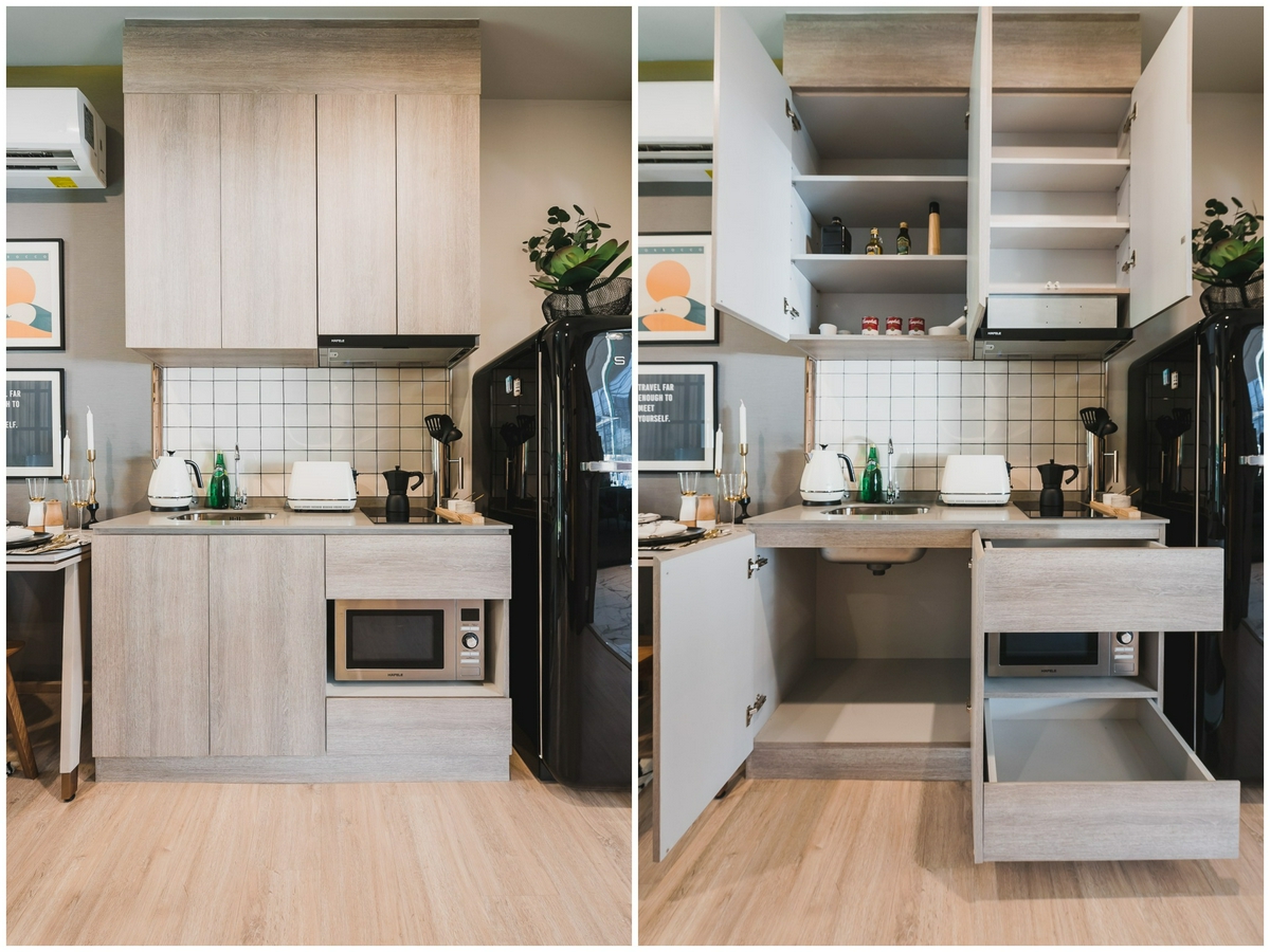 สำหรับพื้นที่จัดเก็บก็ให้มาอย่างครบครัน ทั้งบานตู้ขนาดใหญ่ใต้ซิงก์ล้างจาน, ลิ้นชัก 2 ชั้น และตู้เก็บของแบบแบ่งชั้น ทำให้เราสามารถจัดเก็บอุปกรณ์ทำครัว, ภาชนะ, อาหารแห้ง และเครื่องปรุงต่าง ๆ ได้อย่างเพียงพอและเป็นระเบียบเรียบร้อย นอกจากนี้ด้านล่างก็ยังเว้นช่องสำหรับวางไมโครเวฟเอาไว้ให้อีกด้วย