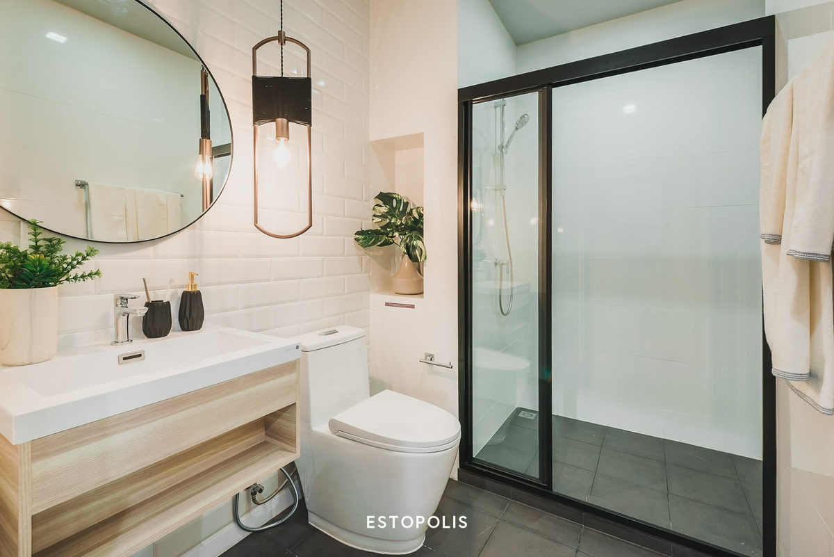 ทางด้านของห้องน้ำ ภายในจะตกแต่งให้ครบสวยงาม ตามแบบในห้องตัวอย่างทุกประการ พื้นห้องน้ำเป็นวัสดุกระเบื้องโทนสีเทา ตัดกันอย่างลงตัวกับผนังห้องที่กรุด้วยกระเบื้องลายอิฐสีขาวสะอาดตา บริเวณซ้ายมือติดทางเข้าจะเป็นเคาน์เตอร์อ่างล้างหน้า ถัดไปติดกันเป็นโถสุขภัณฑ์ ซึ่งด้านตรงข้ามจะมีราวแขวนผ้าขนหนูมาให้ ด้านในสุดเป็นส่วนเปียก Shower Box ซึ่งกั้นแยกออกจากพื้นที่ใช้งานส่วนแห้งด้วย Partition