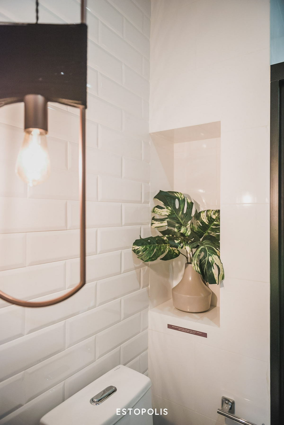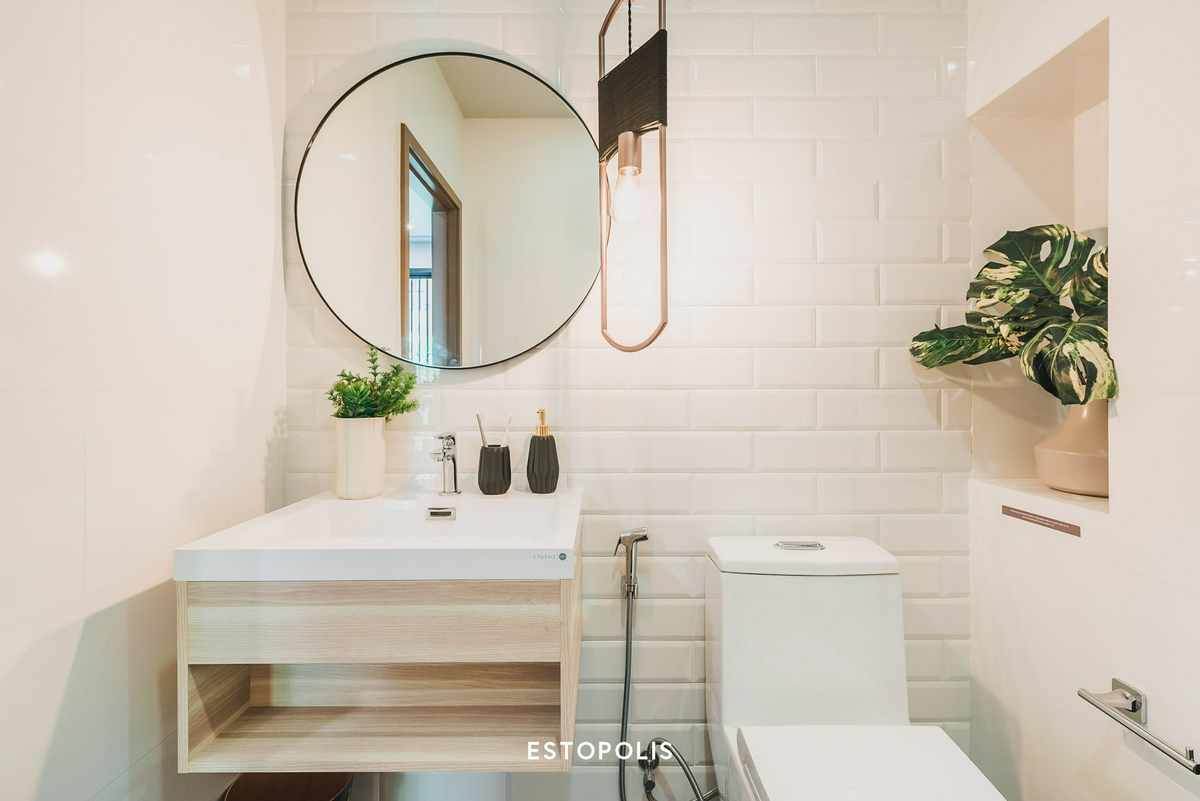 พื้นที่วางของอีกหนึ่งจุดจะอยู่ติดกับโถสุขภัณฑ์ โดยบริเวณผนังด้านข้างทางโครงการจะ Drop Wall เอาไว้ให้ ซึ่งเราสามารถเพิ่มชั้นวางของ เติมต้นไม้สีเขียวสร้างบรรยากาศ หรือเพิ่มเทียนหอมกลิ่นอโรม่าผ่อนคลายความเครียดไว้ที่บริเวณนี้ก็ได้