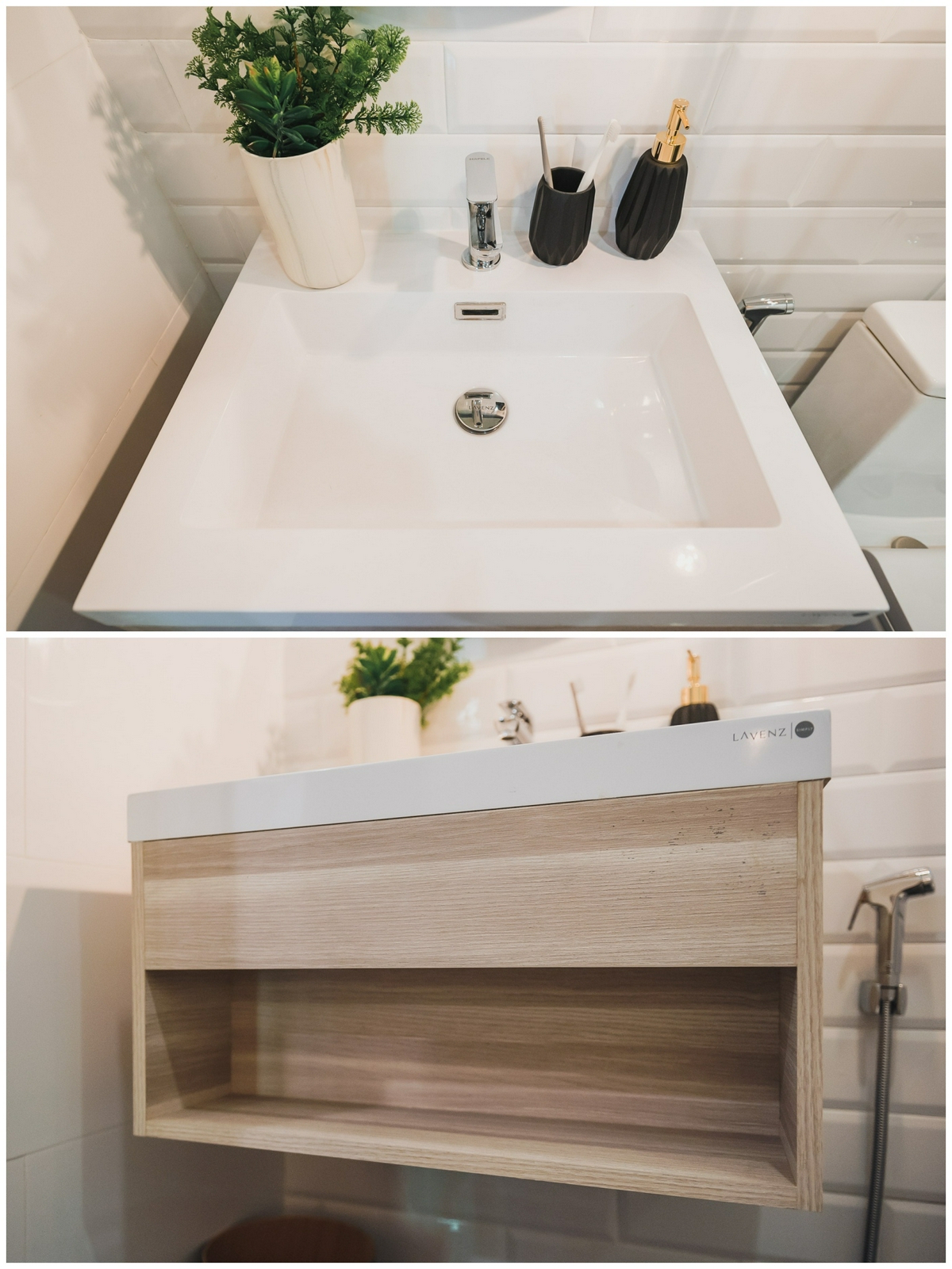 รายละเอียดในพื้นที่ส่วนแห้งนั้น ในส่วนของอ่างล้างหน้าจะติดตั้งเป็นกระจกทรงกลมขอบดำดีไซน์เก๋มาให้ ชุดอ่างล้างหน้ามาในโทนสีขาวด้านใต้เป็นพื้นที่วางของลายไม้สีอ่อนจากแบรนด์ Lavenz โถสุขภัณฑ์พร้อมสายชำระและที่ใส่ทิชชู่ก็ยังคงใช้แบรนด์ชั้นนำอย่าง Hafele อีกเช่นเคย