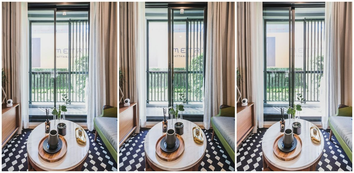 ต่อกันที่ระเบียงของห้อง บานประตูกระจกสไลด์ส่วนนี้ จะเป็นลักษณะแบบ 2 หน้าบานที่สามารถเลือกเปิดได้จากทั้ง 2 ฝั่งซ้ายและขวา