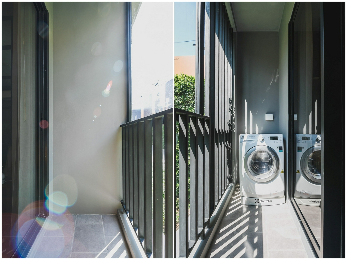 ด้านนอกระเบียงเป็นพื้นกระเบื้องสีเทา ให้พื้นที่มากว้างขวางสำหรับตากผ้าได้แบบสบาย ๆ ขวามือติดตั้งระบบสำหรับวางเครื่องซักผ้าทั้งฝาหน้าและฝาบนเอาไว้ให้พร้อมท่อระบายน้ำ และส่วนของแอร์คอมเพรสเซอร์จะแขวนลอยอยู่เหนือส่วนนี้ด้วยเช่นกัน