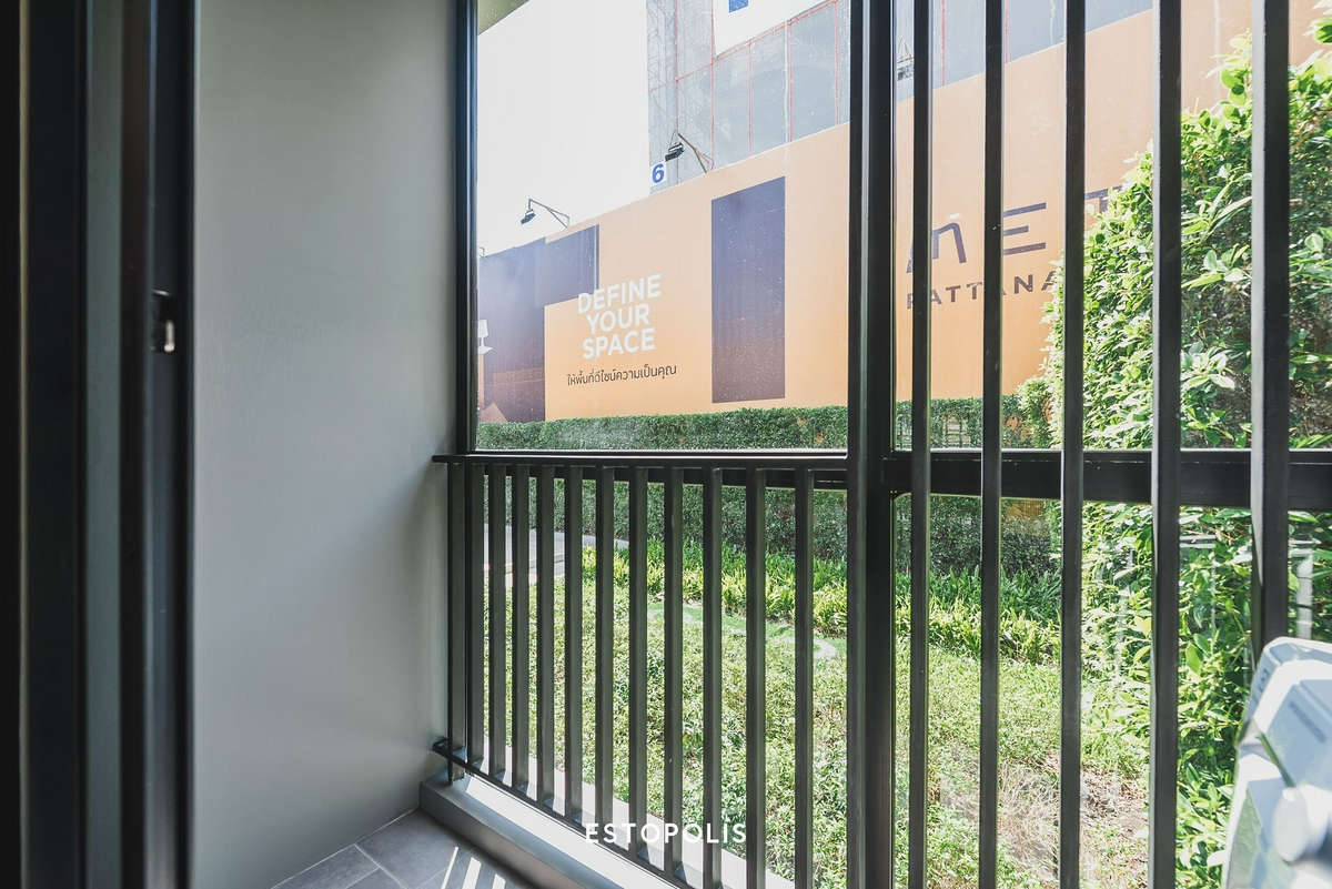 ราวระเบียงของห้องฝั่งที่อยู่ติดกับเครื่องซักผ้า ทางโครงการจะกั้นเป็นแบบเต็มความสูงถึงเพดานเอาไว้ให้ ซึ่งก็ค่อนข้างปลอดภัยในการใช้งาน ช่วยป้องกันเสื้อผ้าหรือสิ่งของของเราร่วงตกลงไปได้อีกทางหนึ่ง และยังเพิ่มดีไซน์ให้ดูมีความสวยงามมากขึ้น
