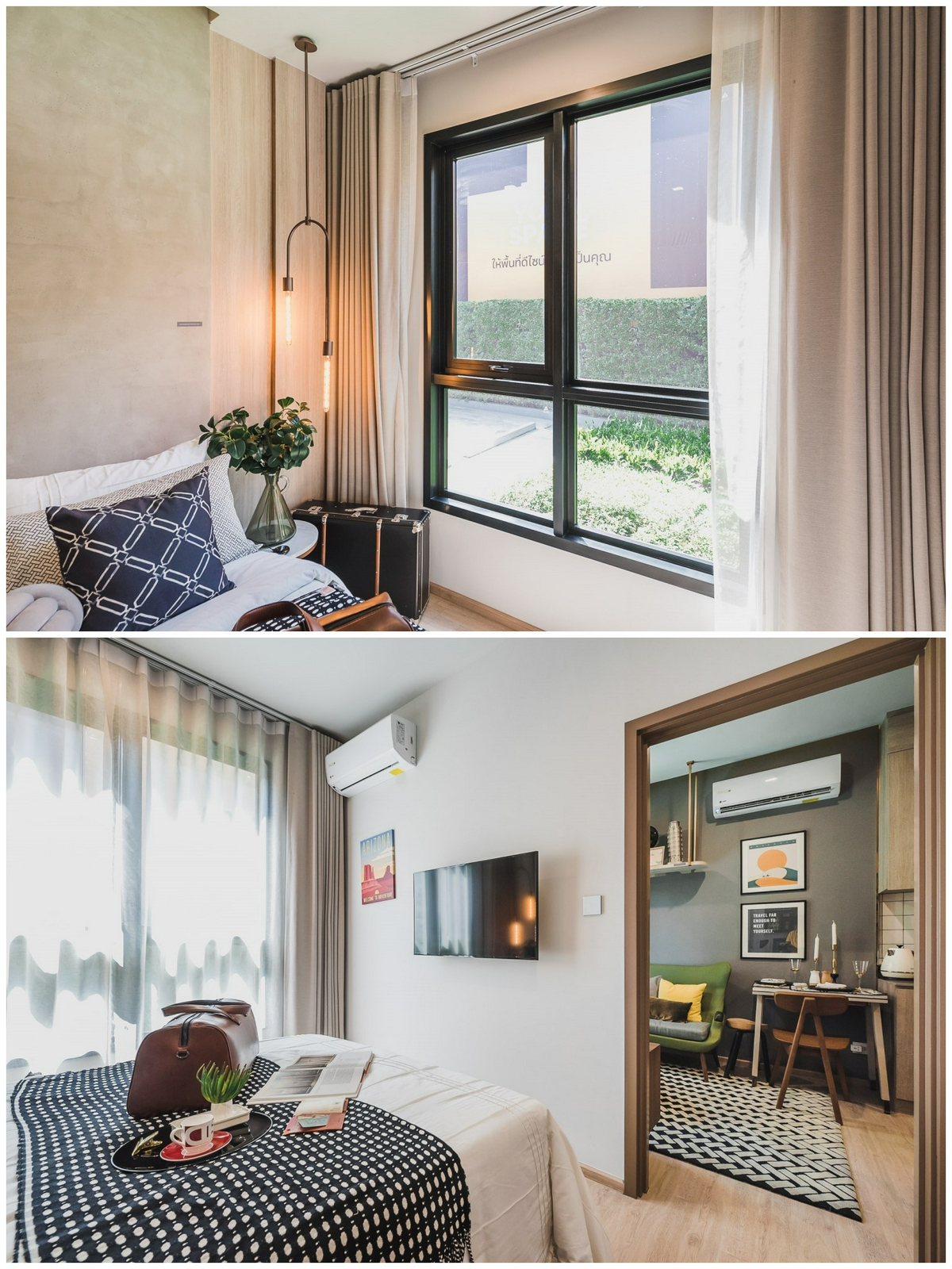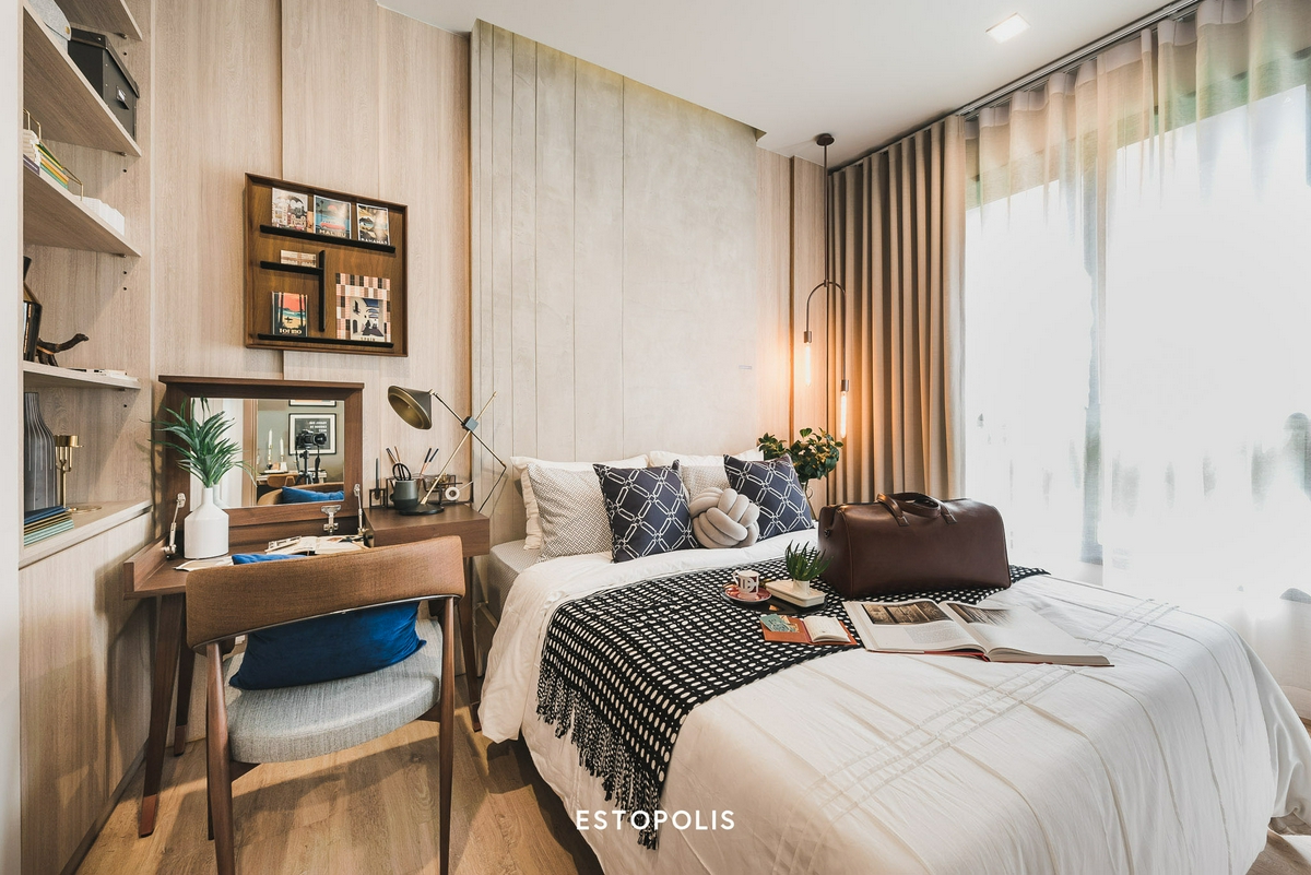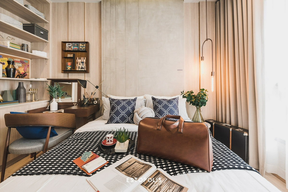 - หากอยู่คนเดียว จะเลือกใช้เป็นเตียงขนาด 3.5 ฟุต แล้วเพิ่มโต๊ะทำงานติดริมหน้าต่างก็ดูดีไปอีกแบบ