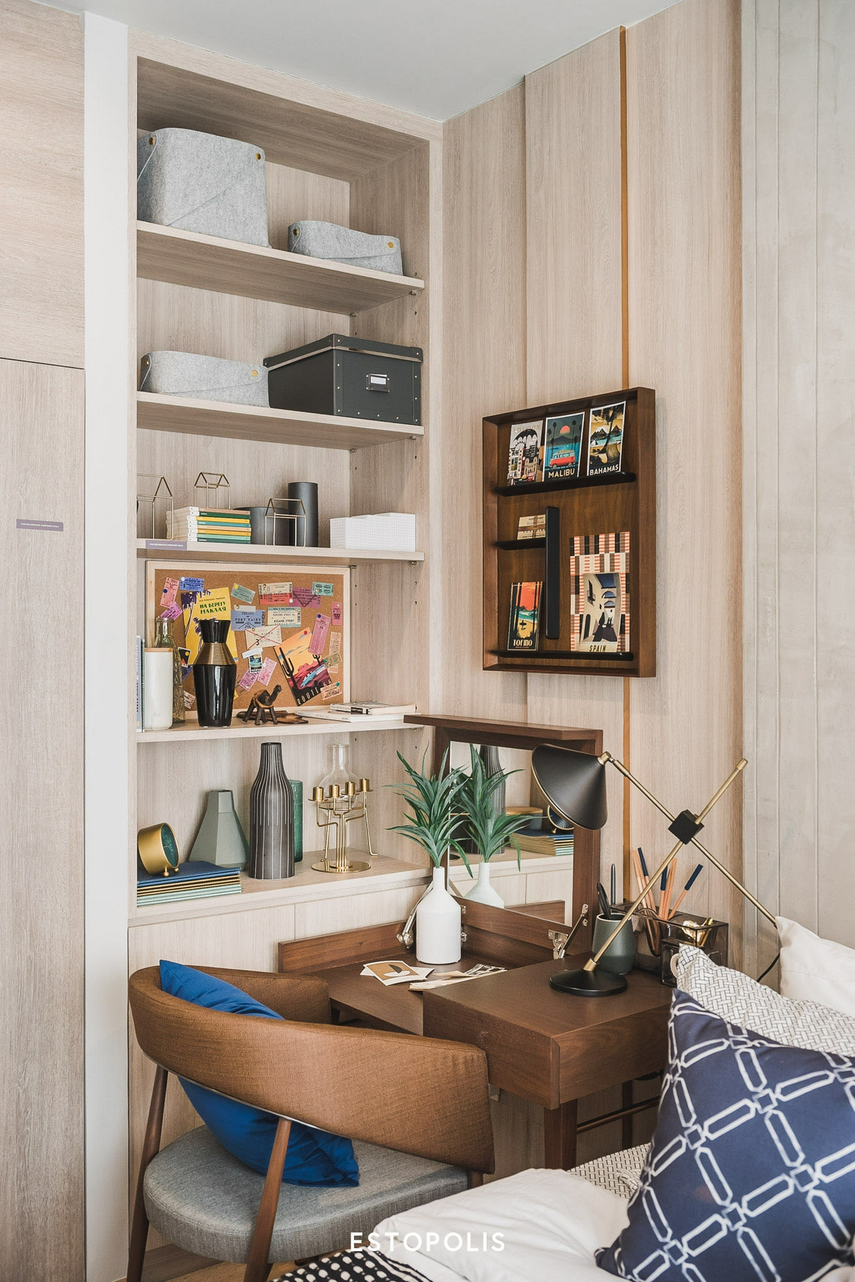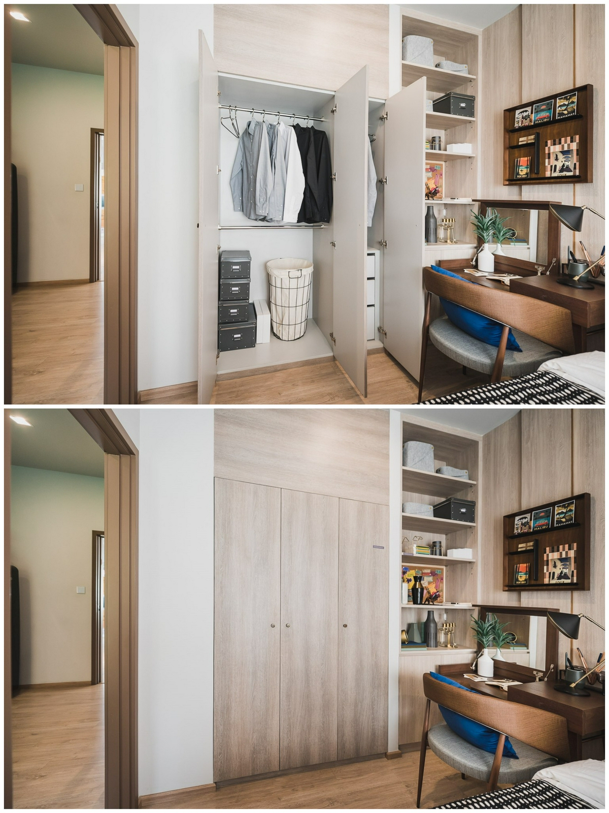 ด้านซ้ายมือจากทางเข้าห้อง ส่วนนี้จะ Drop เว้นช่องเอาไว้สำหรับบิลต์อินเพิ่มเติมเป็นตู้เสื้อผ้า เราสามารถดีไซน์พื้นที่ส่วนนี้ได้อย่างอิสระ อยากจะเพิ่มเป็นชั้นวางหนังสือแบบในห้องตัวอย่าง หรือจัดเต็มสำหรับเก็บเสื้อผ้าล้วน ๆ ก็เลือกได้ตามความชอบอีกเช่นกัน