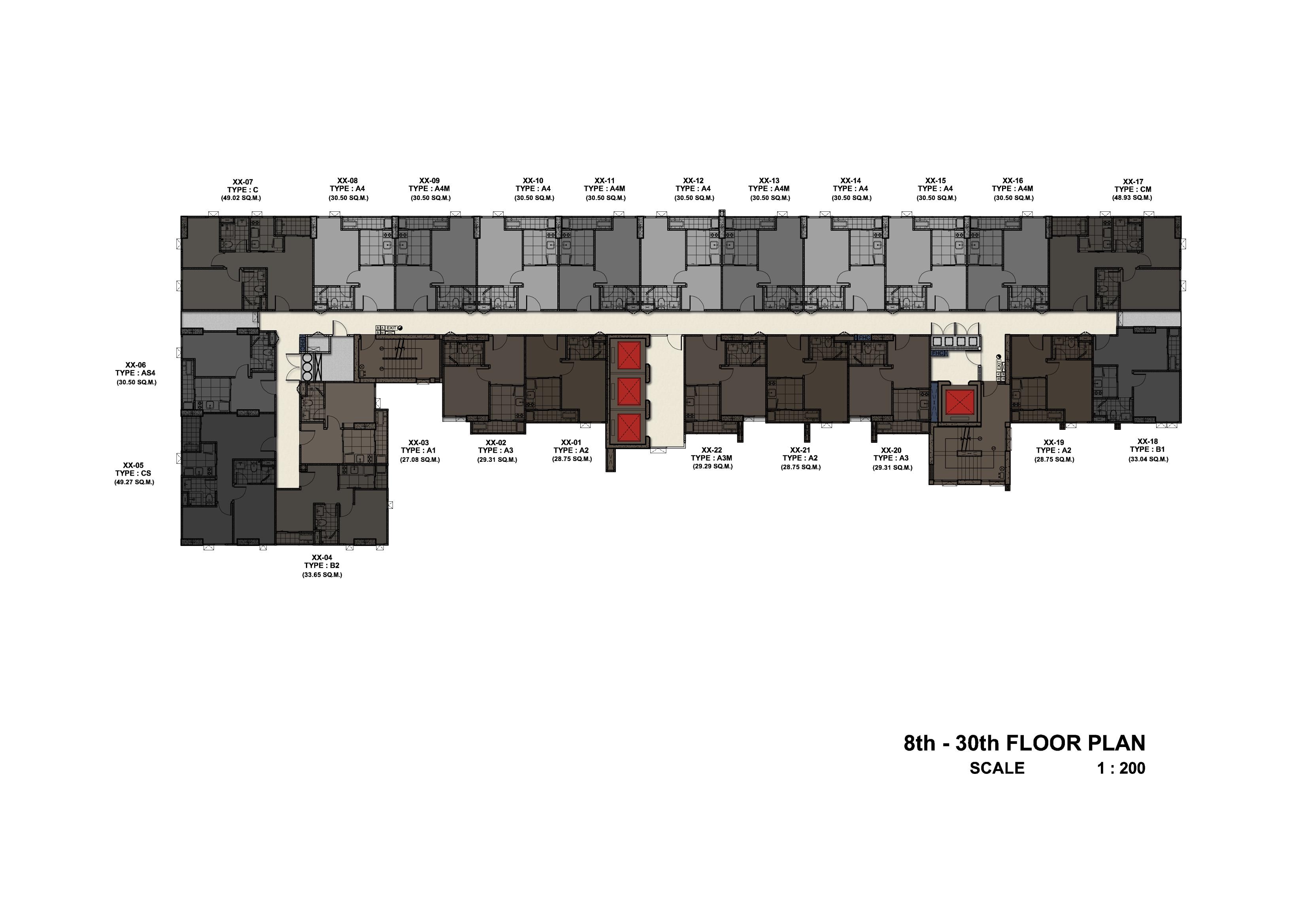 ส่วนชั้นที่ 8 - 30 จะมีลักษณะแปลน และจำนวนยูนิตเหมือนกับชั้น 7 แตกต่างกันตรงที่ไม่มีพื้นที่ส่วนกลางเท่านั้น