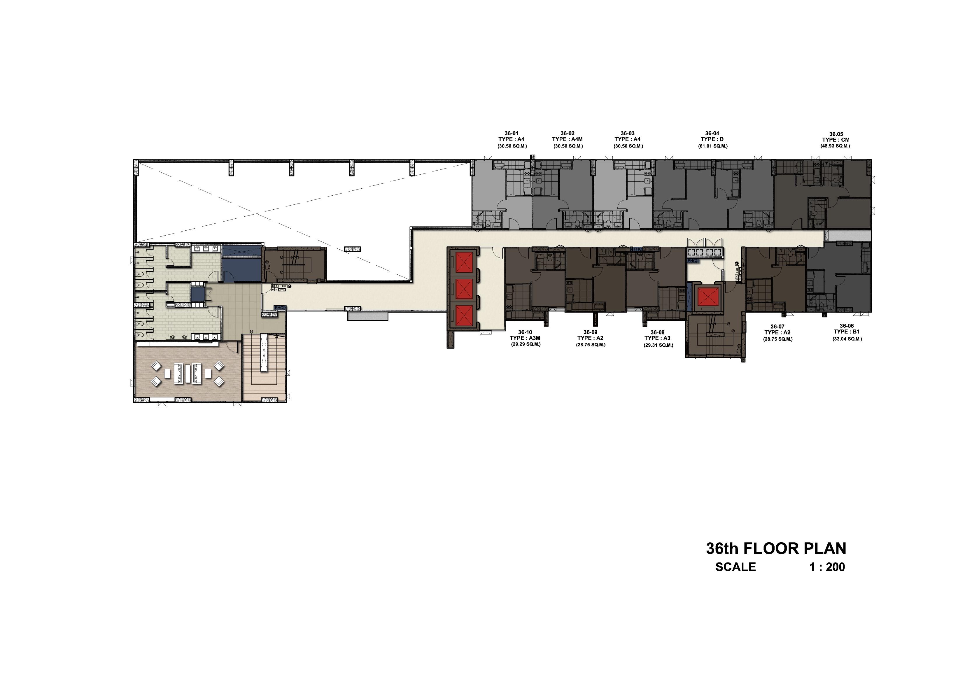 ส่วนชั้นที่พักอาศัยสุดท้ายอย่างชั้น 36 จะแบ่งสัดส่วนระหว่าง ’พื้นที่ส่วนกลาง’ กับ ‘พื้นที่พักอาศัย’ ออกอย่างละครึ่ง โดยจะมีพื้นที่ส่วนกลางอย่าง Sky Lounge และ Sky Steam อยู่มุมอาคาร ติดกับพื้นที่พักอาศัยจำนวน 10 ยูนิต แบ่งเป็น TYPE A1 (28.20 SQ.M), TYPE A2 (28.41 SQ.M), TYPE A3 (28.64 SQ.M), TYPE A3M (29.00 SQ.M), TYPE A4 (30.07 SQ.M), TYPE A4 (30.10 SQ.M), TYPE A4M (30.10 SQ.M), TYPE B1 (31.76 SQ.M), TYPE C (48.07 SQ.M) และ TYPE D (60.20 SQ.M) อย่างละ 1 ห้อง