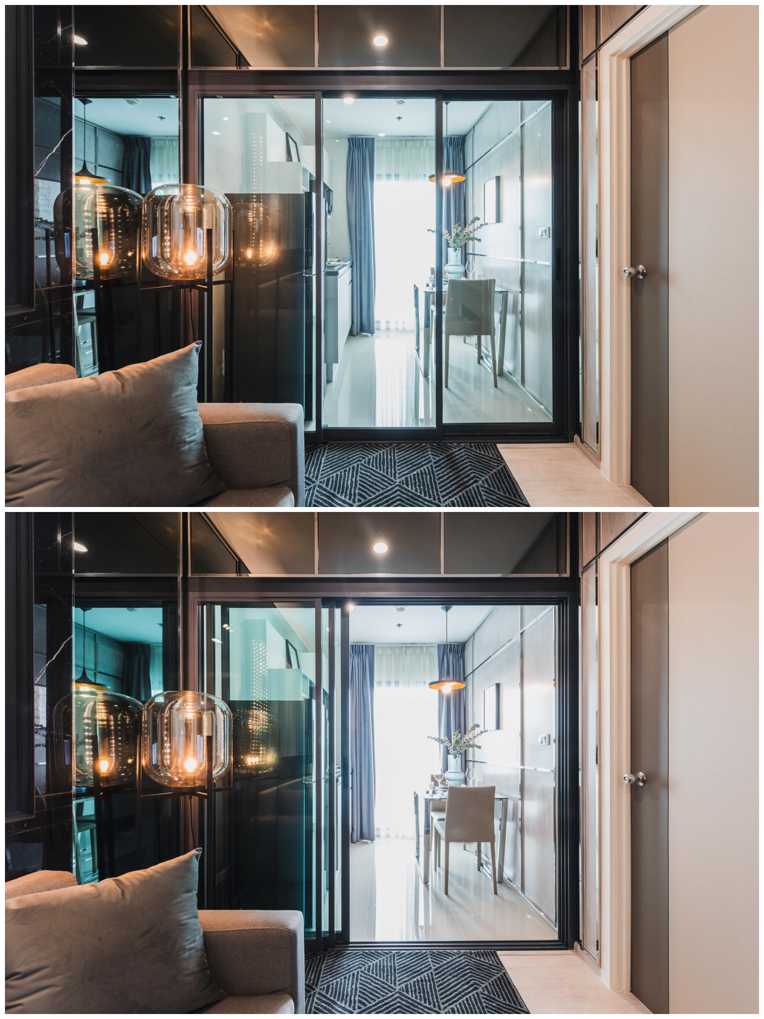 บริเวณพื้นที่ห้องนั่งเล่นกับห้องครัวจะถูกแบ่งกั้นไว้ด้วยประตูกระจกบานสไลด์ ซึ่งเราสามารถเปิดออกเพื่อเชื่อมต่อพื้นที่ทั้ง 2 ห้องเข้าด้วยกันได้ ทำให้ห้องดูโปร่ง อากาศถ่ายเทดี