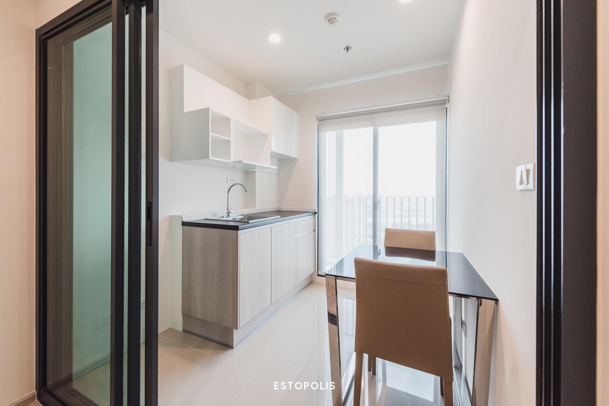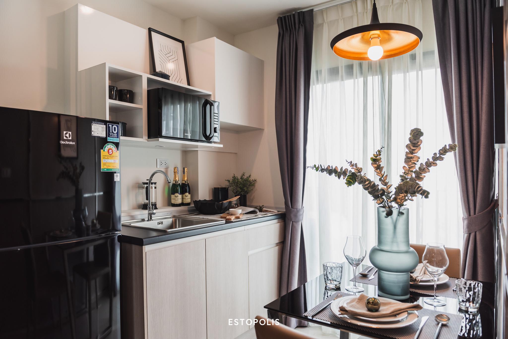 พื้นที่ครัวของห้อง Type นี้ให้มาค่อนข้างกว้างพอสมควร สำหรับใครที่รักการทำอาหารก็หมดกังวลเรื่องกลิ่นไปได้เลย เพราะทางโครงการได้ออกแบบให้ครัวอยู่ติดกับระเบียง สามารถเปิดประตูระเบียงเพื่อระบายอากาศในเวลาทำอาหารได้ นอกจากนี้ยังมีพื้นที่ให้เราวางตู้เย็นขนาดใหญ่ คู่กับชุดโต๊ะทานข้าวได้แบบสบายๆ นับว่าตอบโจทย์ความต้องการของคนรักการทำอาหารได้ดีทีเดียว