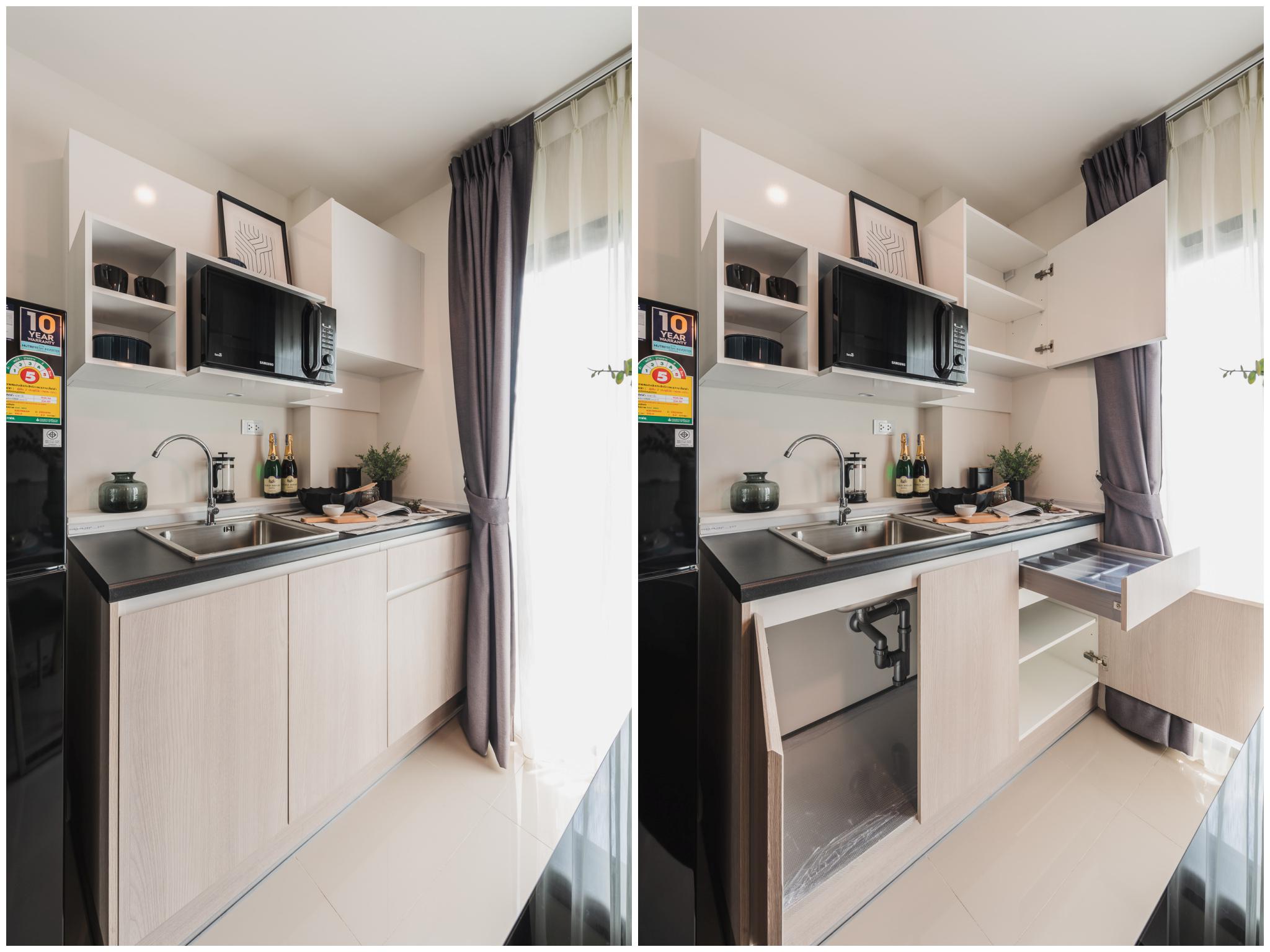 บริเวณชุดครัวบิวท์อินและตู้เก็บของติดผนัง ก็ได้จัดวาง แบ่งสัดส่วนการจัดเก็บมาให้อย่างจุใจ ทั้งลิ้นชักสำหรับเก็บช้อนส้อม, เครื่องครัว, ตู้ และชั้นสำหรับเก็บอาหารแห้งหรือขวดเครื่องปรุง และชั้นวางไมโครเวฟพร้อมที่เก็บสายไฟเรียบร้อย รับรองว่า ต่อให้ของเยอะแค่ไหนก็จัดเก็บได้เพียงพอ