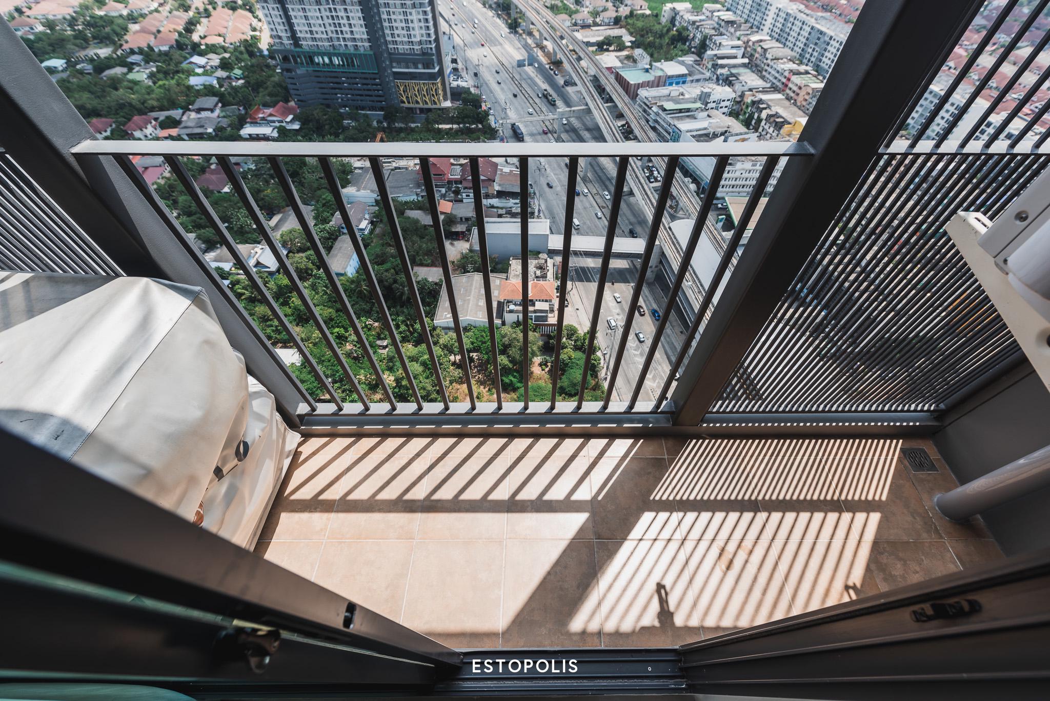 ระเบียงด้านนอกสามารถเปิดออกเพื่อระบายอากาศได้ดี ทั้งยังเป็นพื้นที่สำหรับวางเครื่องซักผ้าและราวตากผ้าได้ด้วย โดยแอร์คอมเพรสเซอร์จะถูกติดลอยเหนือพื้นอยู่ทางด้านขวา หันหน้าออกนอกอาคาร ทำให้ลมร้อนไม่เข้าพัดมาในห้องอย่างแน่นอน