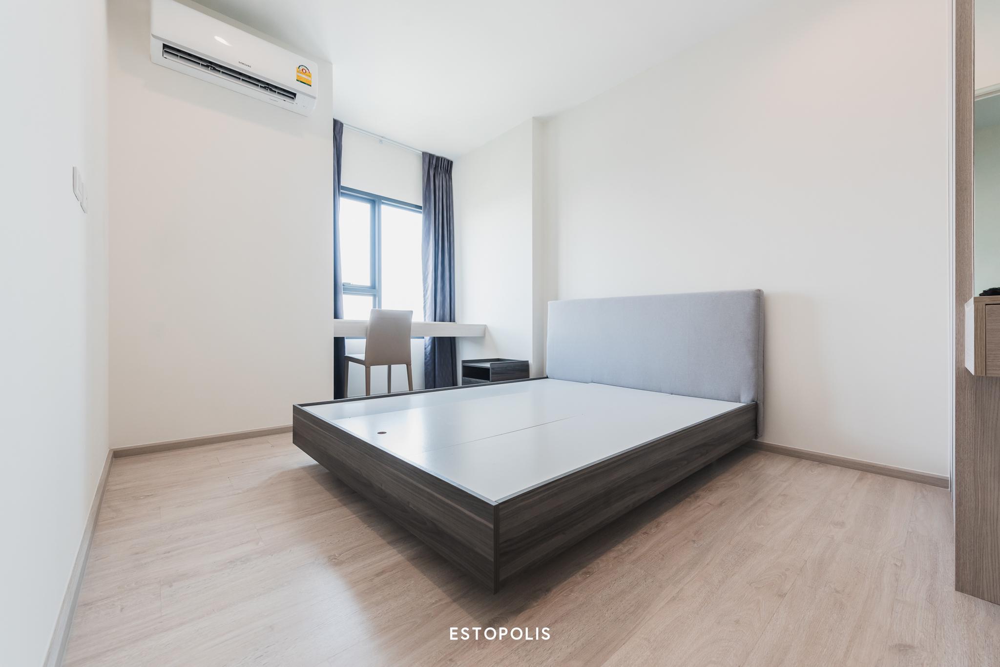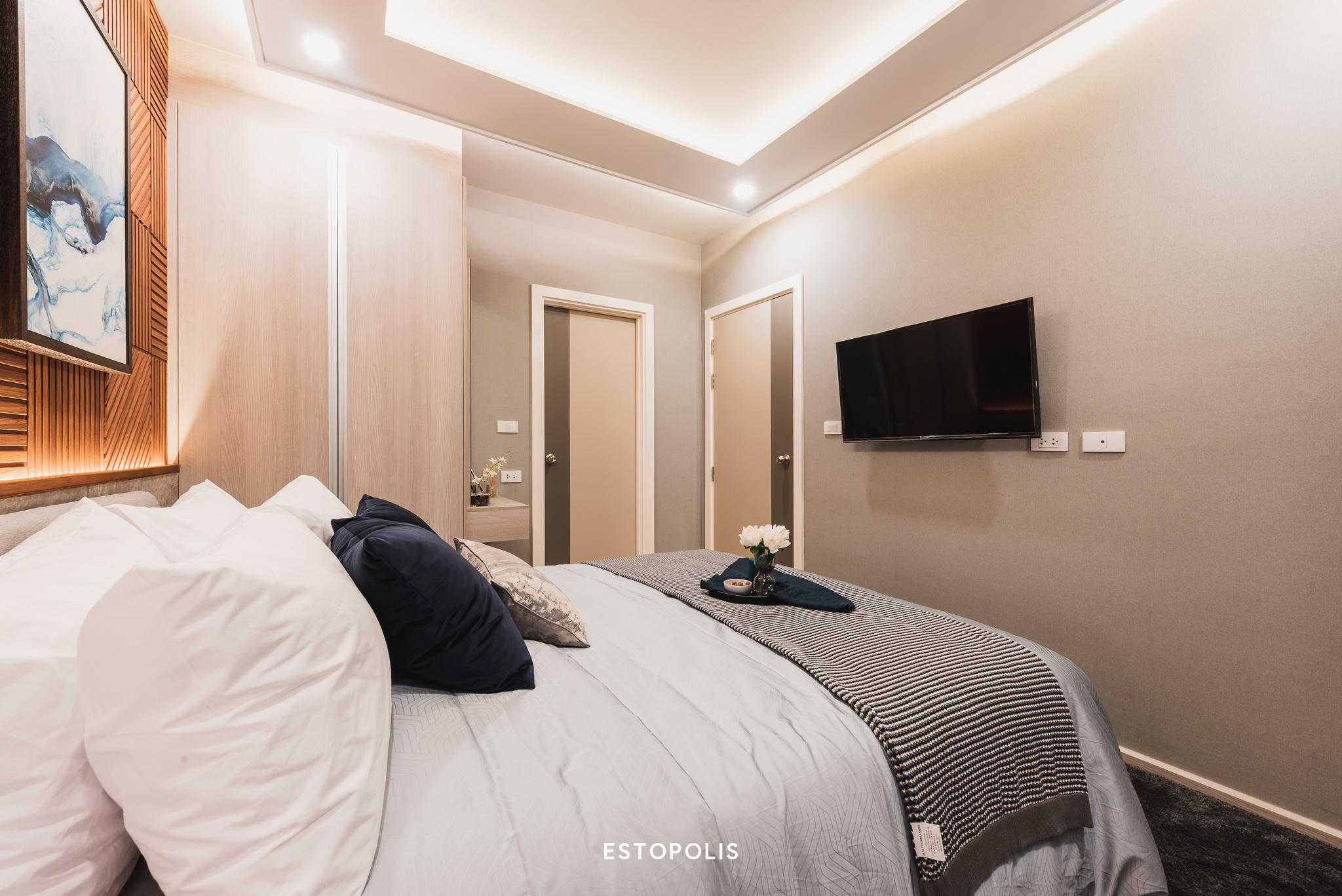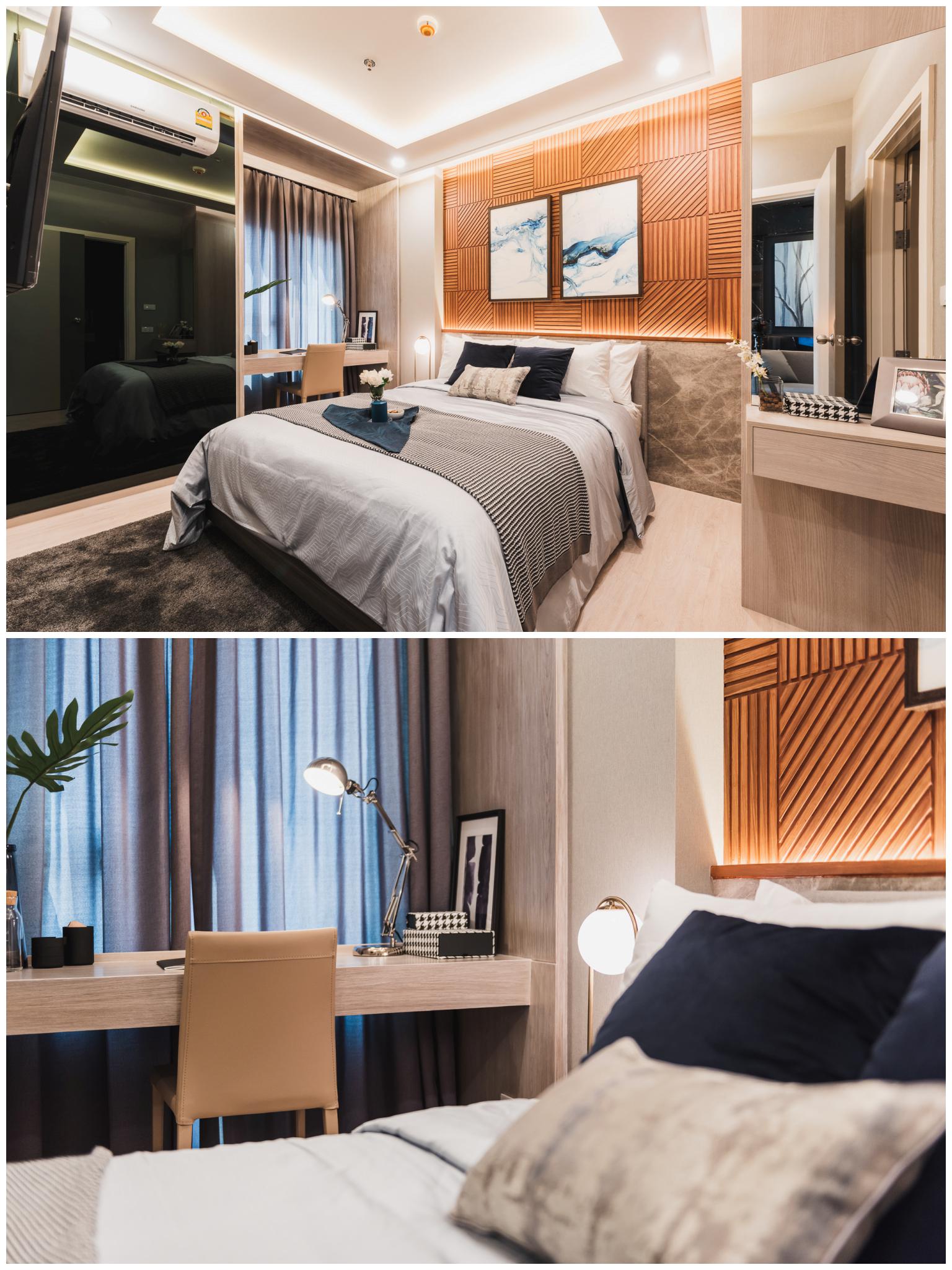 กลับเข้ามาที่ส่วนของห้องนอนกันบ้าง บริเวณกลางห้องตัวอย่างจะวางเป็นเตียงขนาด 5 ฟุต แต่เมื่อเดินเข้าไปจะเห็นว่าพื้นที่รอบ ๆ เตียงยังเหลือพื้นที่มากพอให้เราวางเตียงนอนขนาดใหญ่ 6 ฟุตแทนได้สบาย ๆ โดยทางซ้ายจะติดตั้งเครื่องปรับอากาศ ส่วนมุมข้างเตียงฝั่งหน้าต่างจะเป็นโต๊ะทำงานบิวท์อินพร้อมเก้าอี้ ซึ่งถือเป็นจุดเด่นของห้อง Type นี้ เพราะเราสามารถนั่งทำงานพร้อมชมวิวเมืองจากทางหน้าต่างไปด้วยได้ บางครั้งบรรยากาศดีๆ ก็ช่วยให้ไอเดียโลดแล่นได้เหมือนกัน