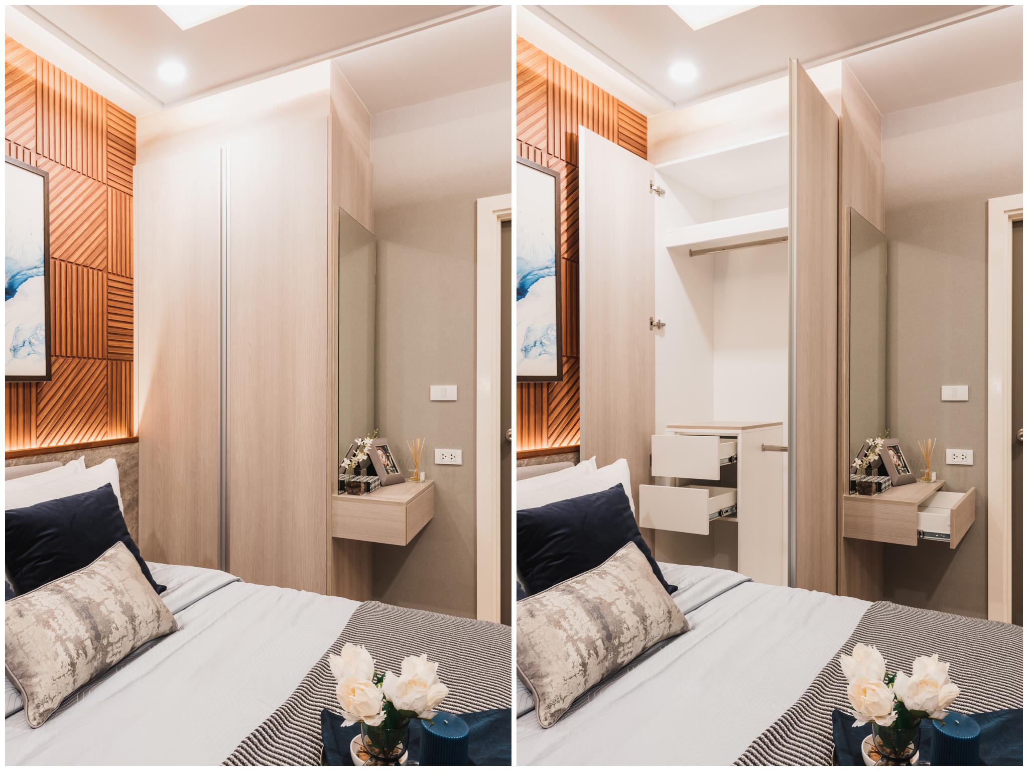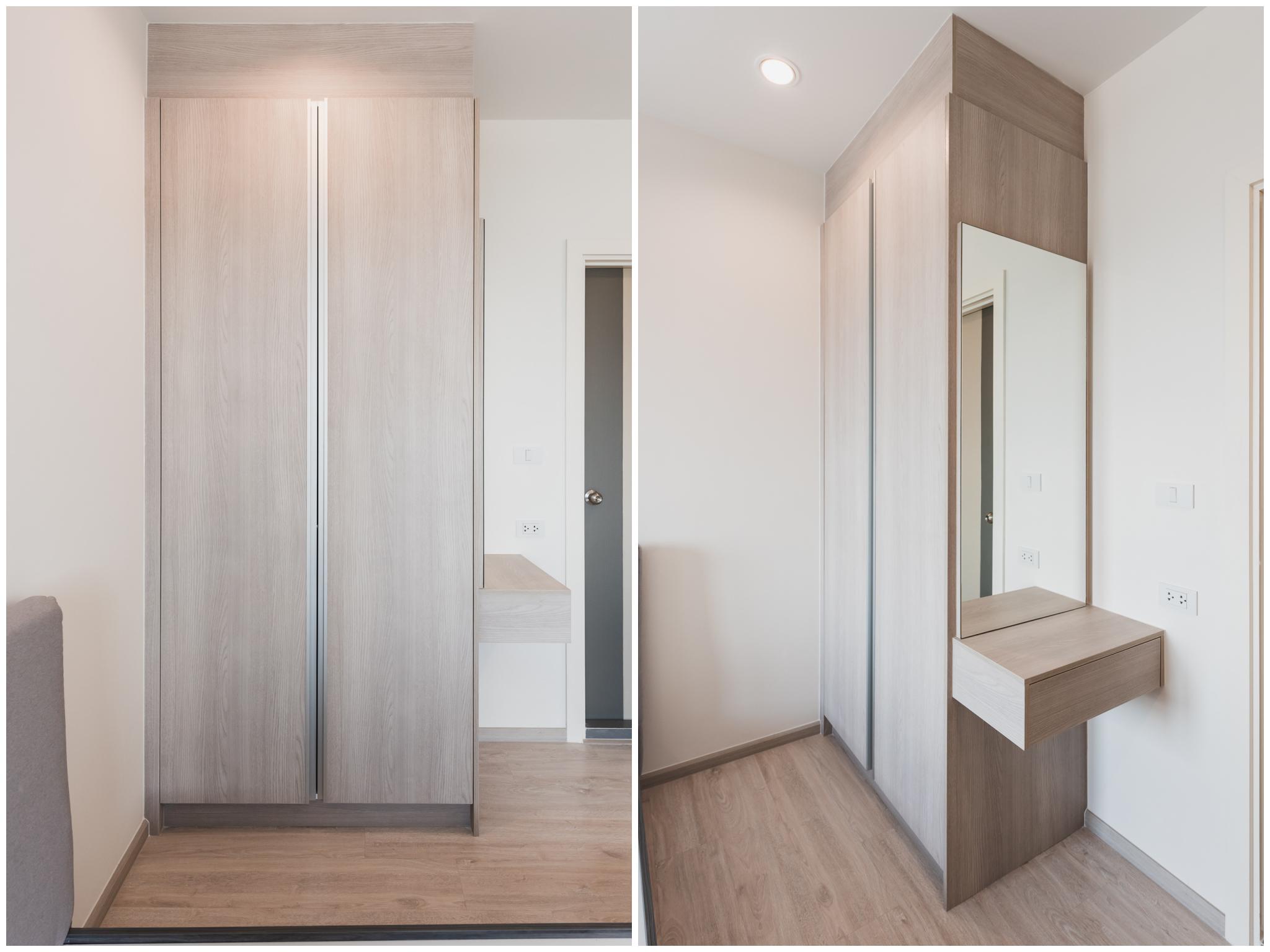 ตู้เสื้อผ้าที่ทางโครงการบิวท์อินมาให้จะมาพร้อมชั้นเก็บของ, ราวแขวน และลิ้นชัก สามารถจัดเก็บเสื้อผ้าได้อย่างเป็นระเบียบ ส่วนด้านข้างตู้จะออกแบบเป็นโต๊ะเครื่องแป้งพร้อมลิ้นชักเก็บของและกระจกในตัว นอกจากจะสะดวกต่อการใช้งานแล้ว ยังประหยัดพื้นที่ห้องนอนเป็นอย่างมาก