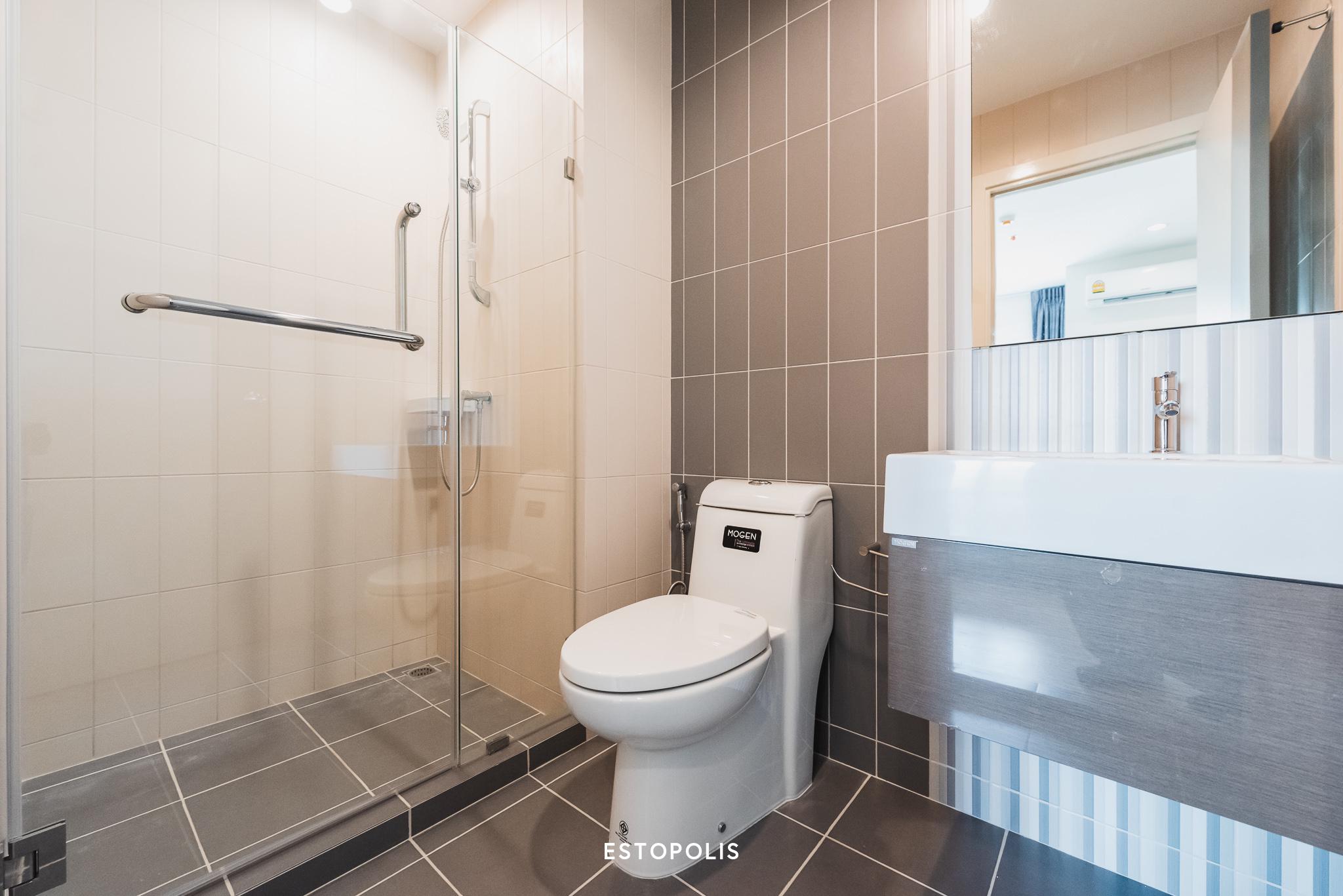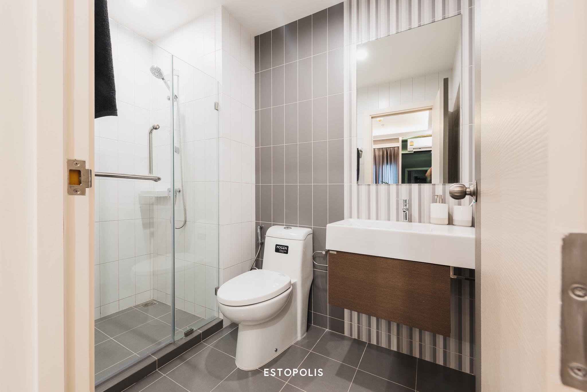 ในส่วนของห้องน้ำก็ให้มาครบเช่นกัน ทั้งอ่างล้างหน้า, กระจกเงา, โถสุขภัณฑ์, สายชำระ, ที่แขวนทิชชู่, ราวแขวนผ้า, ประตูกระจกกั้นระหว่างส่วนเปียกและส่วนแห้ง, ฝักบัวอาบน้ำ และชั้นวางของ เรียกได้ว่าเฟอร์นิเจอร์ที่ทางโครงการให้มานั้น ครบครัน ตอบโจทย์ทั้งคุณภาพ และความต้องการในสไตล์ของคนใช้ชีวิตคอนโดอย่างแท้จริง