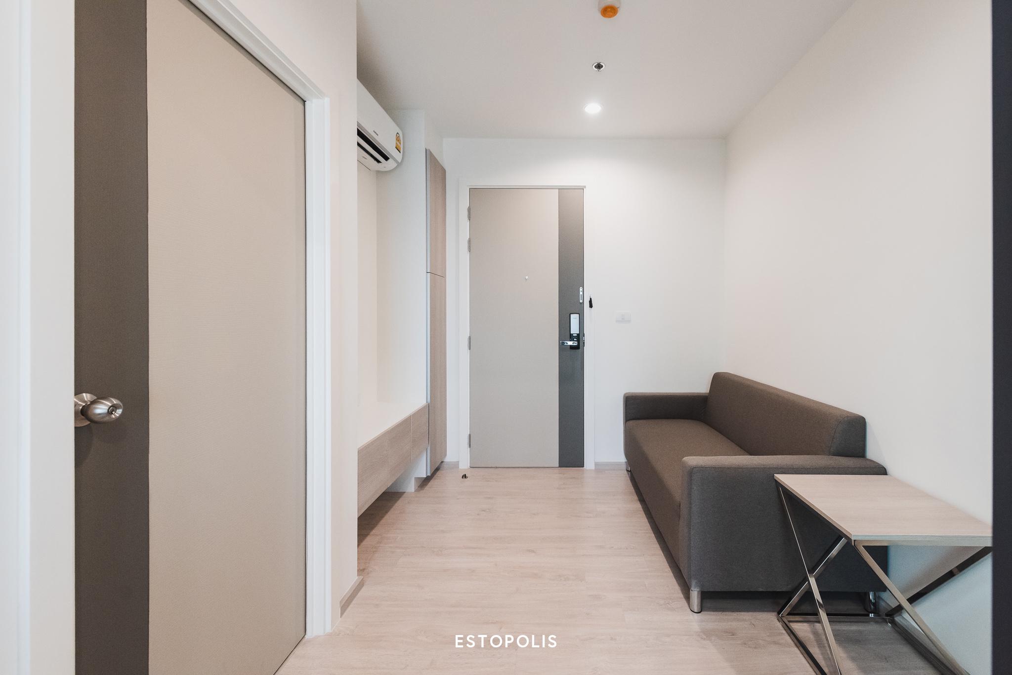 เมื่อเข้ามาภายในห้อง เราจะพบกับมุมนั่งเล่น living room ก่อนเป็นอันดับแรก โดยเฟอร์นิเจอร์ส่วนนี้จะประกอบด้วยชั้นวางทีวี, ตู้เก็บรองเท้า, โต๊ะเล็ก, โซฟา และเครื่องปรับอากาศ ส่วนกลอนประตูเป็น Digital Door Lock พร้อมติดตาแมวให้ด้วย