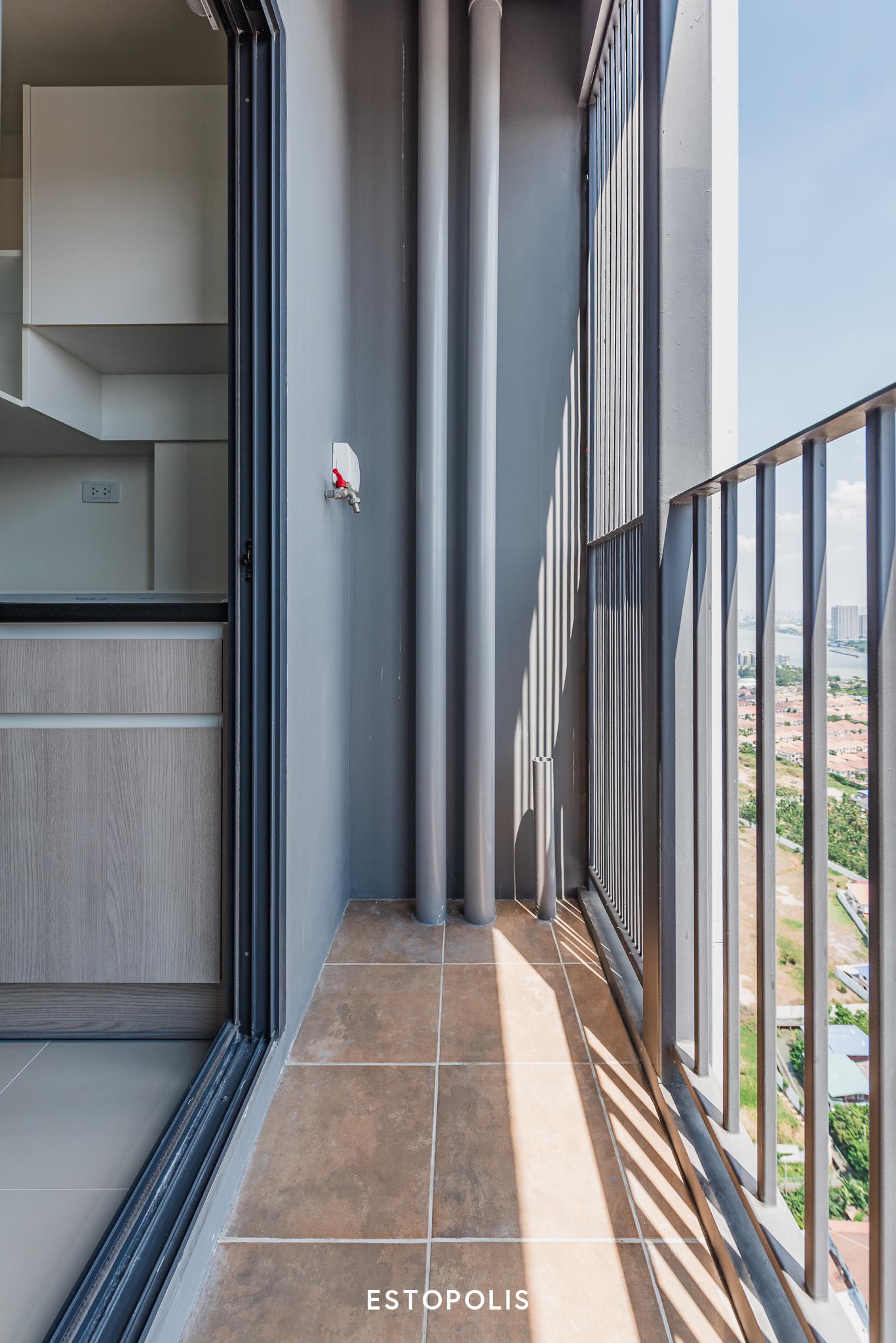 เชื่อมออกมายังระเบียง ที่เชื่อมต่ออยู่ติดกับห้องครัว ด้านนอกติดตั้งก๊อกน้ำพร้อมปลั๊กไฟให้ใช้งานได้สะดวก ซึ่งบริเวณนี้ก็กว้างพอให้วางเครื่องซักผ้าได้ทั้งแบบฝาหน้าและฝาบน