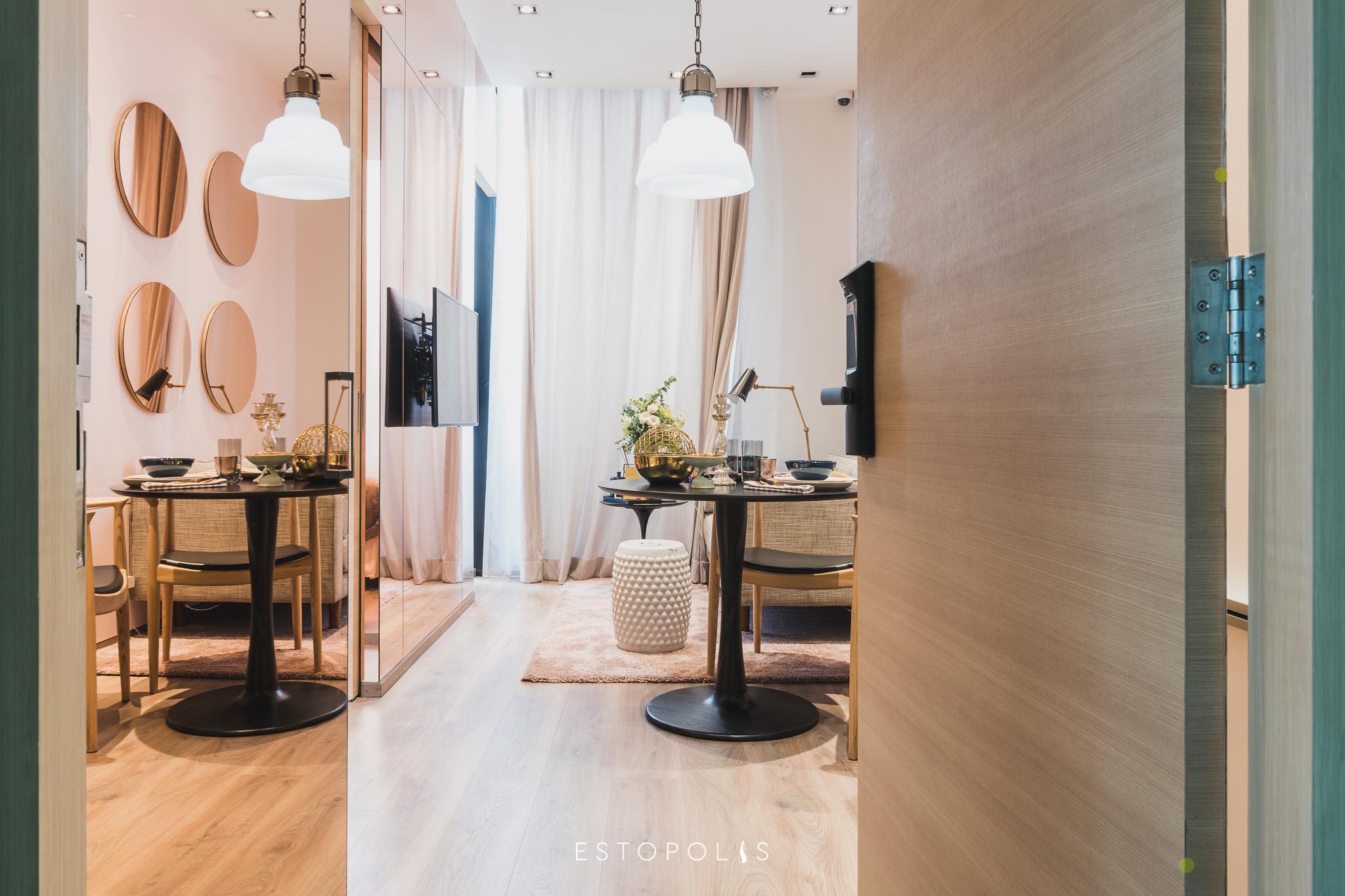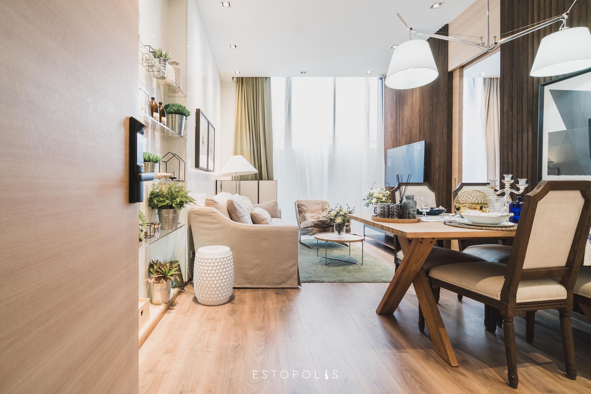 สแกนนิ้วปลดล็อกบานประตู แล้วเข้าไปสำรวจห้องไซส์ L พร้อมๆ กัน โดยสิ่งแรกที่เราเห็นยามเปิดเข้ามาจะเป็นมุมรับประะทานอาหาร ที่จัดวางโต๊ะทานข้าวกับส่วนของห้องนั่งเล่นให้อยู่ในบริเวณเดียวกัน เพื่อให้เราสามารถขยับขยาย ย้ายตัวไปไหนก็ได้อย่างอิสระ บนพื้นที่ของตัวเอง