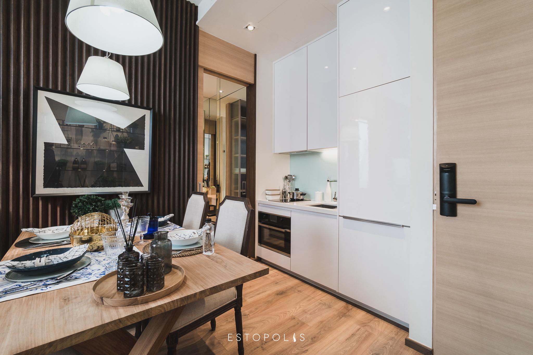 ขยับมาบริเวณหน้าประตูบานเลื่อนใกล้กับห้องน้ำ จะเป็นพื้นที่ของห้องครัว ซึ่งทาง โนเบิล สเตท 39 (Noble State 39) ได้บิลต์อินชุดครัวลามิเนตคุณภาพดี สีขาวสะอาดตา วางปิดด้วย Top หินสังเคราะห์ทนทานให้เช่นเดียวกับห้องไซส์ S โดยพื้นที่บริเวณนี้จะค่อนข้างกว้างขวาง เพียงพอให้เราสามารถใช้งานครัวได้อย่างสะดวกสบายและคล่องตัว หรือใครอยากมีช่วงเวลาพิเศษก็สามารถชวนคนพิเศษมาทำอาหารร่วมกันได้อีกด้วย