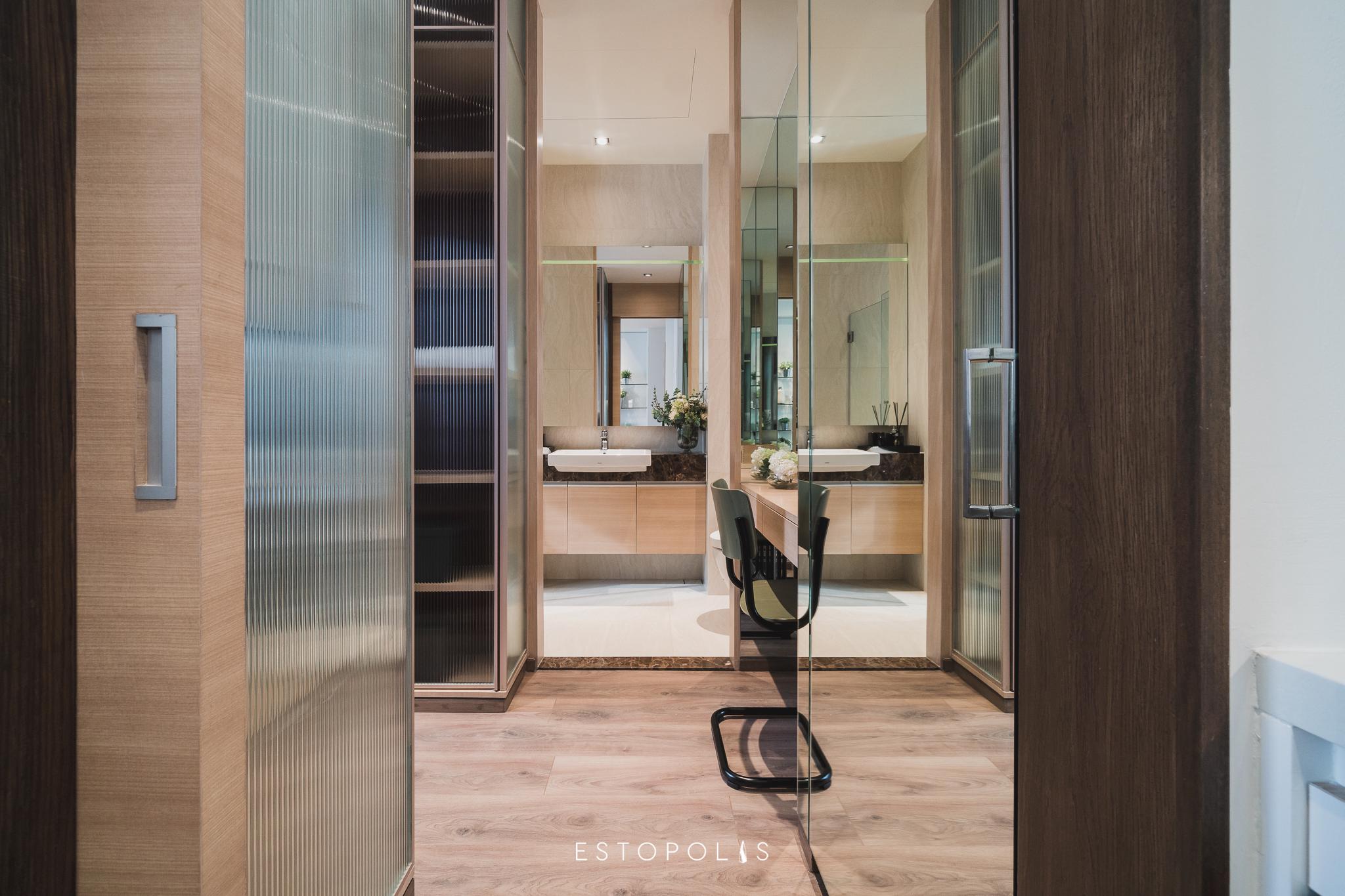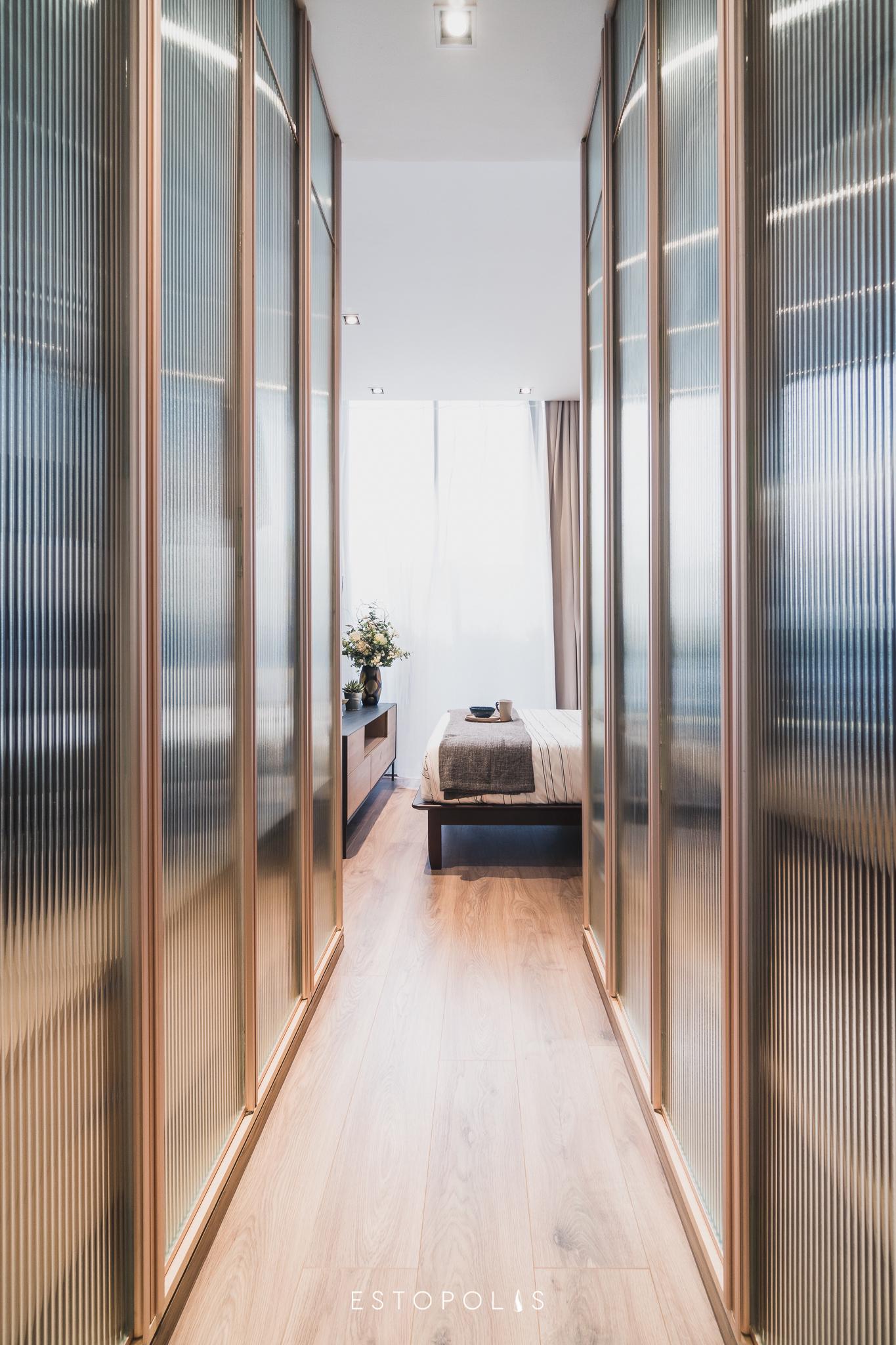 เมื่อก้าวออกจากห้องน้ำมา...ทางซ้ายมือจะเป็นตู้เสื้อผ้าบิลต์อินขนาดใหญ่ ปิดผิวด้านข้างด้วยลามิเนต ลายไม้ หน้าบานเป็นอะคริลิคลอน สีพิงก์โกลด์ รองรับการจัดเก็บเสื้อผ้าและข้าวของเครื่องใช้ได้อย่างจุใจ