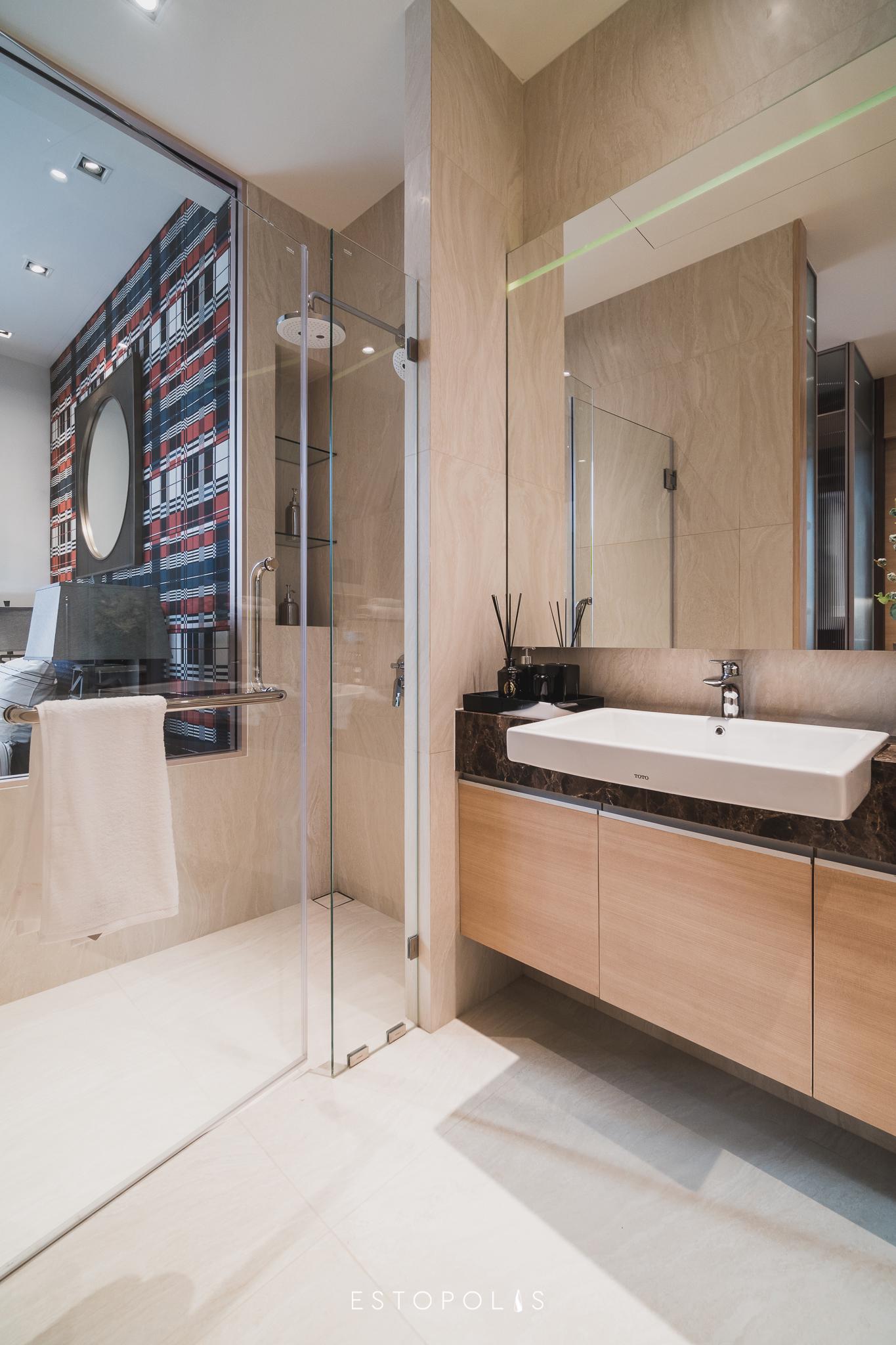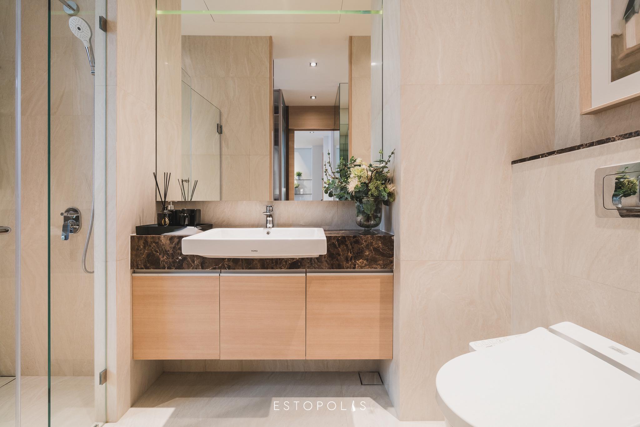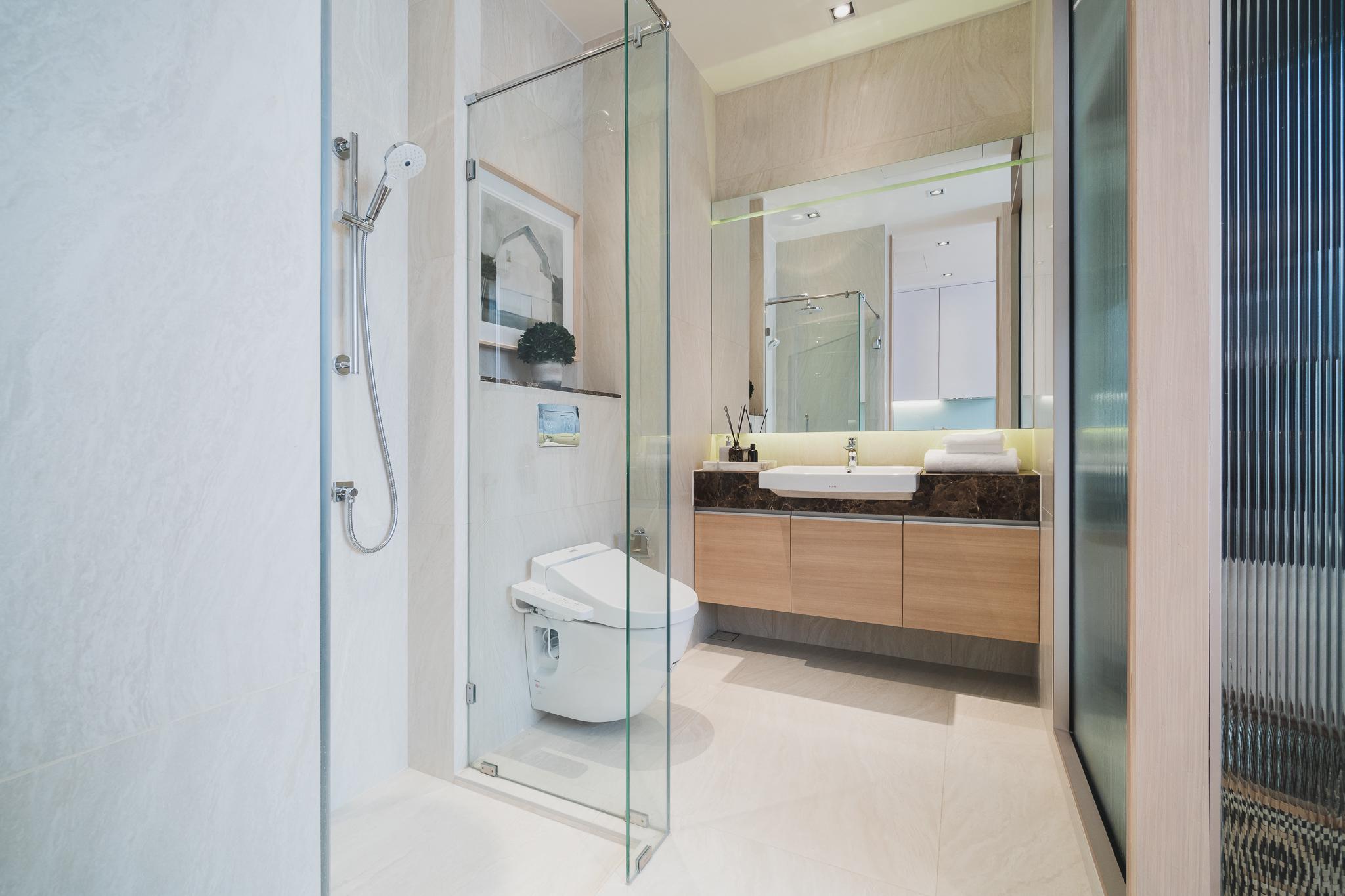 ภายในห้องน้ำประกอบไปด้วยส่วนของ Shower ที่กั้นด้วยกระจกใส แยกพื้นที่ส่วนเปียกและแห้งออกจากกัน บริเวณพื้นห้องน้ำจะปูกระเบื้องลายหินอ่อนดูสวยงาม ง่ายต่อการทำความสะอาด