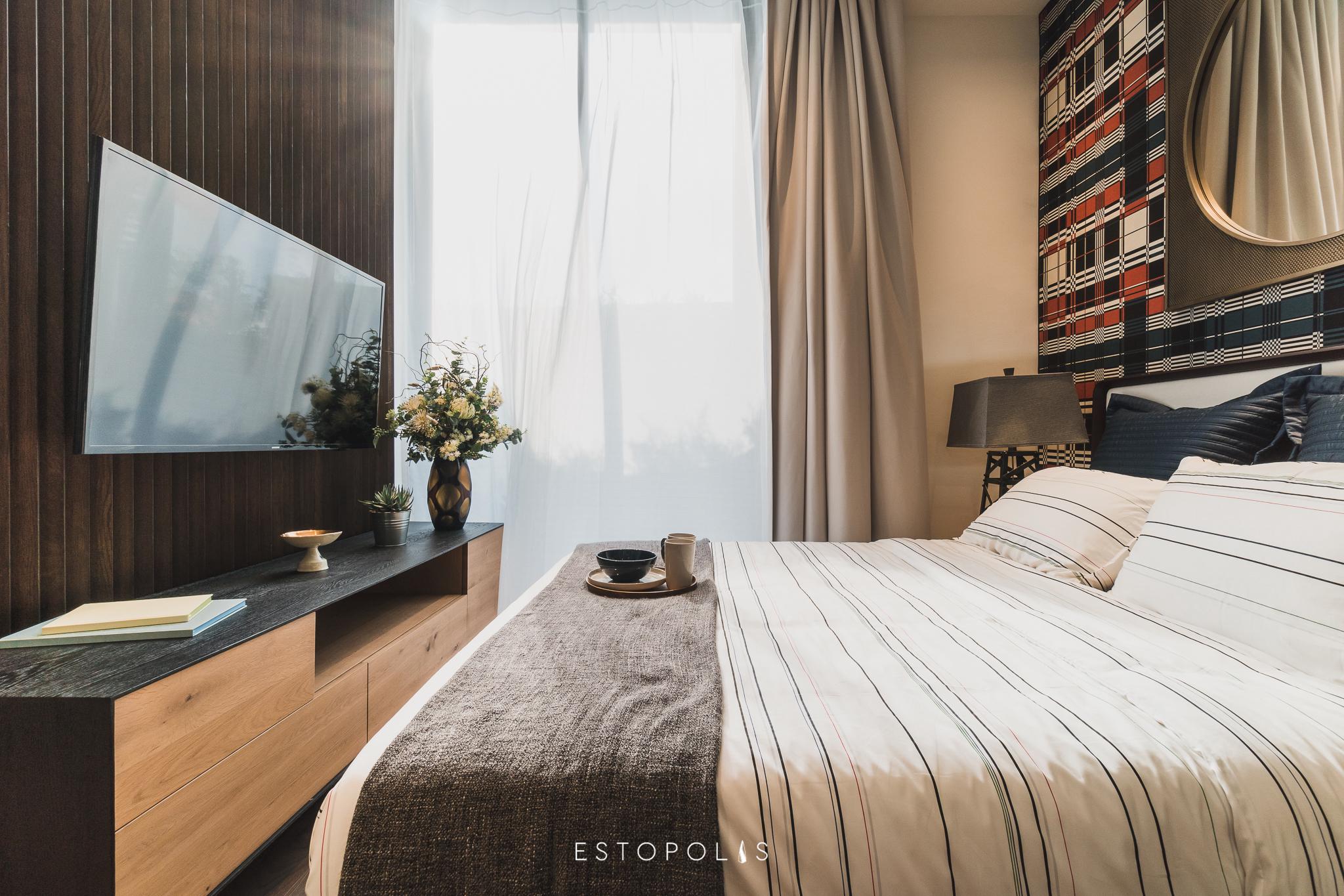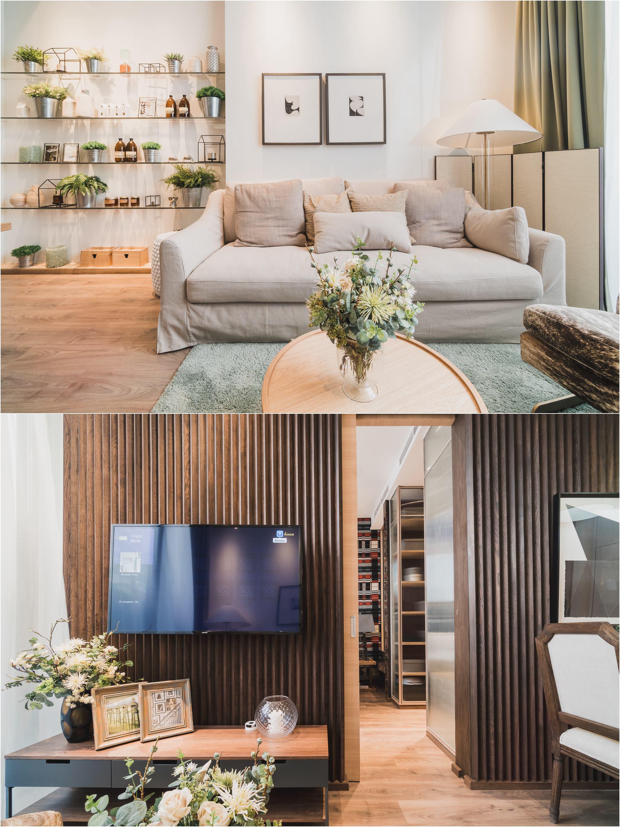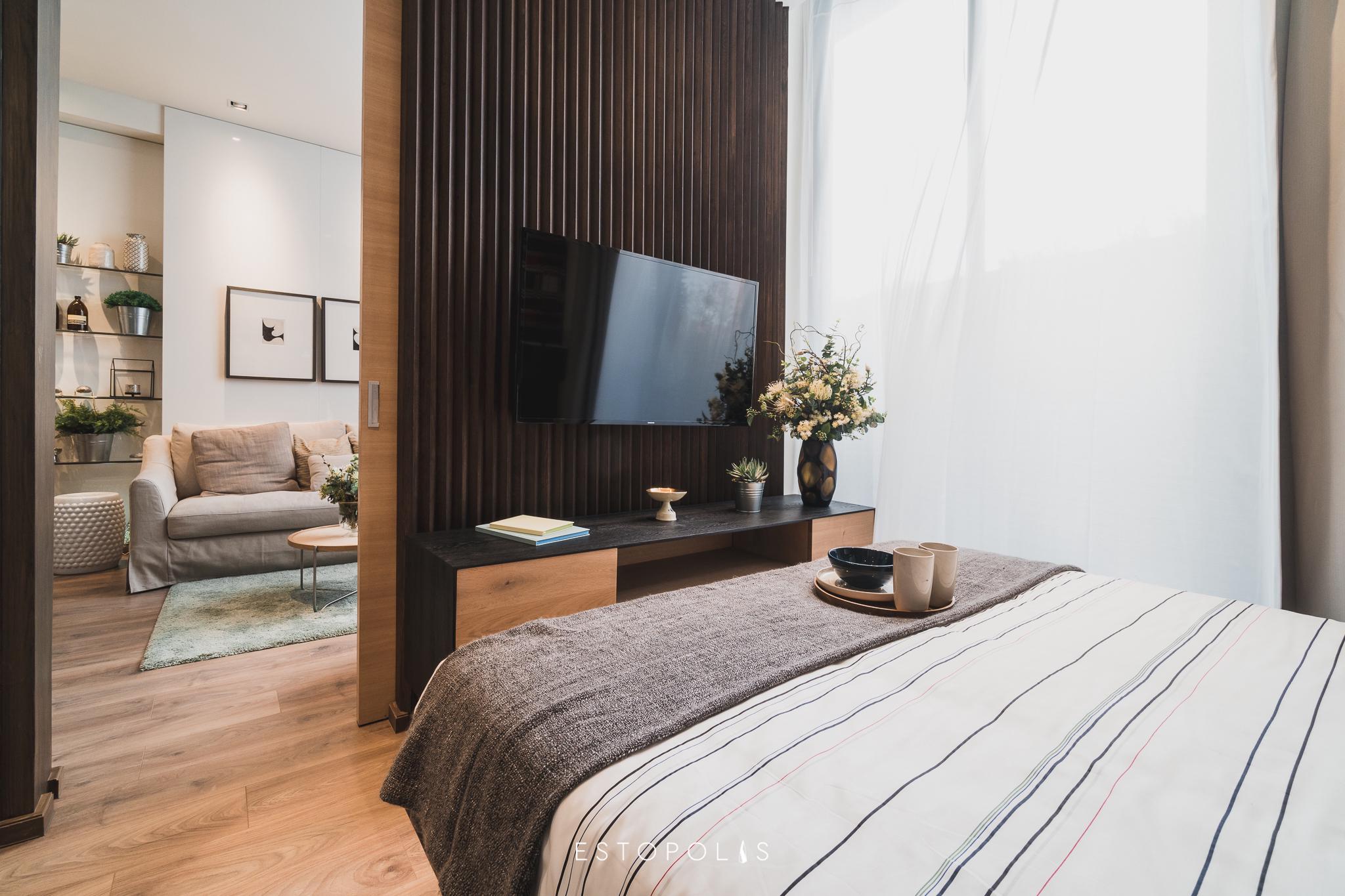 ส่วนใครที่เป็นสายซีรีส์ คอหนังคอละครแล้วล่ะก็ บริเวณปลายเตียงจะมีจุดติดตั้งทีวีแบบแขวนผนังไว้ให้เรียบร้อย ซึ่งเราก็จะเห็นทางเชื่อมเพื่อออกไปสู่ห้องนั่งเล่นได้เช่นกัน