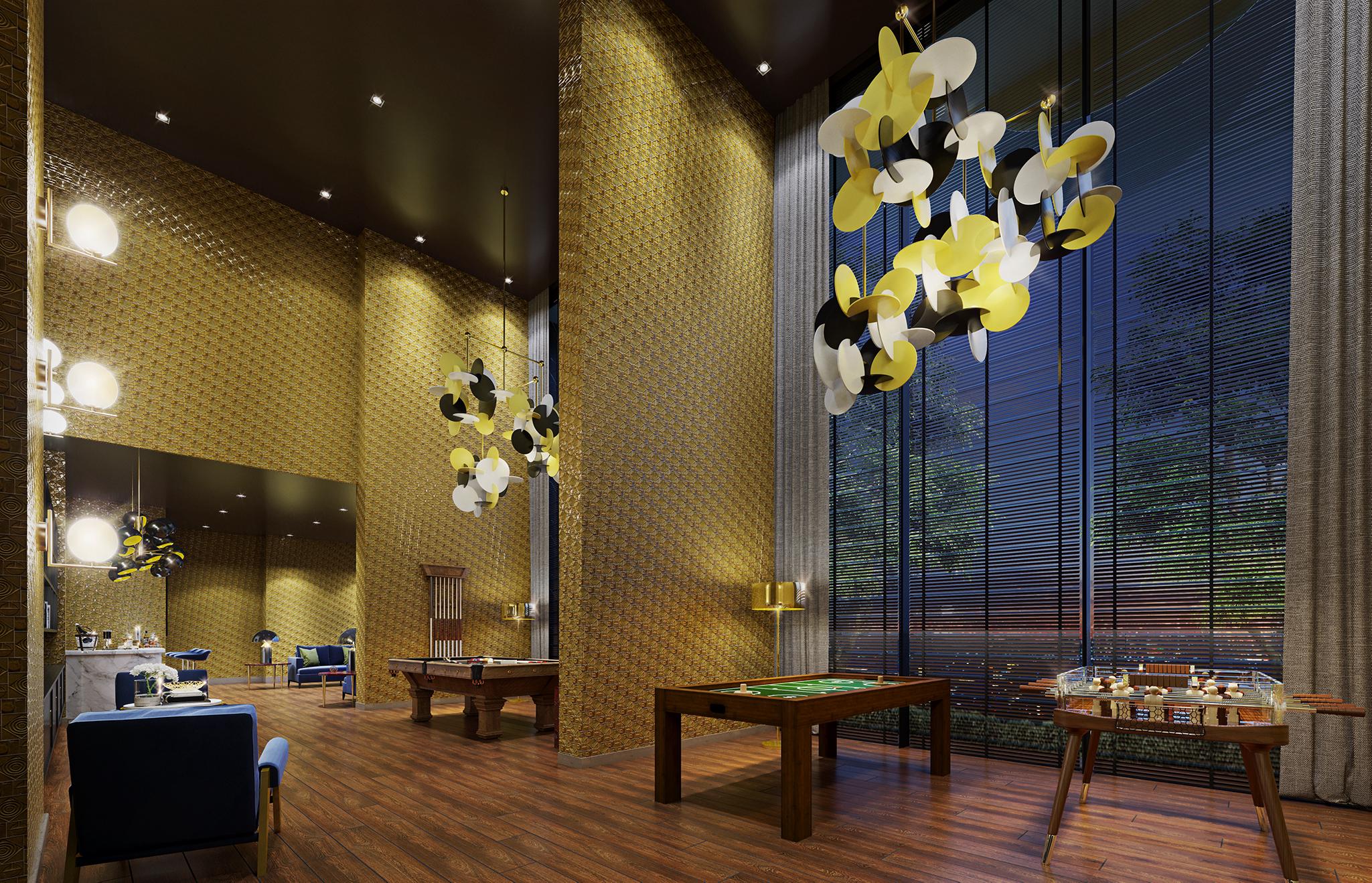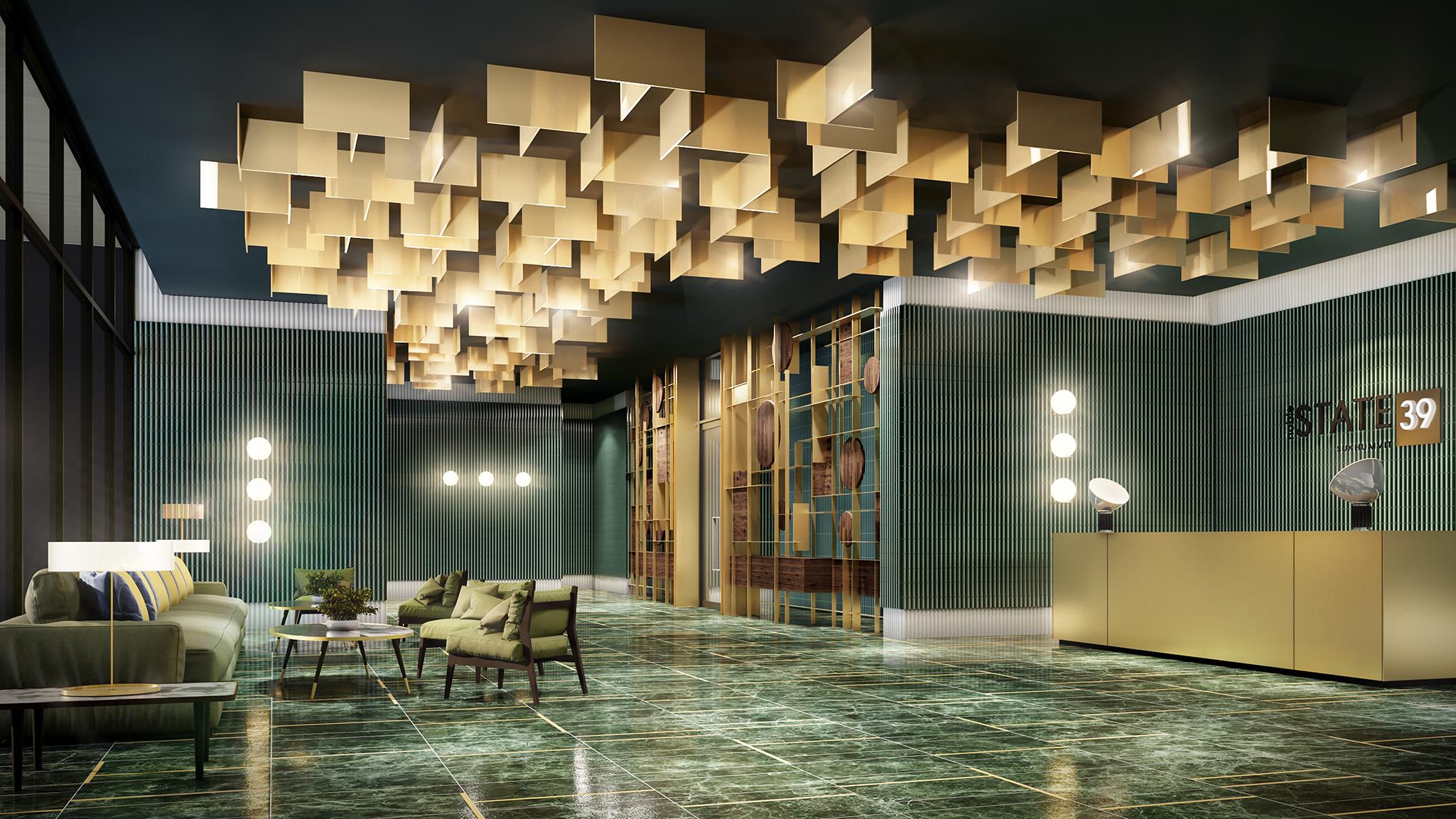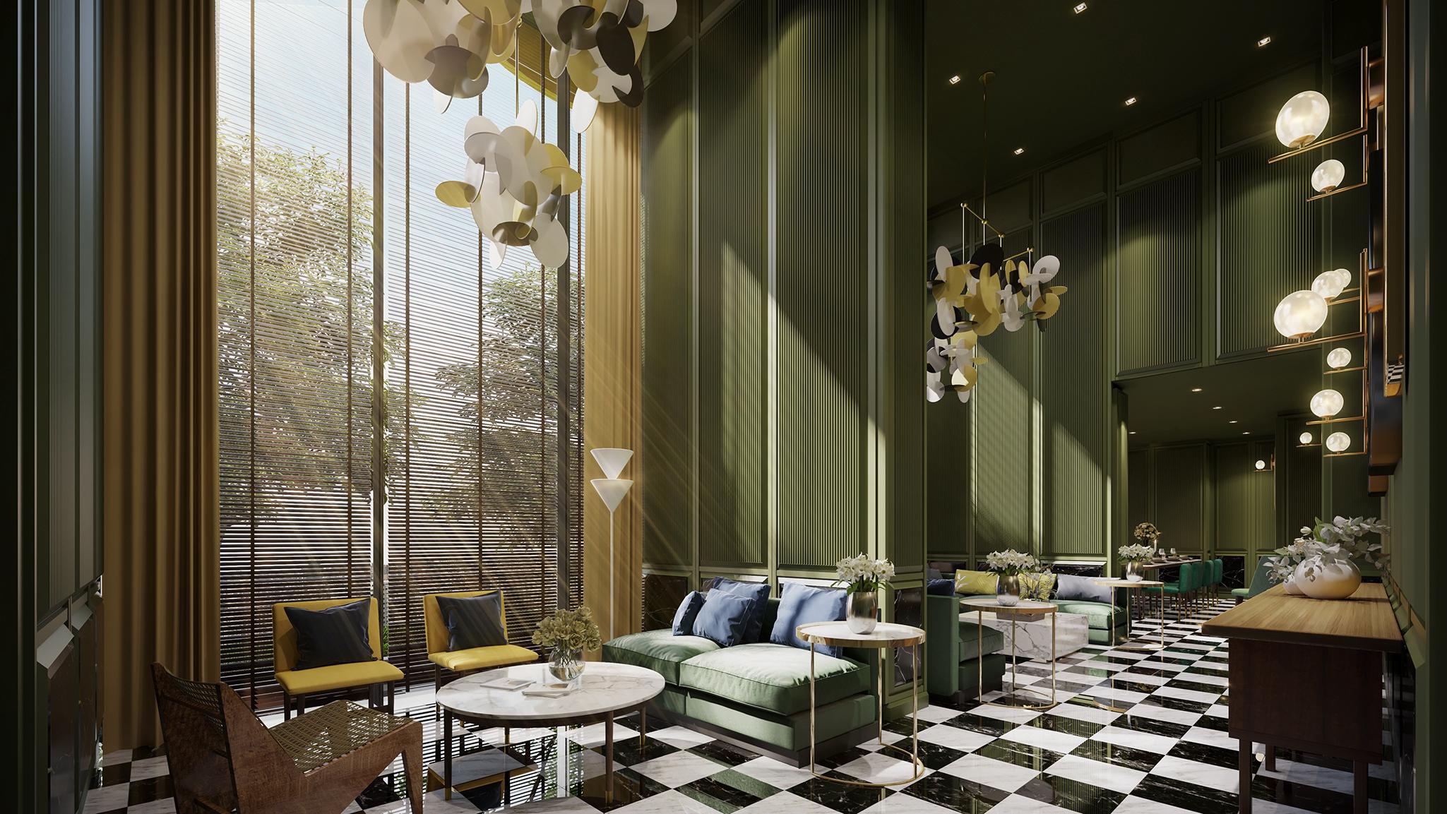 ตัวอย่างบรรยากาศภายในของโถง Lobby ที่ตกแต่งด้วยโทนสีเขียว รับกับบรรยากาศของสวนหย่อมด้านนอก บวกกับกับระยะฝ้าเพดานที่สูงกว่า 3.75 เมตร ยิ่งเสริมความโอ่โถง โปร่งโล่งได้อย่างลงตัว มีระดับ