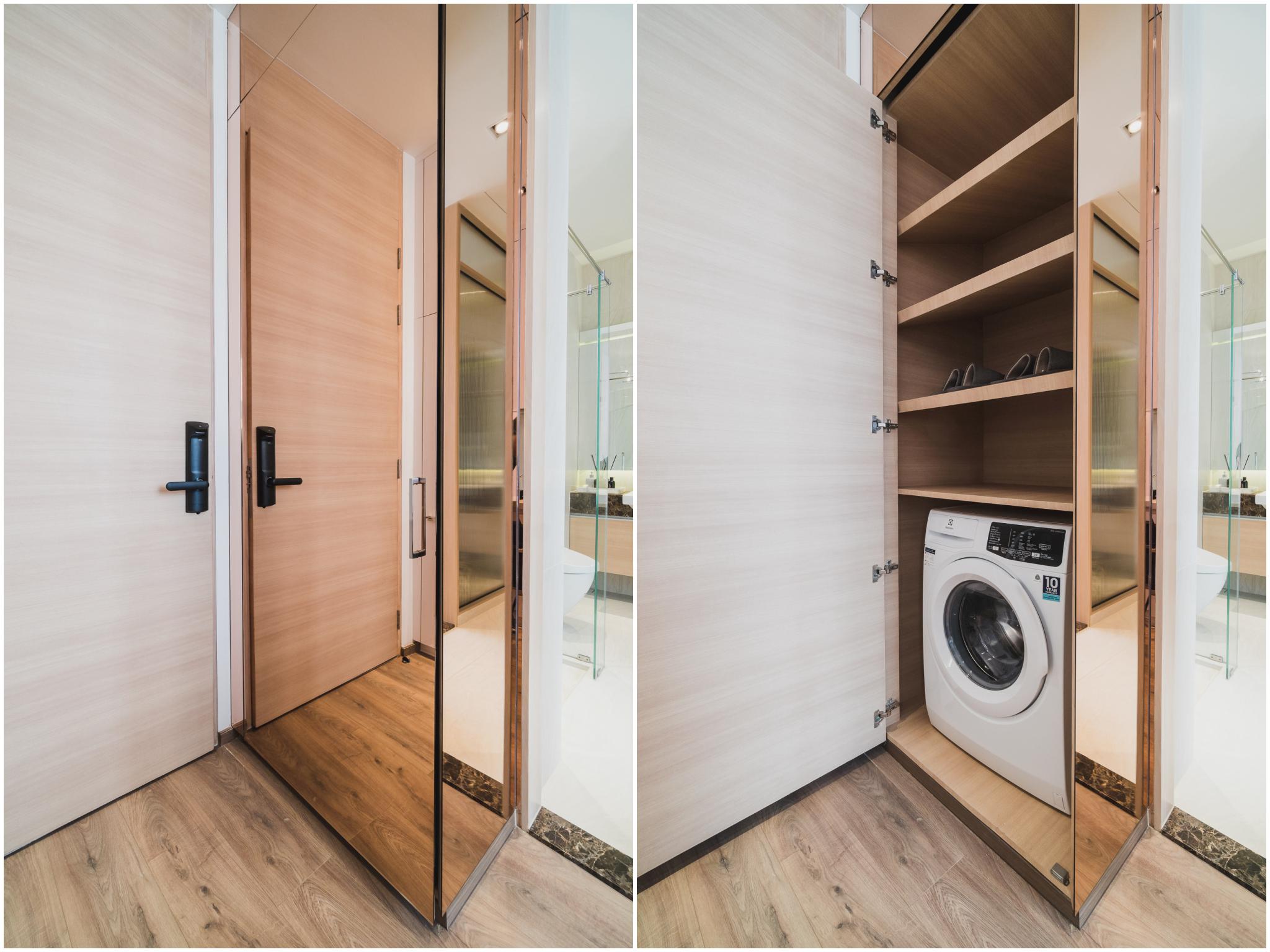 ถัดมาหลังประตูบานเลื่อนจะเป็นทางเชื่อมไปยังฝั่งของห้องน้ำ ซึ่งจะมีตู้บิลต์อิน (Built in) สำหรับใช้จัดเก็บรองเท้าและเครื่องซักผ้าฝาหน้าอยู่ทางด้านขวามือ ตั้งไว้คั่นกลางระหว่างพื้นที่ครัวกับโต๊ะเครื่องแป้งช่วยแบ่งพื้นที่การใช้สอยได้อย่างแนบเนียน
