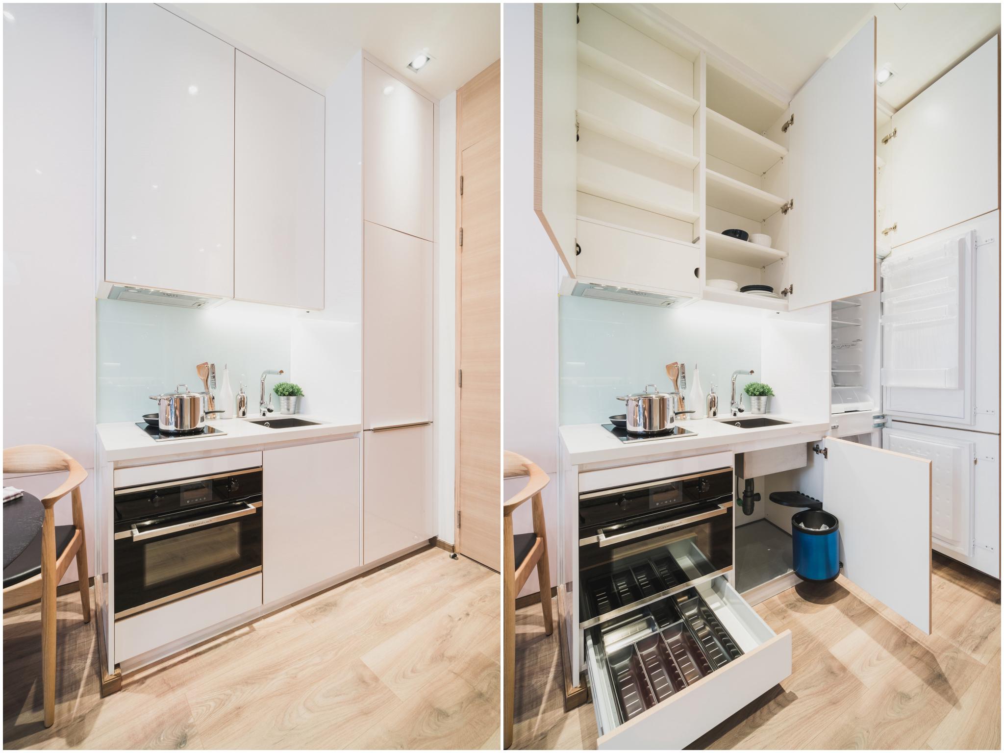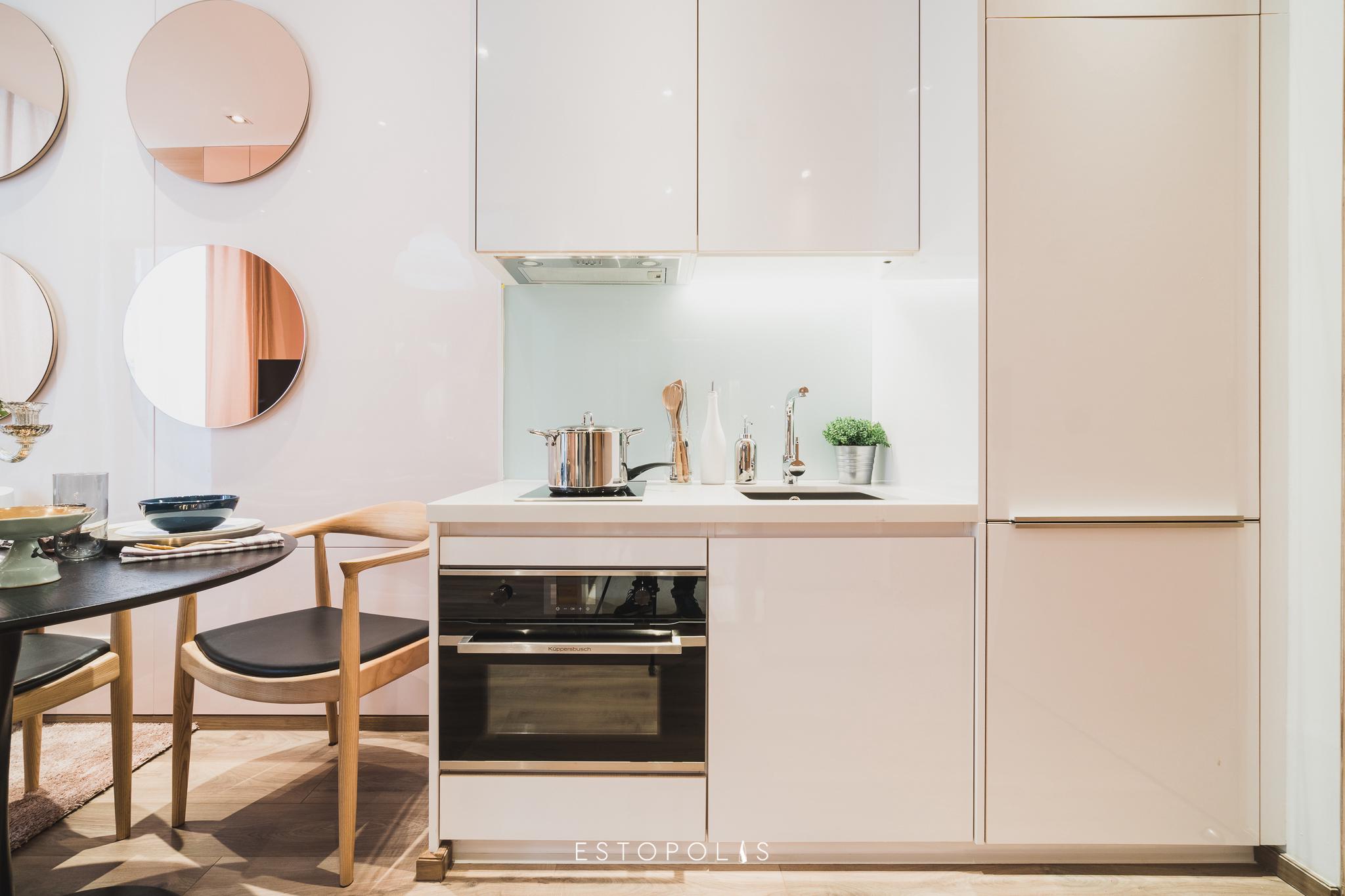 เมื่อท้องเริ่มร้องก็ต้องขยับมาที่โซนครัว...แต่ก่อนจะลงมือทำอาหาร เราก็ขอสำรวจพื้นที่บริเวณนี้กันเสียหน่อย โดยพื้นที่ครัวของห้องไซส์ S แต่ไม่ได้เล็กอย่างชื่อจะอยู่ติดกับประตูทางเข้า มีชุดครัวบิลต์อินให้เรียบร้อยสวยงามสไตล์ Modern Luxury พร้อมด้วยเคาน์เตอร์ครัว, ตู้เก็บของ, Backsplash กันน้ำมันกระเด็น และลิ้นชักที่ทำจากลามิเนตคุณภาพดี บริเวณหน้าบานเป็นลามิเนตพื้นผิวไฮกลาสดูเงางาม สะอาดตา
