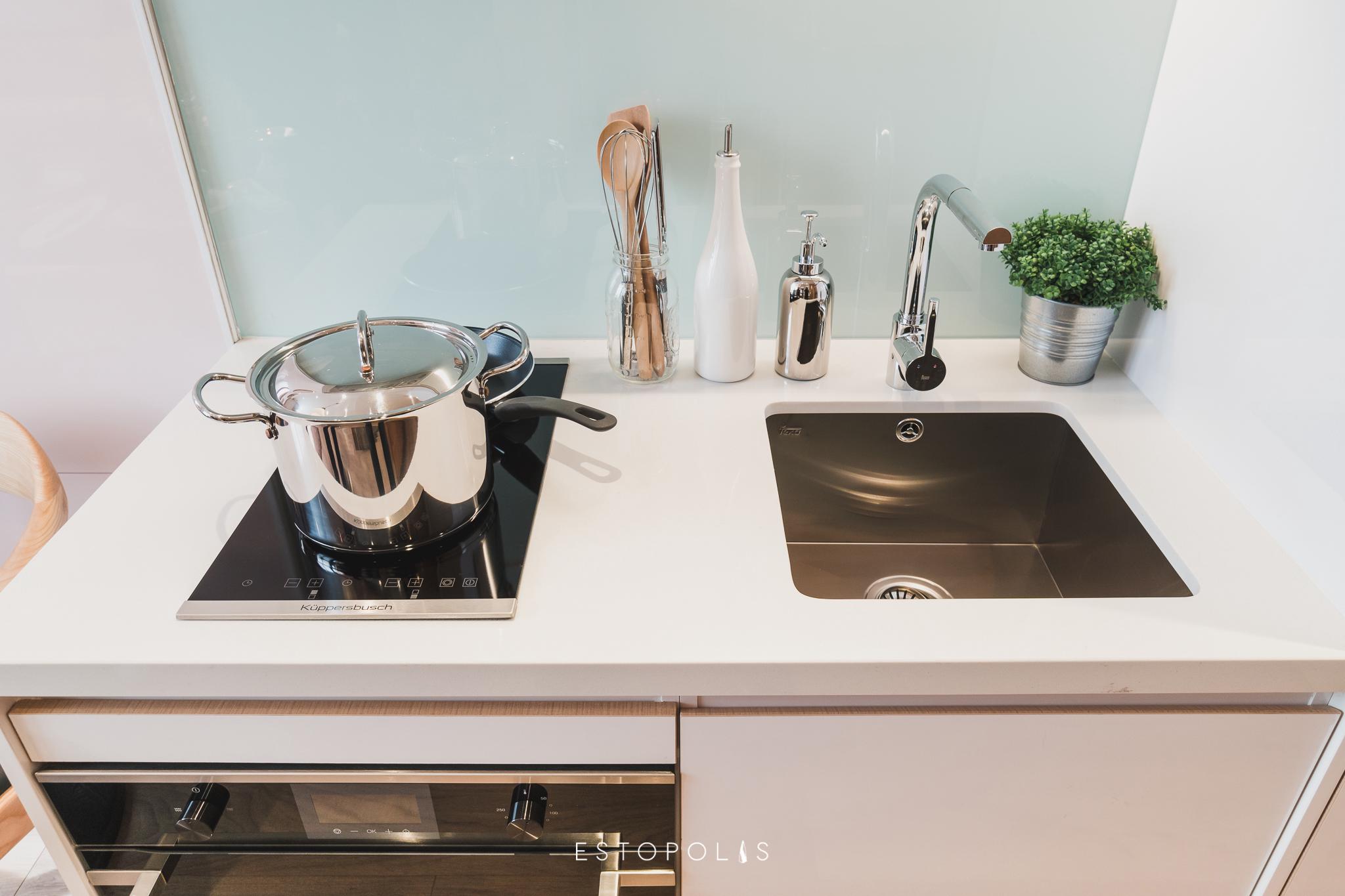 Top ครัวเป็นหินสังเคราะห์ ทนน้ำและความชื้นได้เป็นอย่างดี ทางฝั่งซ้ายจะเป็นส่วนของเตาอบและเตาไฟฟ้า ขยับมาฝั่งขวาจะเป็นส่วนของซิงก์ล้างจาน พร้อมตู้เก็บของและถังขยะด้านใต้
