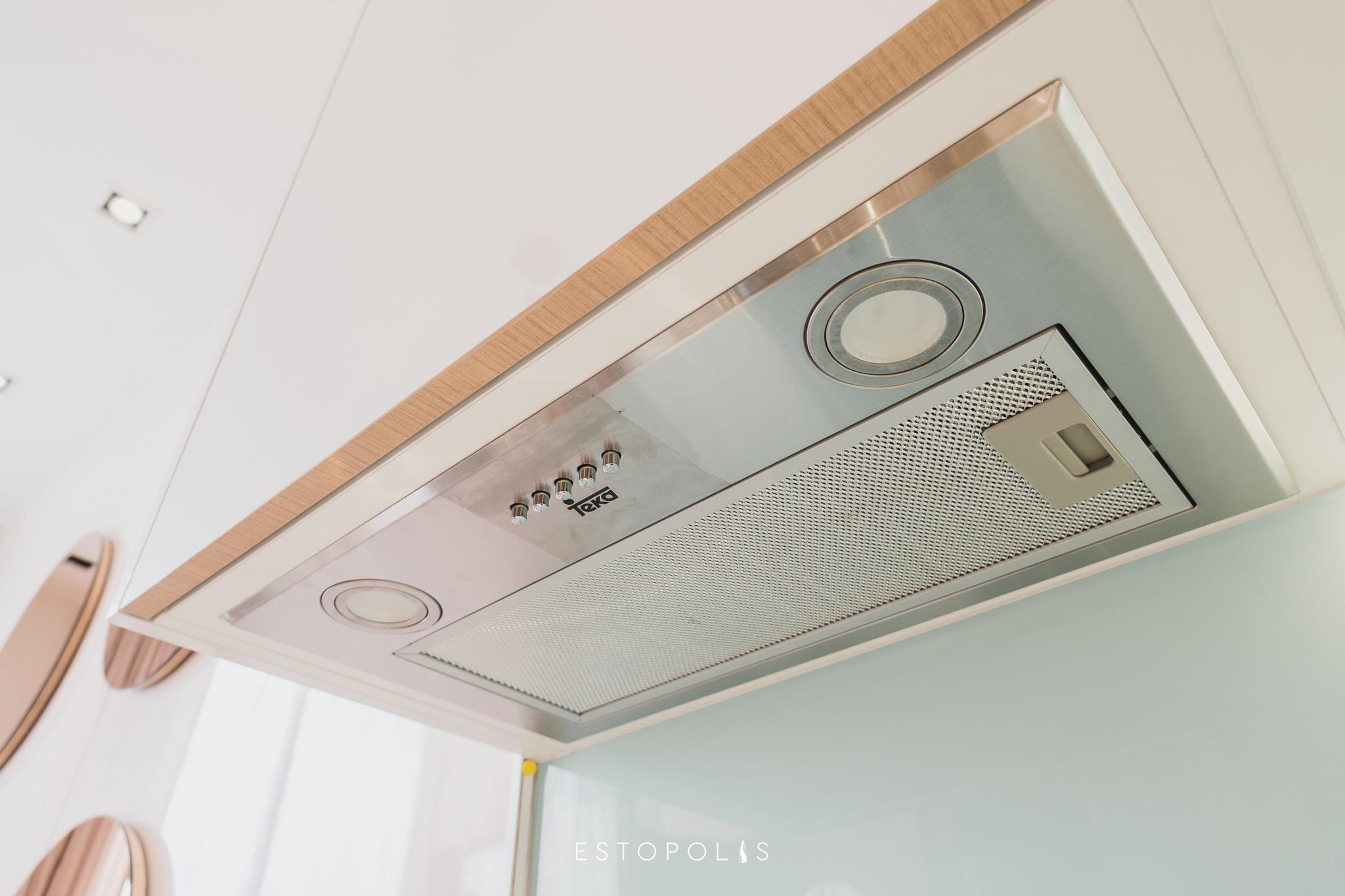 แม้พื้นที่ครัวจะมีขนาดกะทัดรัดเหมาะสำหรับการอยู่คนเดียว แต่รับรองว่าอุปกรณ์เครื่องใช้ไฟฟ้าที่ทาง Noble State 39 (โนเบิล สเตท 39) มอบให้นั้นครบครัน และมีคุณภาพแน่นอน เริ่มจากด้านบนของเตาไฟฟ้าบริเวณพื้นที่ประกอบอาหาร ที่ได้ติดตั้งระบบดูดควันปล่อยนอกอาคารจากแบรนด์ Teka ไว้ให้ เราจึงไร้กังวลเรื่องกลิ่นไม่พึงประสงค์ภายในห้องไปได้เลย