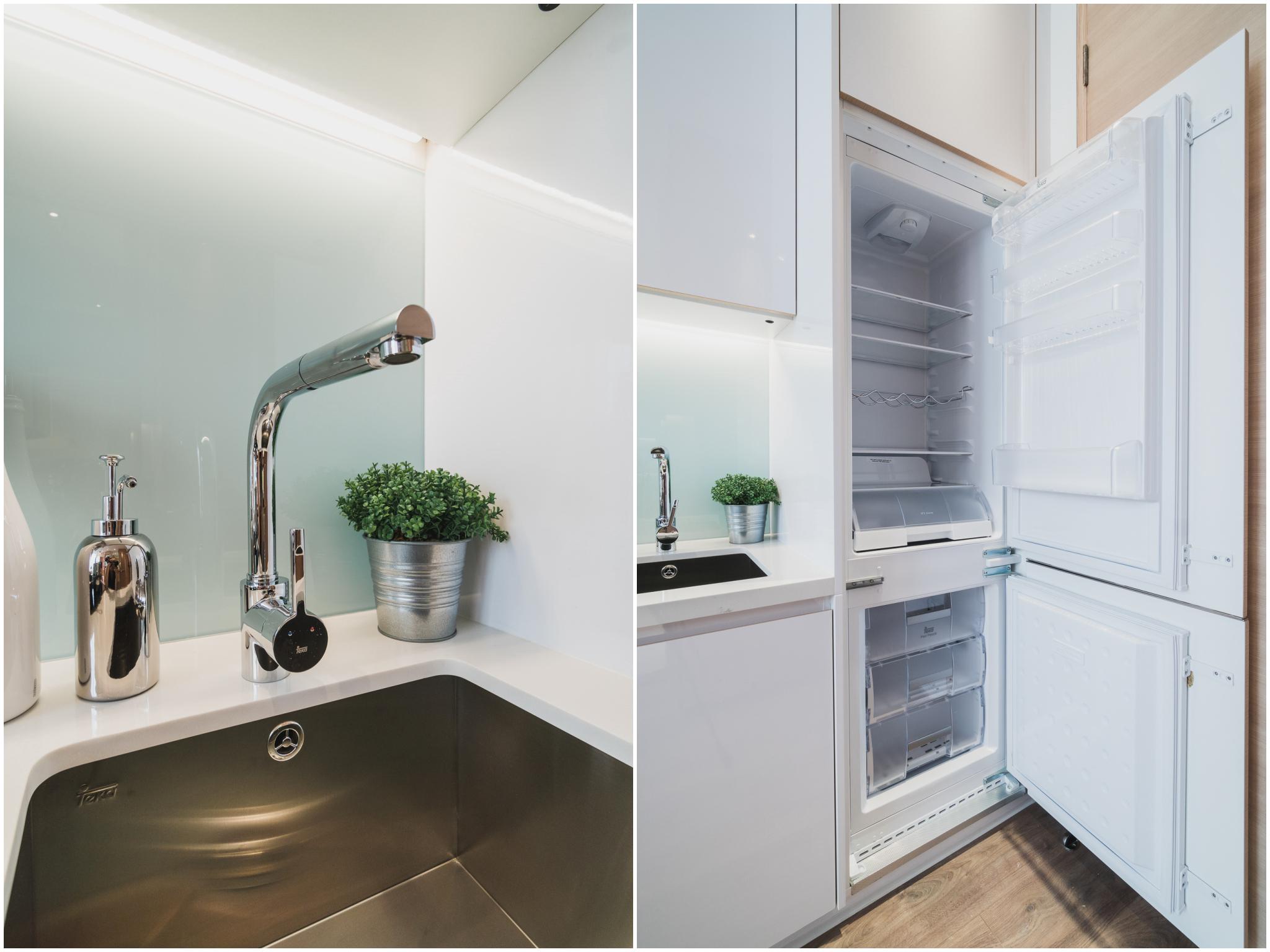 ส่วนทางฝั่งขวาจะเป็นซิงก์ล้างจานพร้อมก๊อกและตู้เย็นบิลต์อินจากแบรนด์ Teka ตามลำดับ โดยความพิเศษของก๊อกน้ำจาก Teka จะอยู่ตรงที่สามารถดึงส่วนหัวออกจากคอของก๊อกได้ เราจึงหมดปัญหาเรื่องน้ำกระเด็น ช่วยให้พื้นที่บริเวณ Top ครัวสะอาดกว่าที่เคย