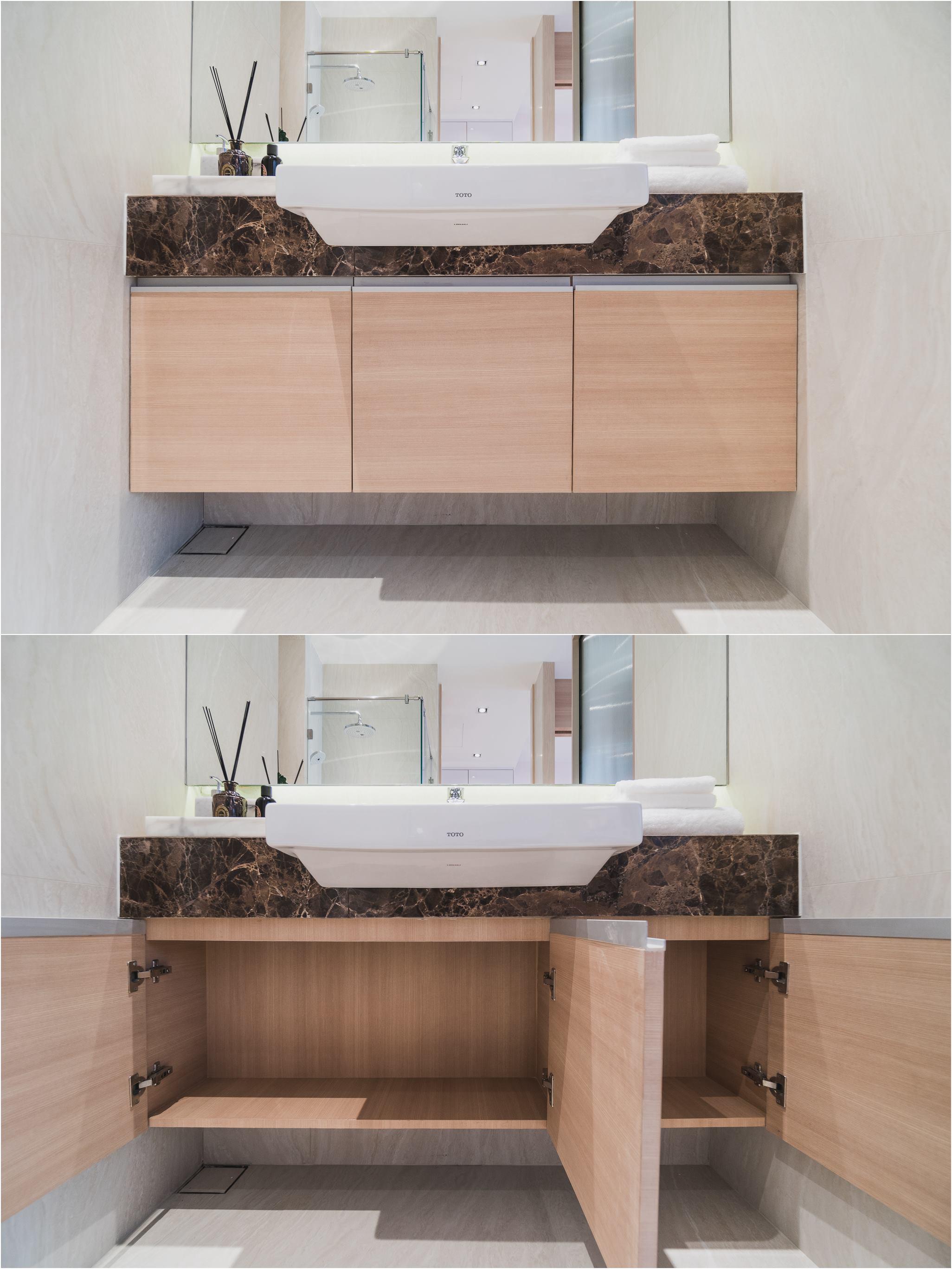 อ่างล้างหน้าสีขาวถูกวางบน Top หินอ่อนสีเข้ม (ตามรูปหรือเทียบเท่า) ที่ให้ความแตกต่างอย่างลงตัว ดูมีคลาส พร้อมด้วยเคาน์เตอร์เก็บของบิลต์อิน (Built in) ลามิเนต ที่รองรับการติดตั้งระบบทำน้ำอุ่นไว้ด้านใน โดยสุขภัณฑ์ทุกชิ้นที่ทางโครงการ Noble State 39 (โนเบิล สเตท 39) เลือกใช้จะเป็นแบรนด์ TOTO ทั้งหมด