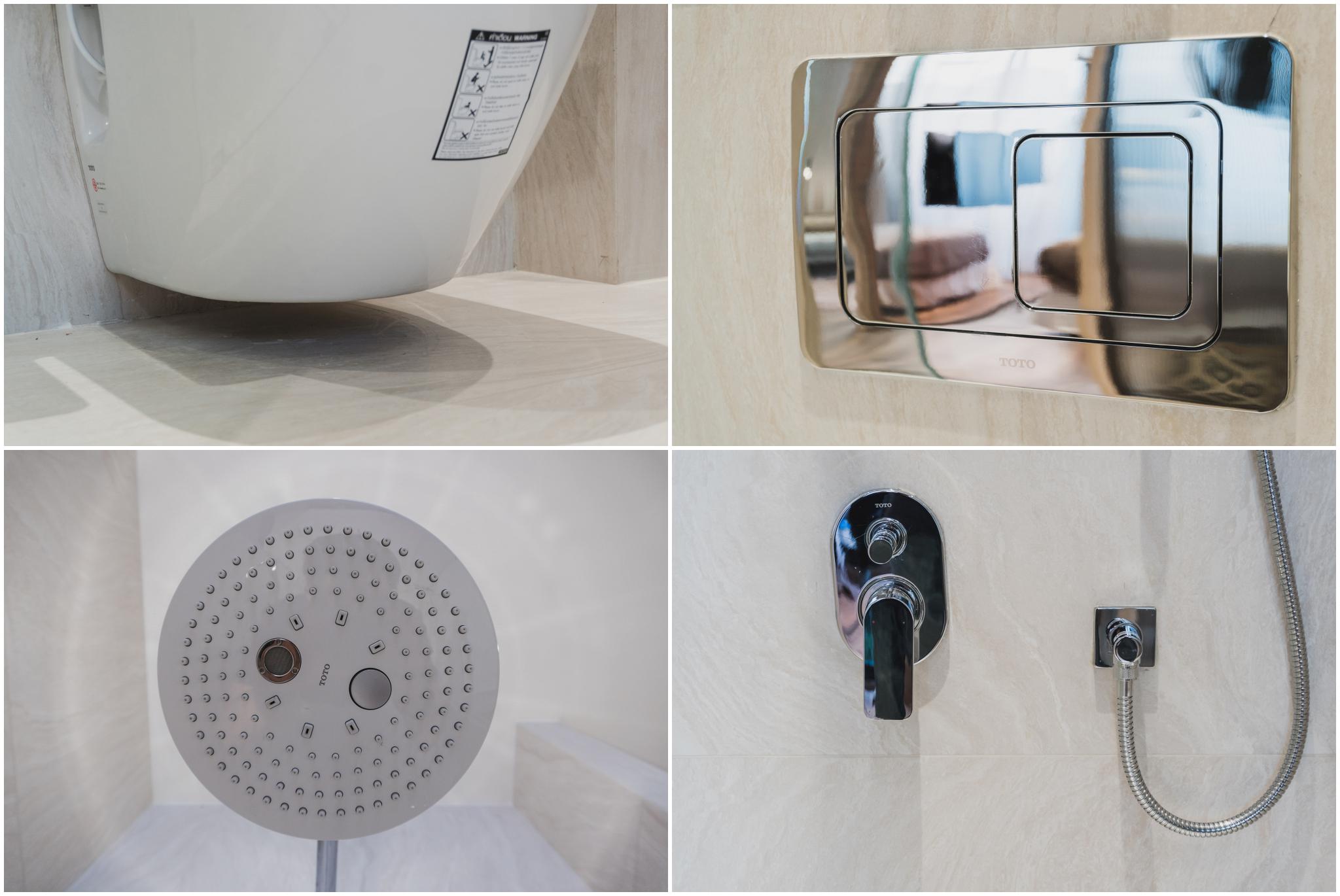 โดยทางโครงการจะวางตำแหน่งอ่างล้างหน้าไว้ตรงกลางตรงกับประตูห้องน้ำพอดิบพอดี เพื่อความสะดวกยามใช้งาน ส่วนขวามือจะเป็นที่ตั้งของโถสุขภัณฑ์พร้อมสายชำระ และอุปกรณ์ครบชุดจากแบรนด์ TOTO แล้วค่อยให้เราเข้าไปชำระความเหนื่อยล้ากันที่ห้องอาบน้ำฝั่งซ้ายมือ