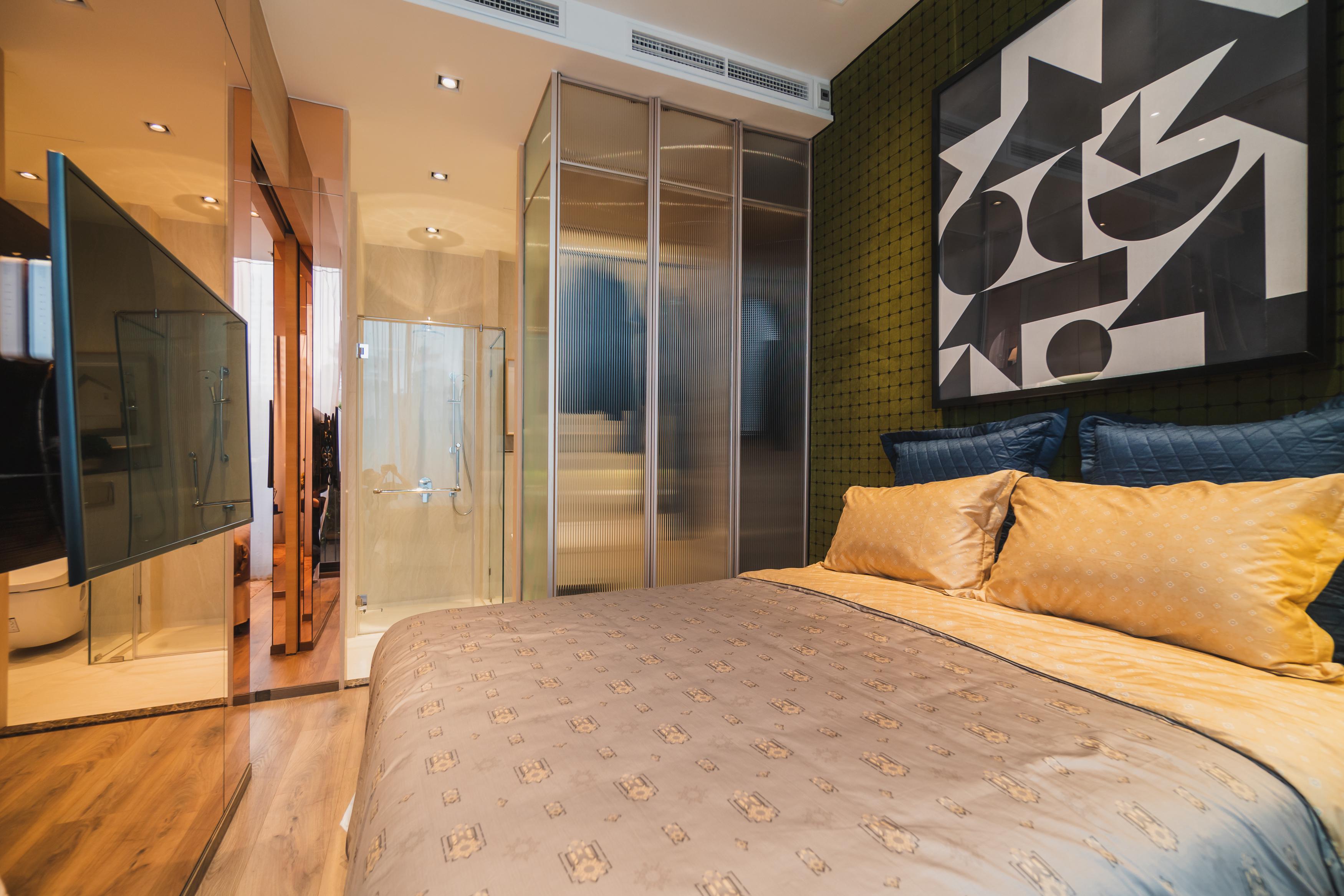 ห้องนอนโล่งกว้างให้เราวางเตียงขนาดใหญ่แบบในห้องตัวอย่างได้สบายๆ ไม่ว่าจะตกแต่งแบบไหนก็รองรับการพักผ่อนได้เป็นอย่างดี ปลายเตียงมีจุดติดตั้งทีวีแบบแขวนผนัง ส่วนบริเวณระเบียงจะติดกระจกสูง 3.2 เมตร แบบเดียวกับในห้องนั่งเล่น ให้เราเปิดออกไปชมวิวเมืองรอบๆ อาคารกันอย่างมีความสุข