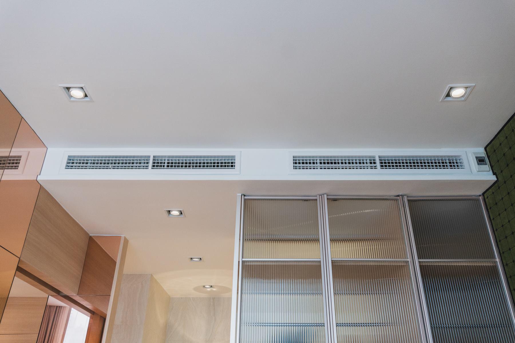 เมื่อมองขึ้นไปตรงเพดานห้อง ทางโครงการจะมีพื้นที่สำหรับการติดตั้งแอร์แบบฝังฝ้าไว้ให้เราใช้เพิ่มความสุข พักผ่อนอยู่ท่ามกลางบรรยากาศเย็นสบาย ส่วนระบบไฟจะเป็นแบบดาวน์ไลท์ (Downlight) เพื่อความสวยงามและทำให้ห้องของเราดูอบอุ่น น่าอยู่อาศัย