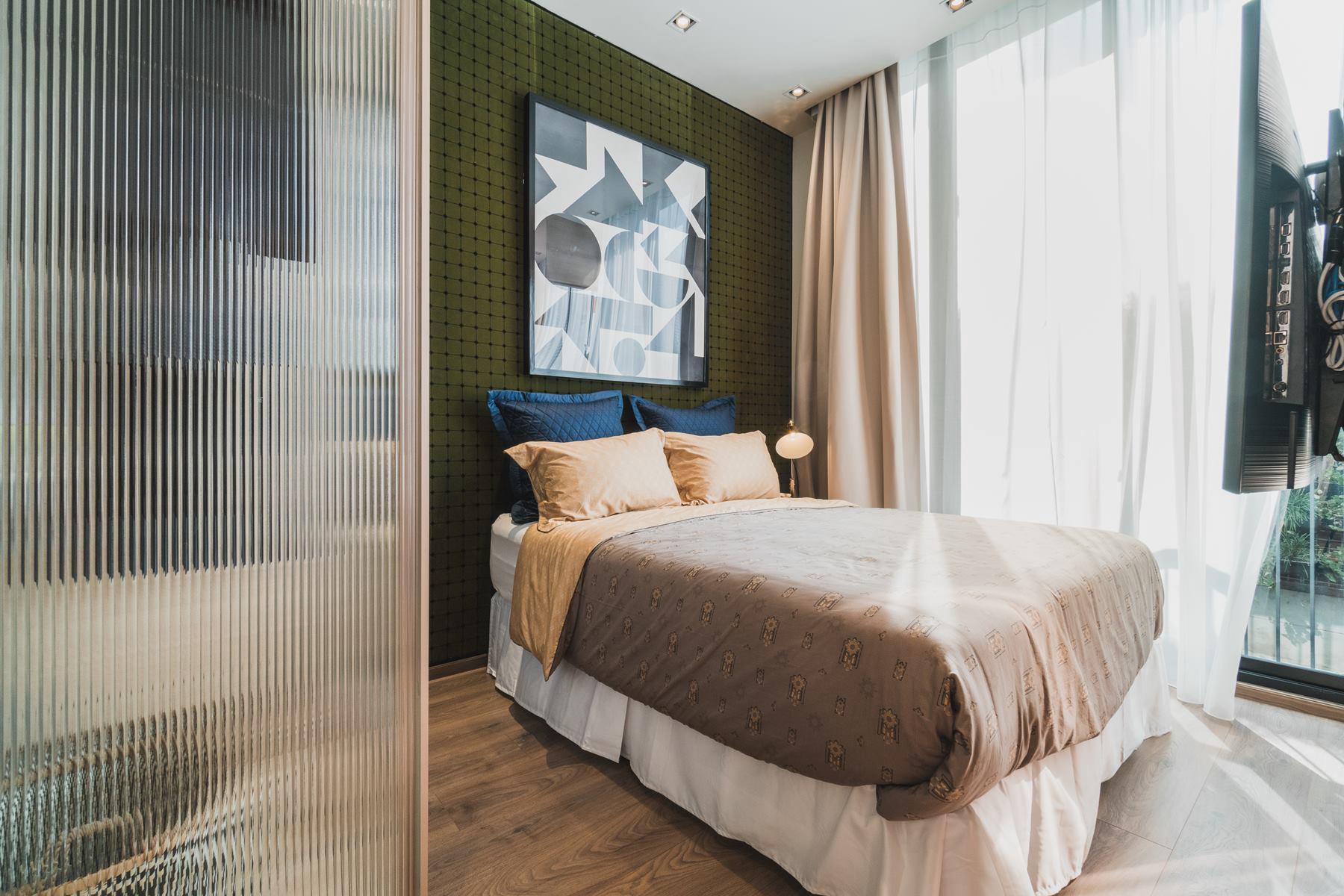 แค่เคลื่อนกายต่อเล็กน้อย เราก็ได้เข้าสู่พื้นที่พักผ่อนหลักของห้องแล้ว โดยห้องนอน Type นี้จะมีพื้นที่ค่อนข้างกว้างขวาง ให้เราสามารถเดินเข้าออกได้สบายๆ แม้จะตั้งเตียงขนาดควีนไซส์ไว้กลางห้องแล้วก็ตาม ถัดไปด้านในสุดจะเป็นกระจกใสสูง 3.2 เมตร เหมือนกับห้องไซส์ S ไว้ให้เรานอนชมวิวเมืองกันแบบเต็มตา เรียกว่า...ช่วยสร้างบรรยากาศดีๆ ให้การพักผ่อนได้ทุกๆ วัน