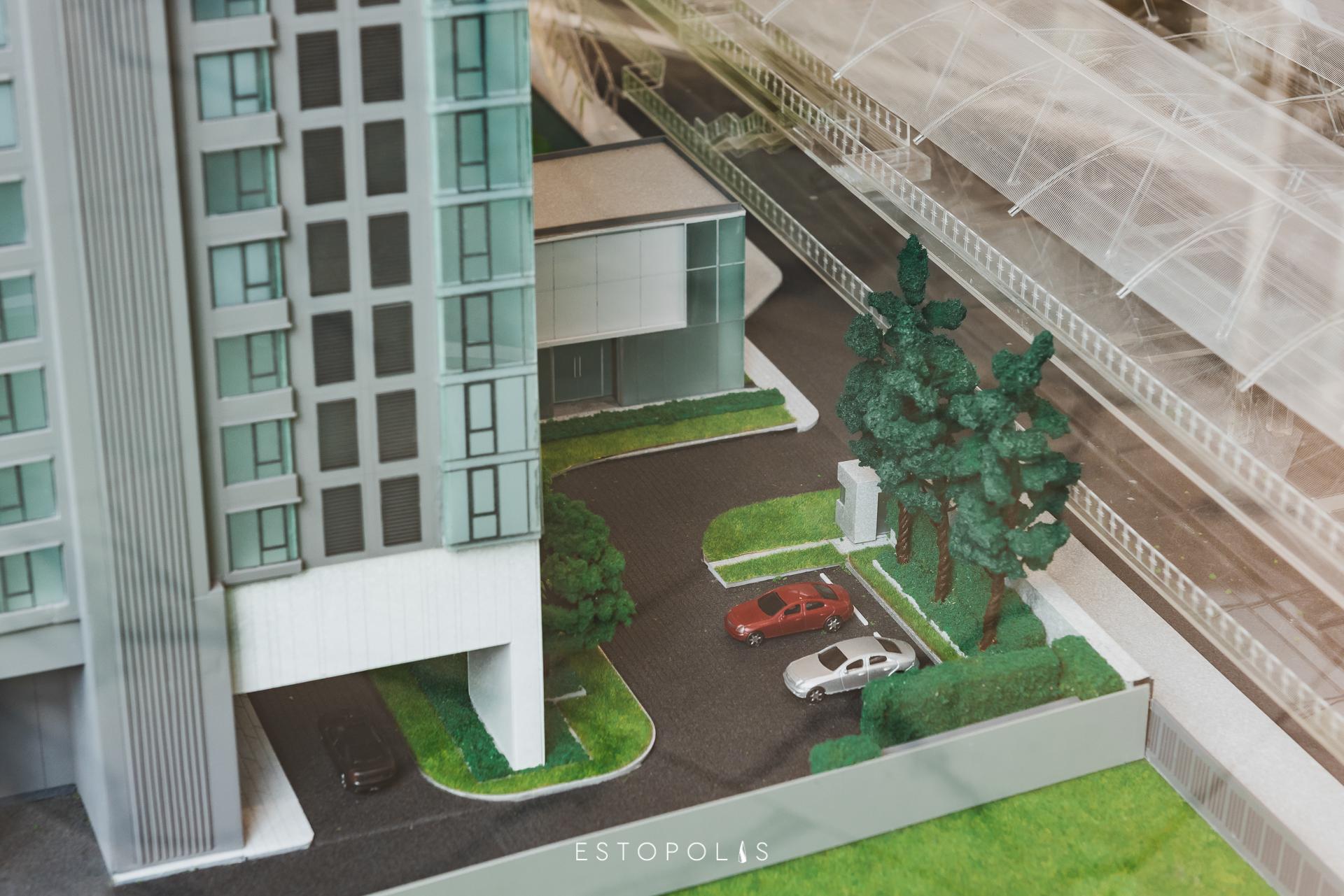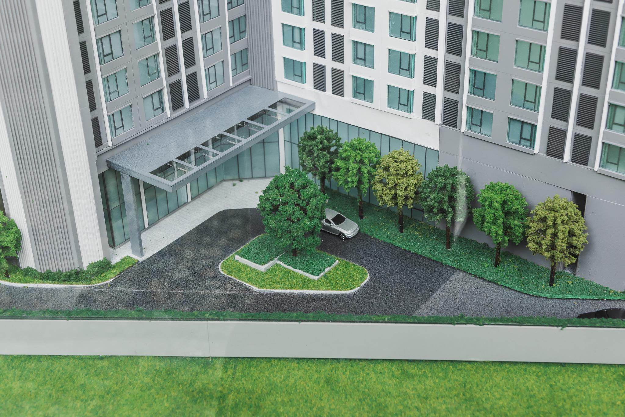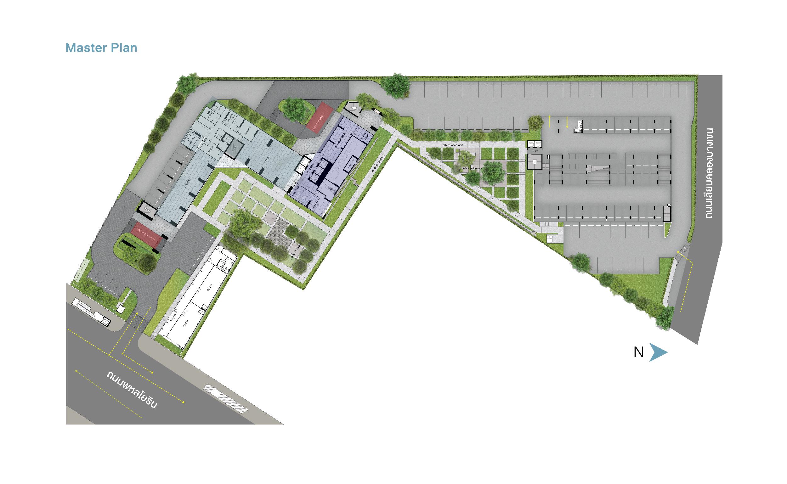 สำหรับคนที่ขับรถมาจะมี Drop off ให้ 2 จุด คือ หน้าทางเข้าโถงล็อบบี้ และ ทางเข้าพื้นที่ส่วนกลางทางด้านหลัง (กรอบสีแดงใน Master Plan)