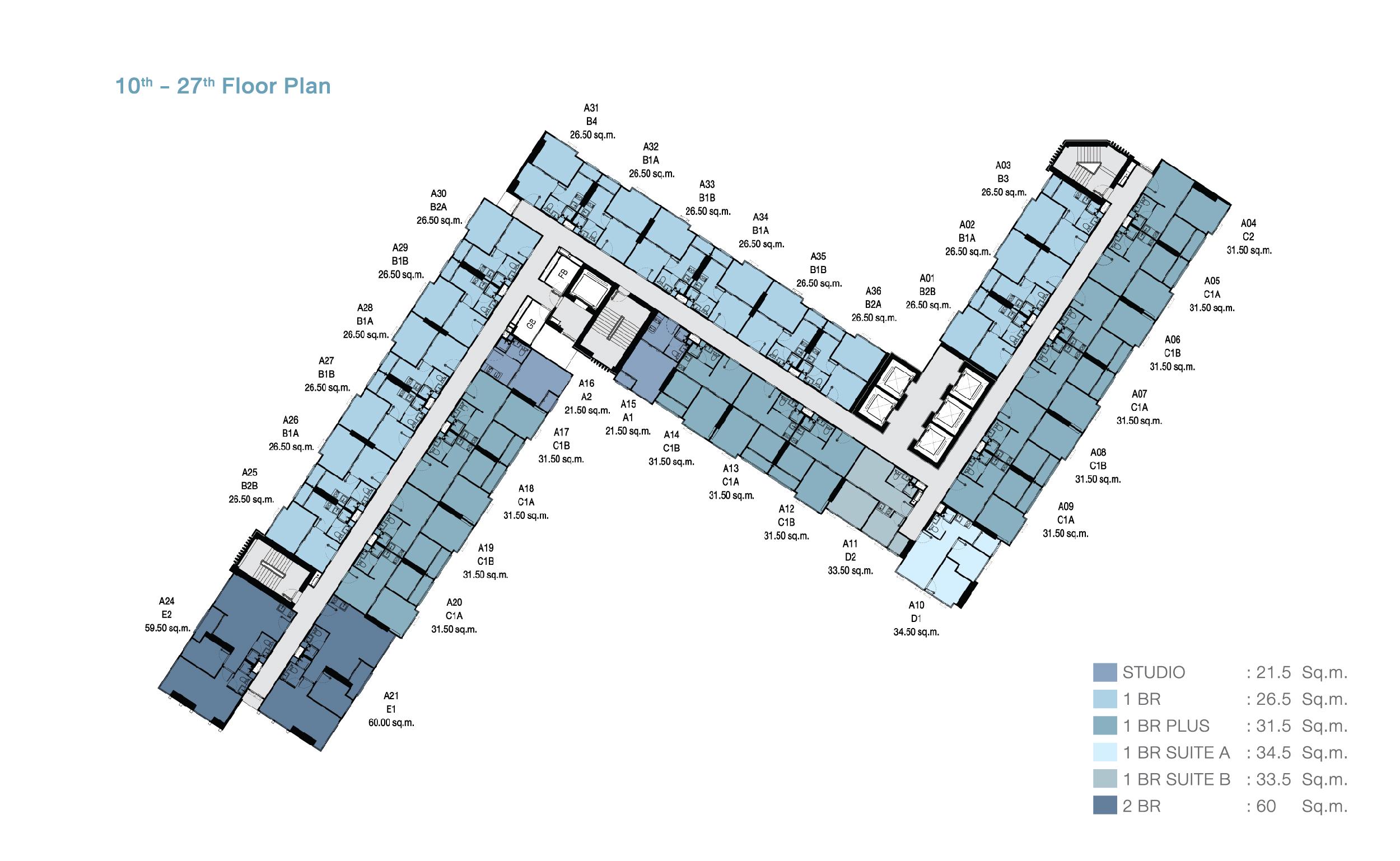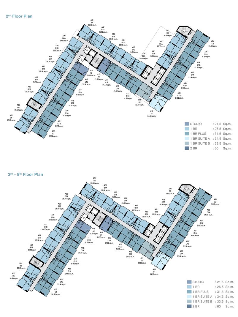 จำนวนห้องพักอาศัยสูงสุดจะอยู่ที่ชั้น 2-9 มี 36 ยูนิต ส่วนใหญ่เป็นห้อง 1 Bedroom เกือบยกชั้น ขนาดตั้งแต่ 26.50 - 33.5 ตารางเมตร และมีห้อง Studio ขนาด 21.50 ตารางเมตรอีกแค่ 2 ห้อง ตรงบันได้หนีไฟ (ห้องน้ำเงิน) ทุกห้องจะหันระเบียงออกนอกอาคาร ครบทุกทิศเหนือ-ใต้-ออก-ตก เพื่อรับวิวมุมสูง