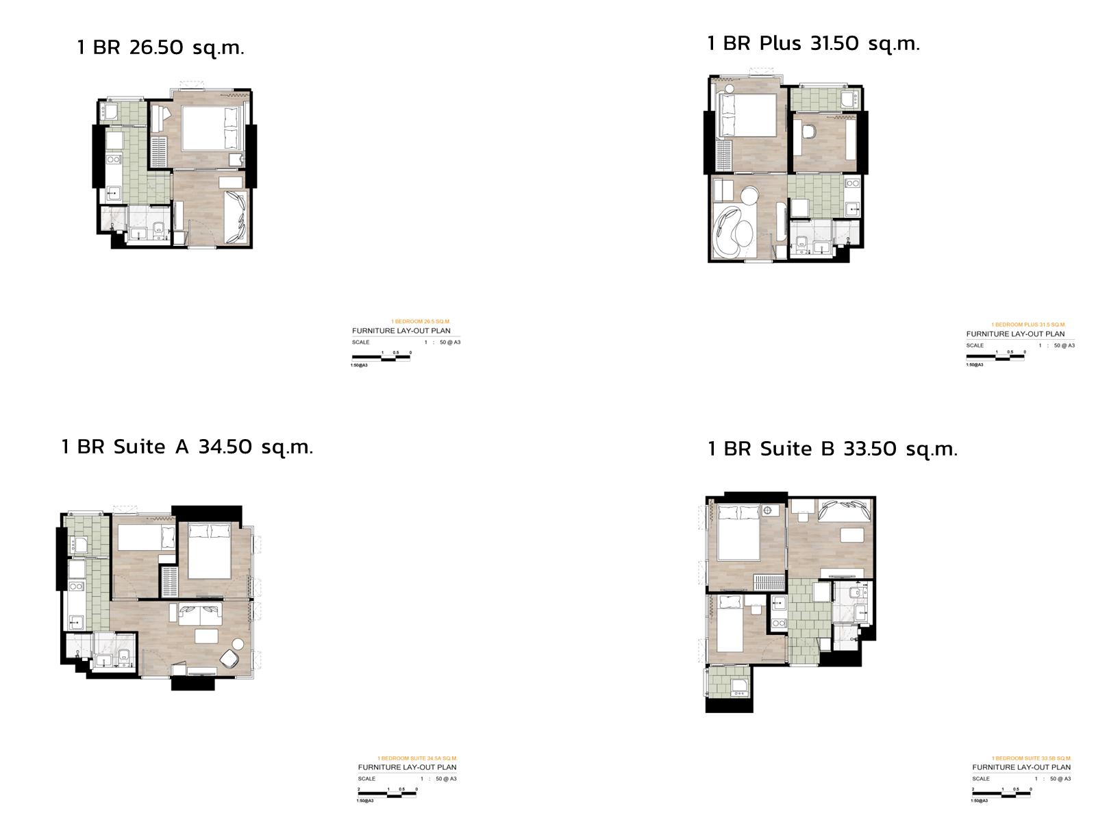 - 1 Bedroom Suite A & B ขนาดพื้นที่ใช้สอย 33.50 - 34.50 ตารางเมตร