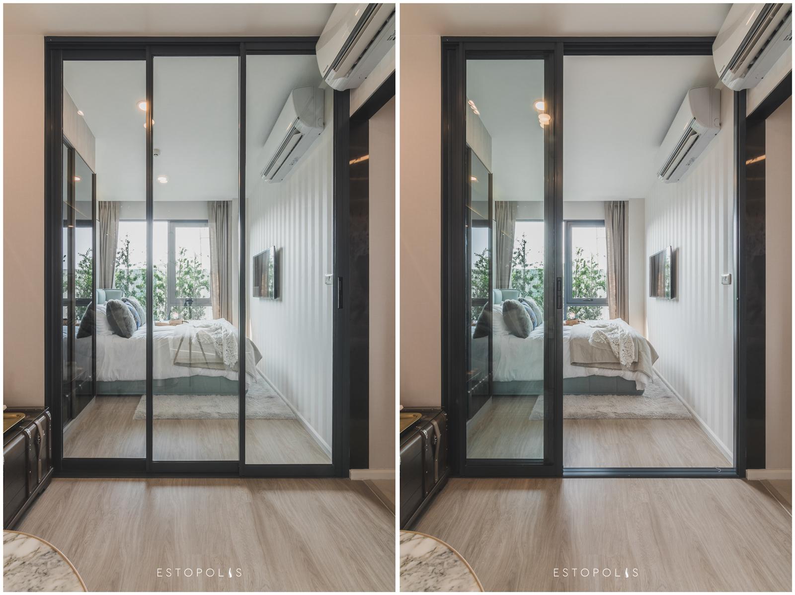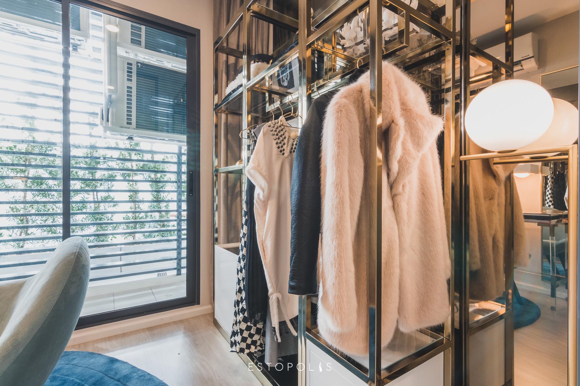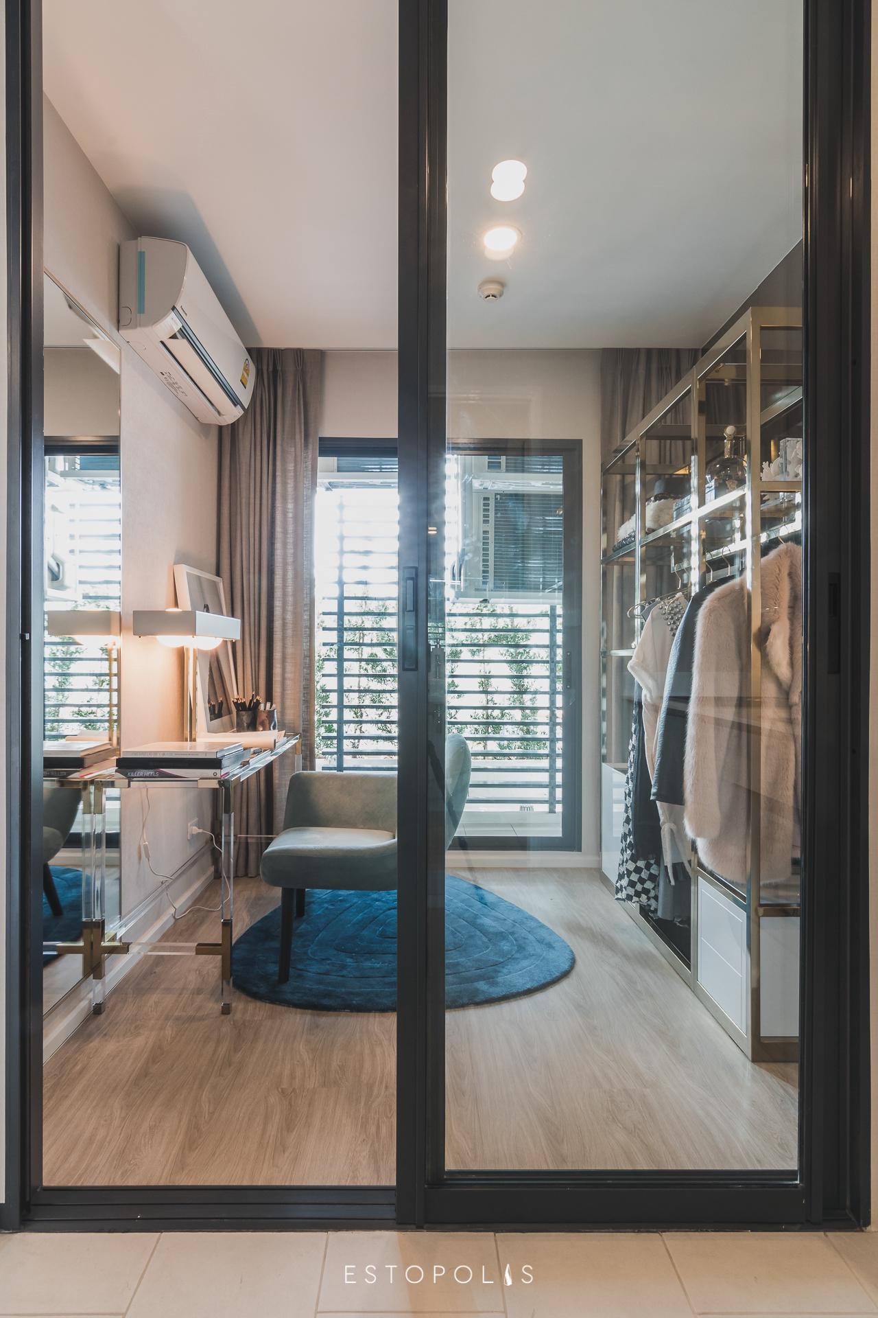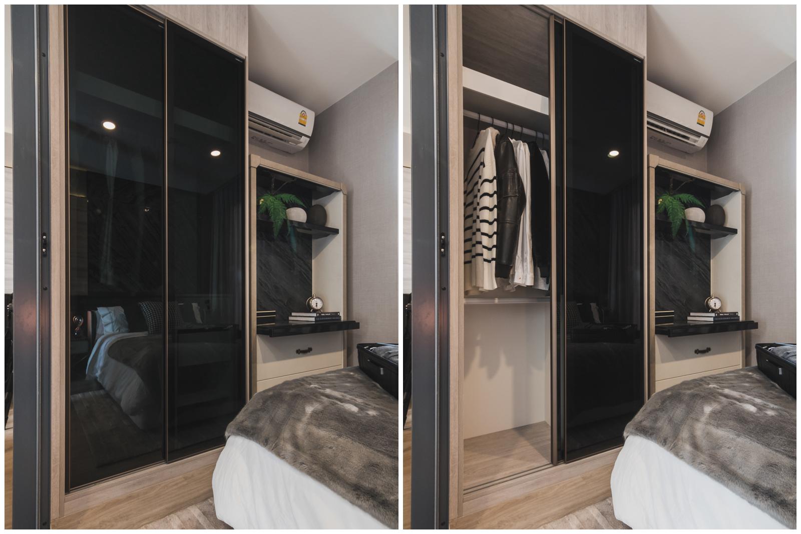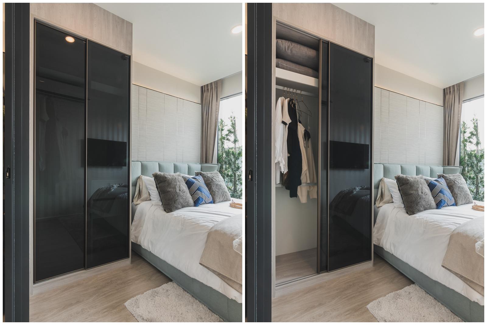 สำหรับตู้เสื้อผ้าบิ้วท์อินของทางโครงการ จะใช้เป็นตู้เสื้อผ้าแบบโปร่งแสง หน้าบานติดตั้งเป็นกระจกสีชา ซึ่งเป็นเทคนิคในการเลือกเฟอร์นิเจอร์ที่ช่วยให้ห้องดูโปร่ง ไม่ปิดทึบ