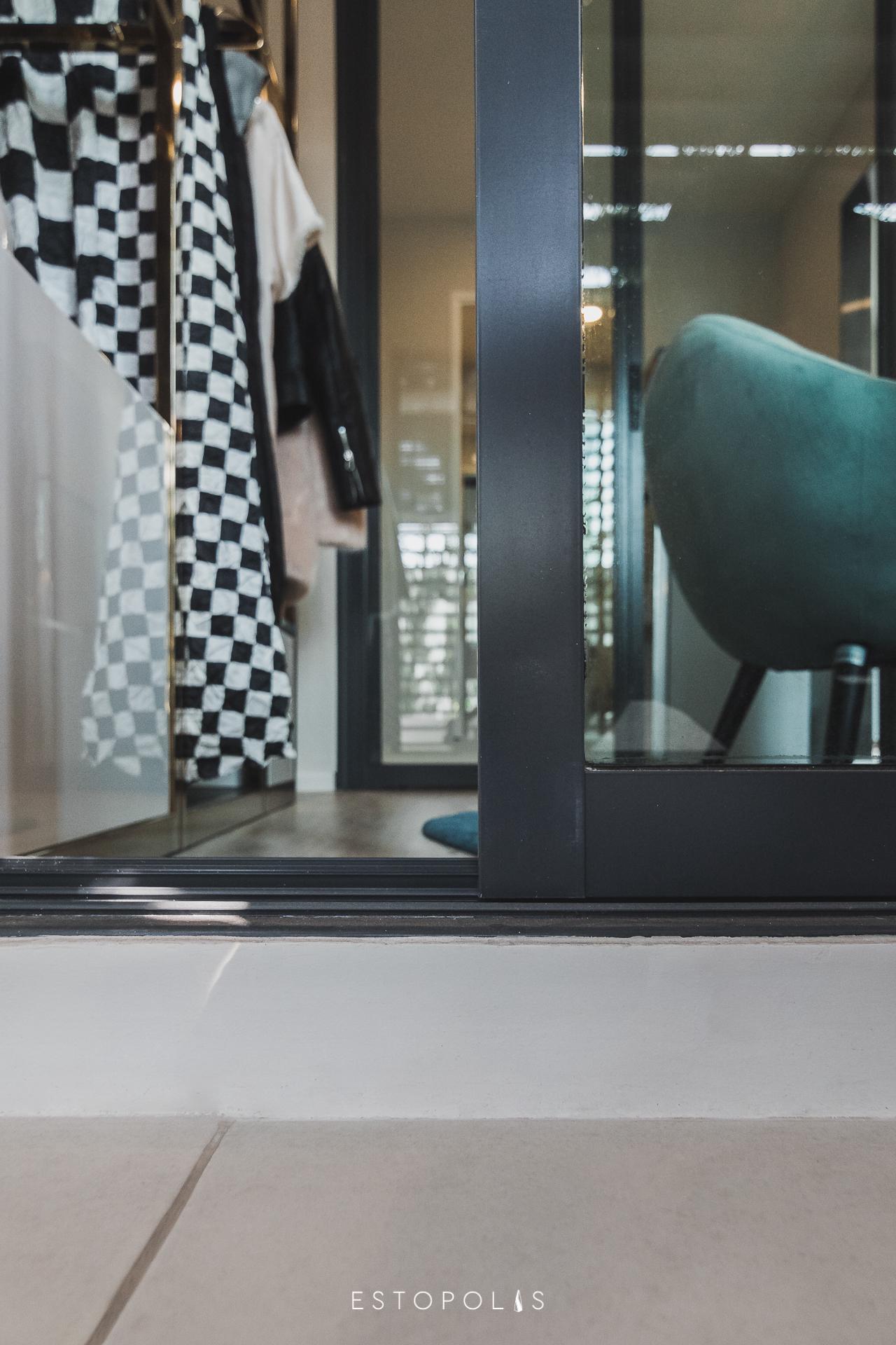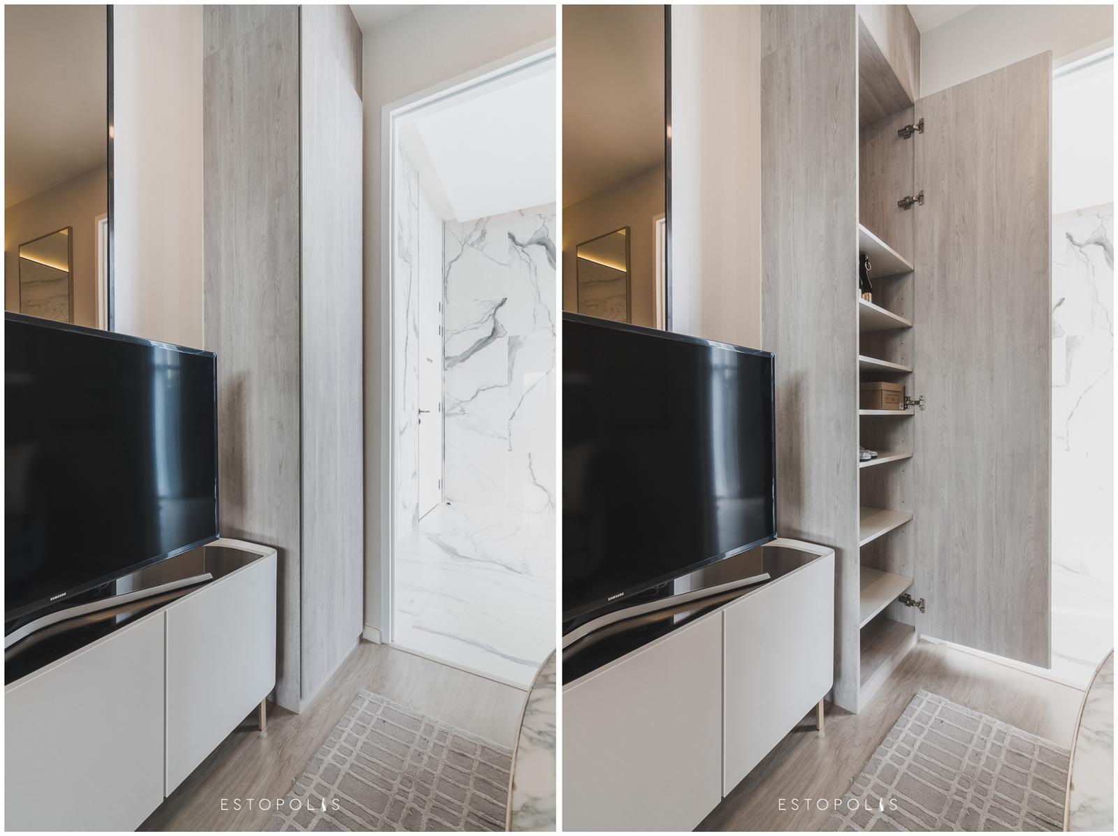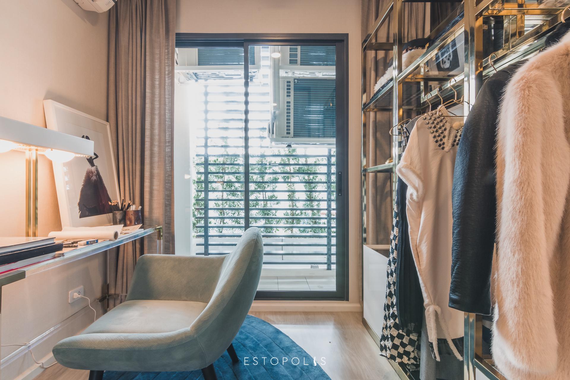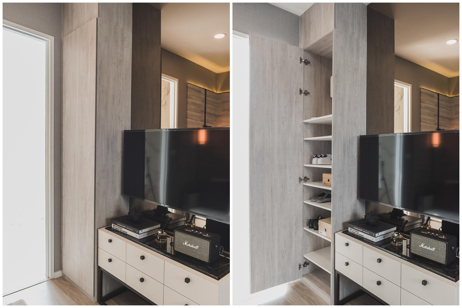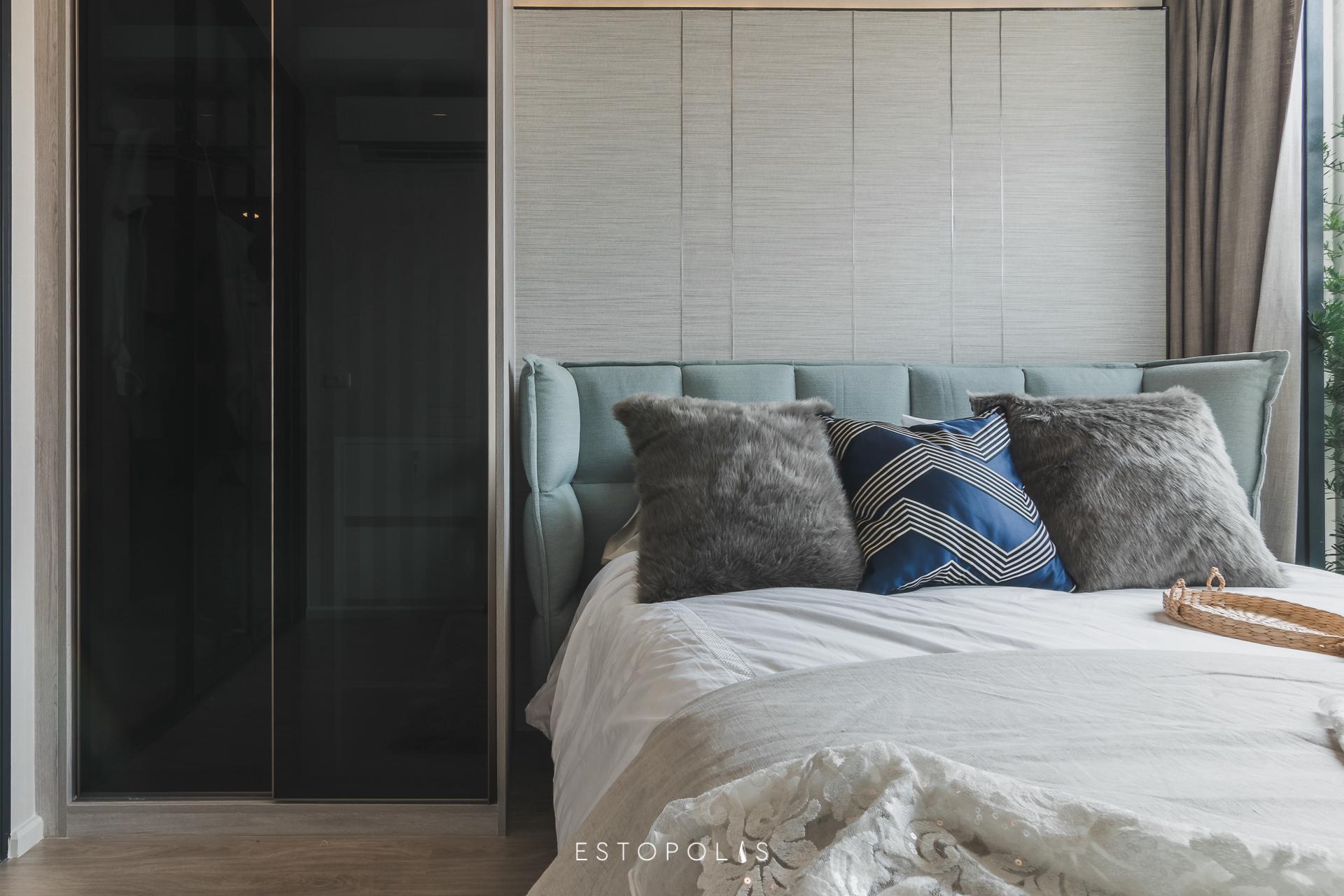 สำหรับตู้เสื้อผ้าบิ้วท์อินของทางโครงการ จะใช้เป็นตู้เสื้อผ้าแบบโปร่งแสง หน้าบานติดตั้งเป็นกระจกสีชา ซึ่งเป็นเทคนิคในการเลือกเฟอร์นิเจอร์ที่ช่วยให้ห้องดูโปร่ง ไม่ปิดทึบ