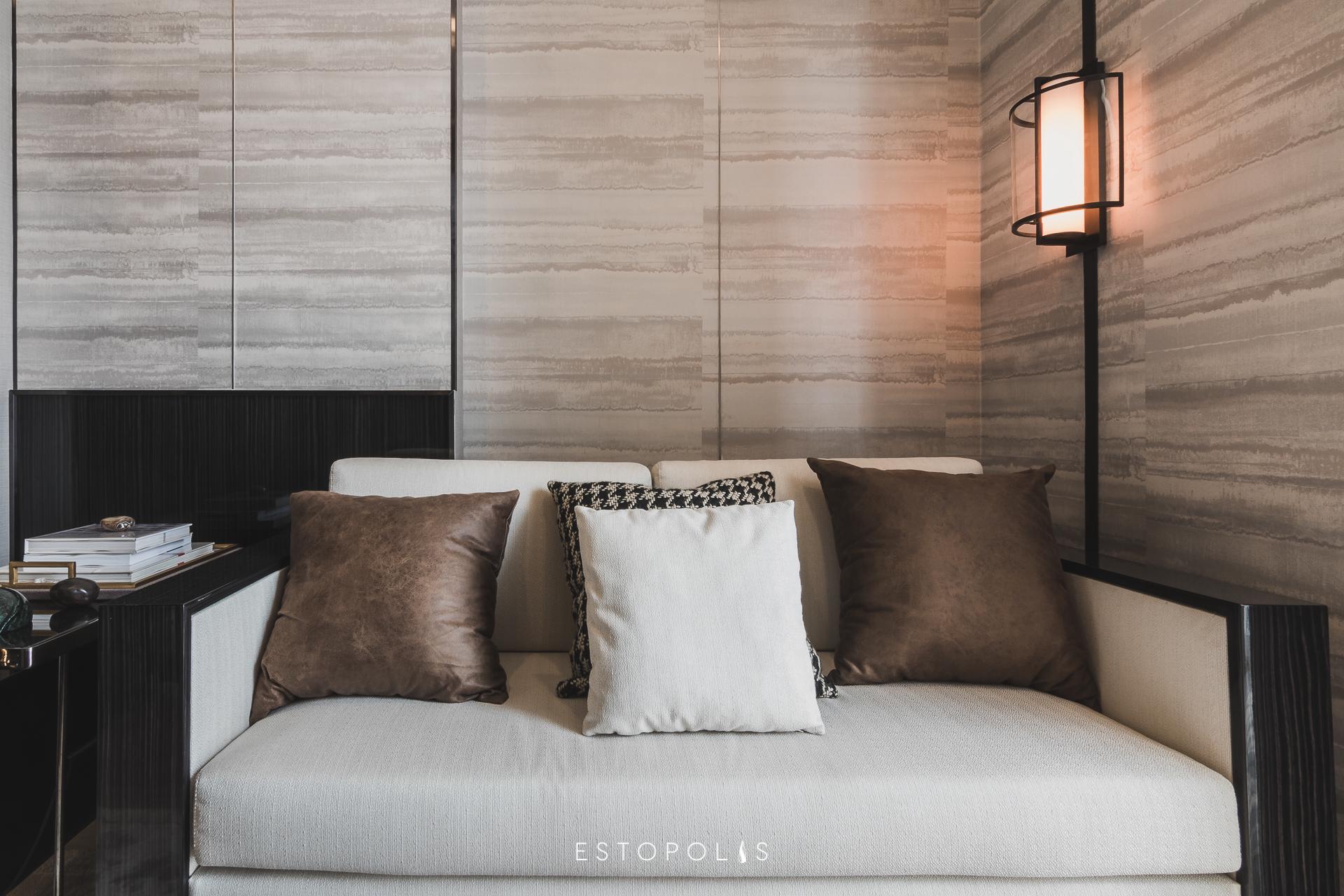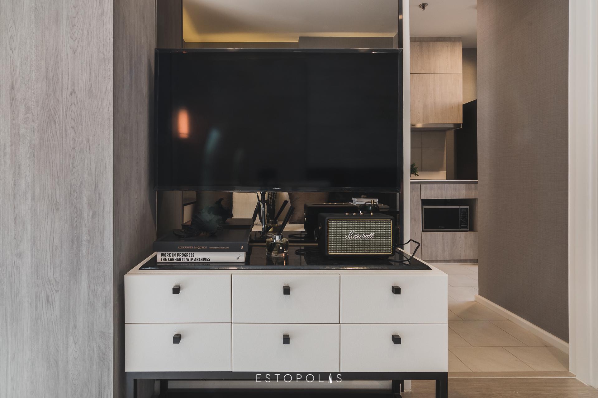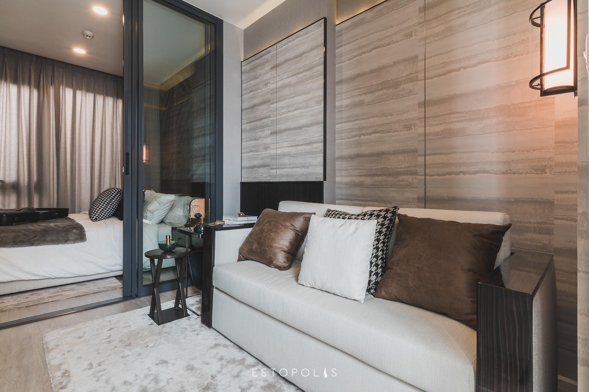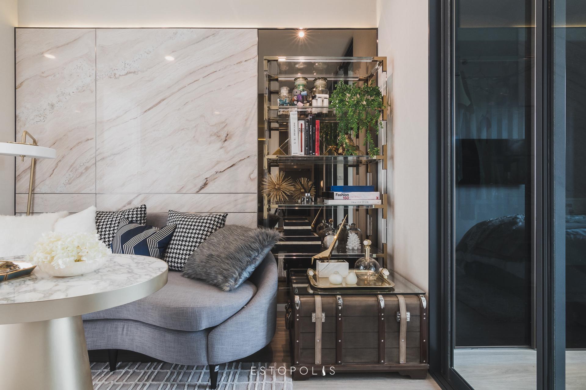 เมื่อเปิดประตูเข้ามา จะเจอห้องรับแขกกับห้องนอนตั้งอยู่ในแนวเดียวกัน แล้วกั้นด้วยพาร์ติชั่นกระจกใสเพื่อความปลอดโปร่ง มีแสงสว่างส่องถึงตัวห้องด้านใน ช่วยขยายพื้นที่พักผ่อนให้ดูกว้างขว้างขึ้น ส่วนขวามือเป็น พื้นที่สำหรับการใช้งาน โดยวางห้องน้ำกับห้องครัวอยู่ใกล้กัน พื้นส่วนนี้จะปูกระเบื้อง เพื่อความสะดวกในการเช็ดล้างทำความสะอาด และมี ห้องอเนกประสงค์เพิ่มเข้ามา อยู่ติดกับระเบียง เหมาะสำหรับตกแต่งเป็นห้องทำงานหรือห้องแต่งตัว นอกจากนี้ยังทำเป็น ห้องนอนเล็ก ได้อีกด้วย