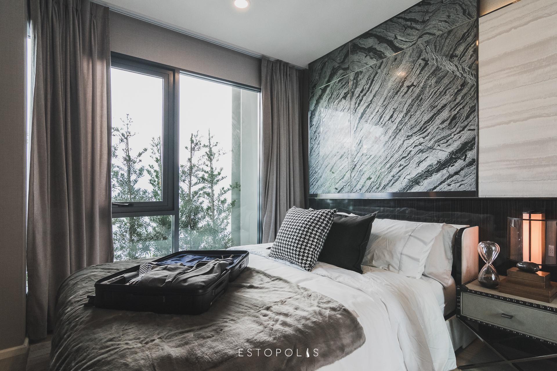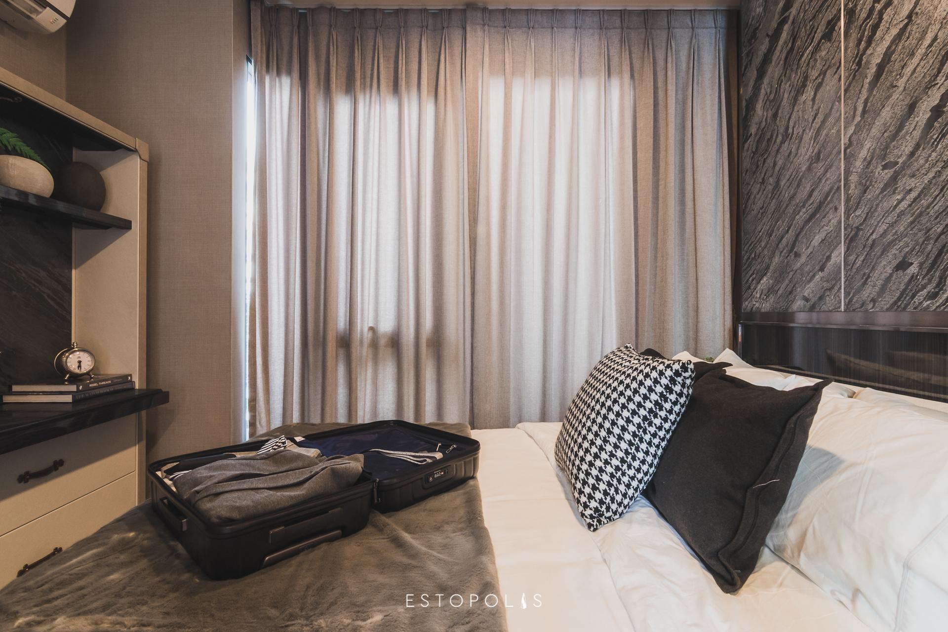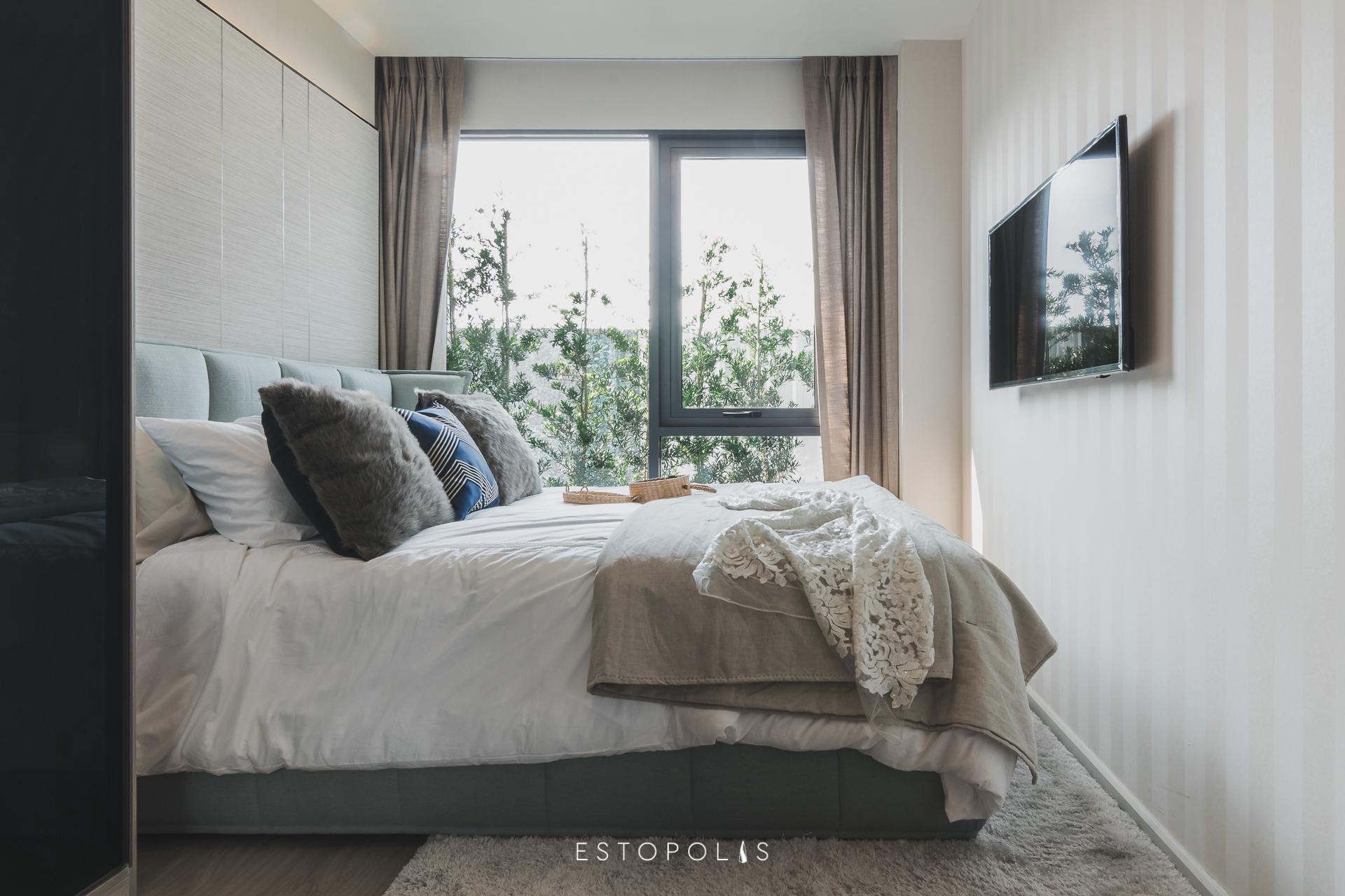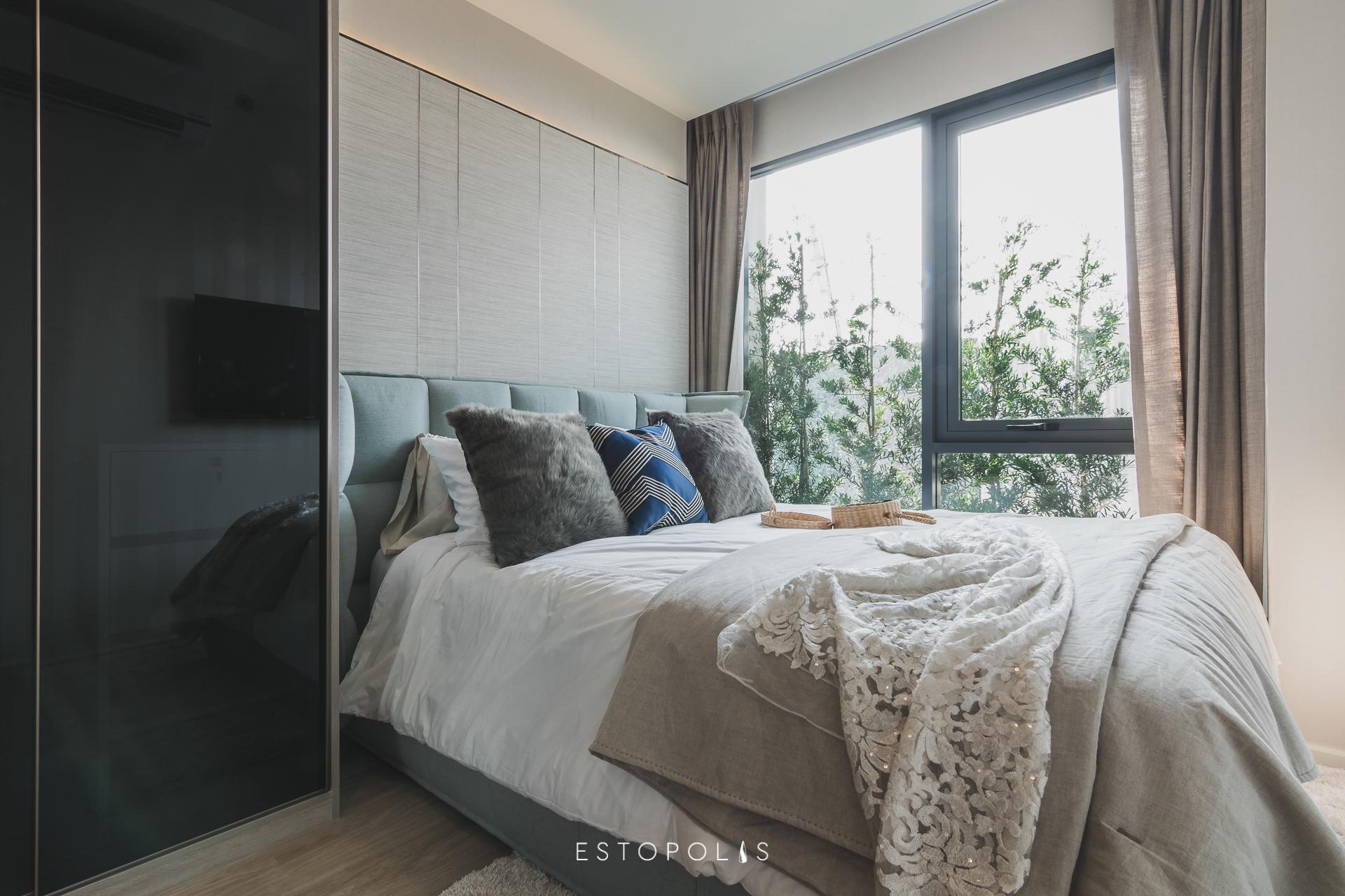 ห้องนอน เน้นรองรับไลฟ์สไตล์การพักผ่อน ด้วยช่องรับแสงบานกว้างที่อยู่ติดด้านใน ทำให้เราสามารถมองเห็นวิวนอกโครงการได้ชัดเจน พื้นห้องปูลานิเมตเช่นเดียวกับห้องนั่งเล่น และมี ตู้เสื้อผ้า บิ้วท์อินให้ 1 ตัวพร้อมผ้าม่าน