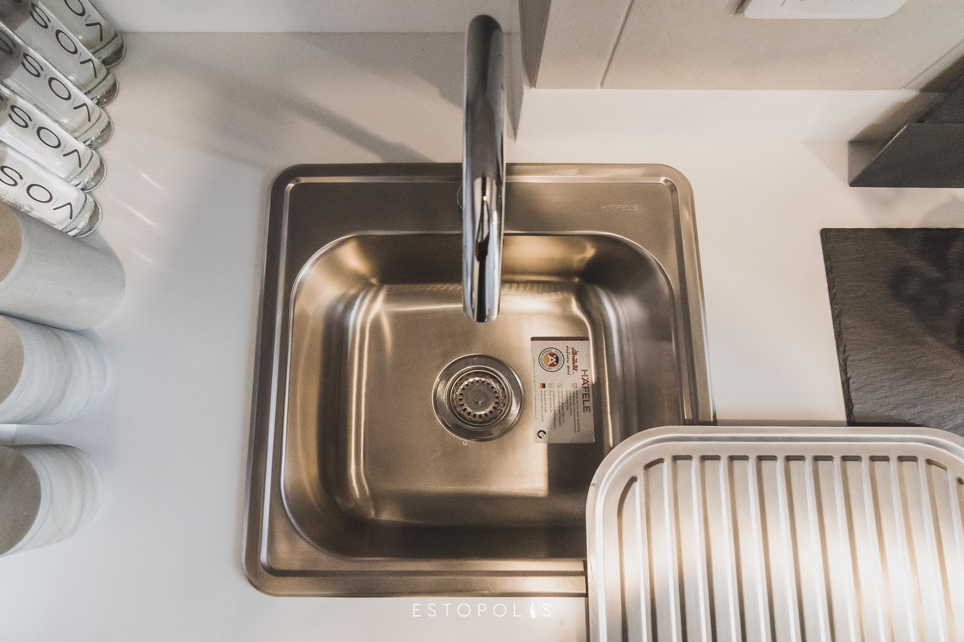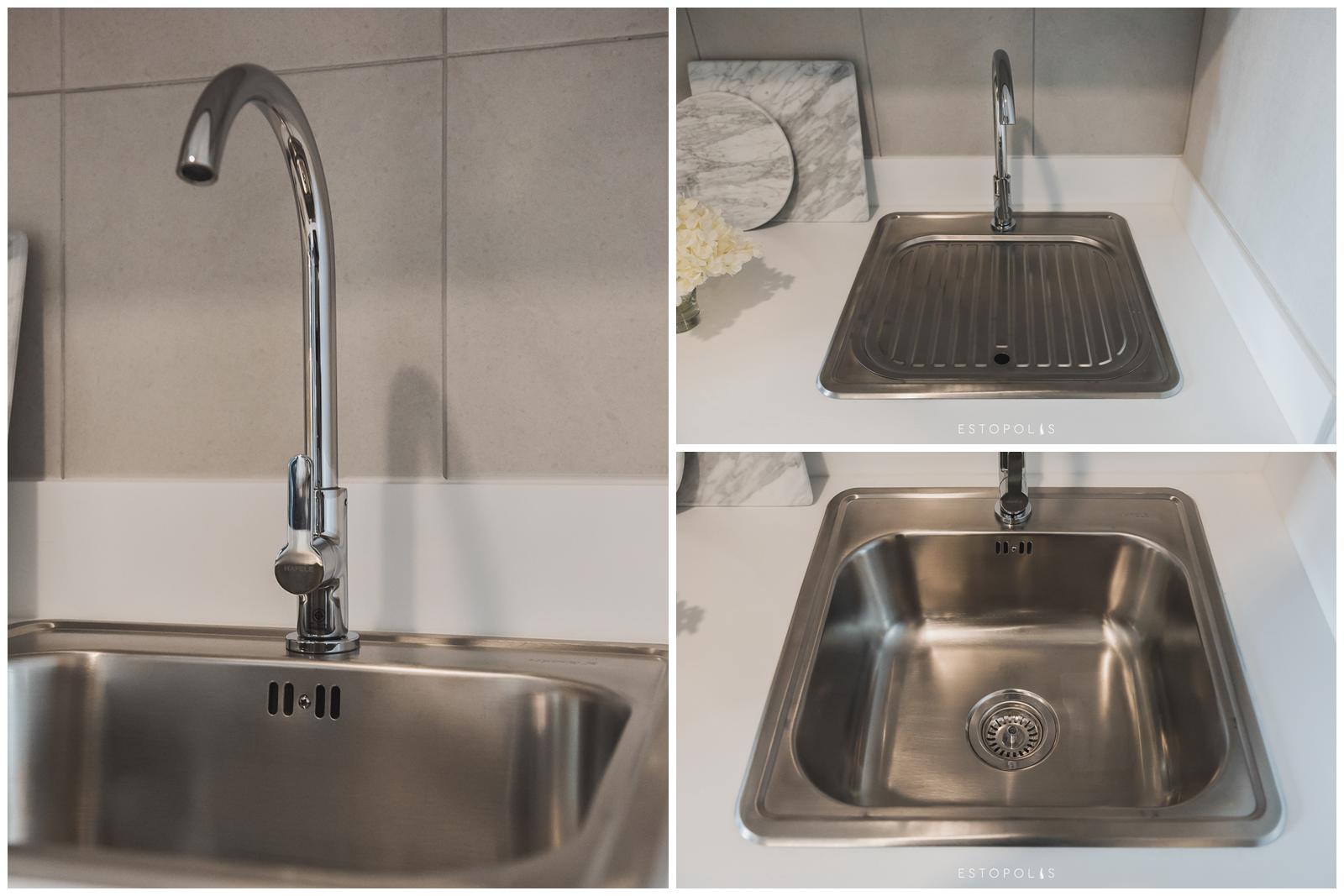 ซิงค์ล้างจานสแตนเลสทรงสี่เหลี่ยมก้นลึก จาก HAFELE มีขอบที่พักจานเล็กน้อย เพื่อป้องกันน้ำกระเซ็น ส่วนก็อกน้ำสามารถหมุนปรับทิศทางได้จึงสะดวกเวลาใช้งาน