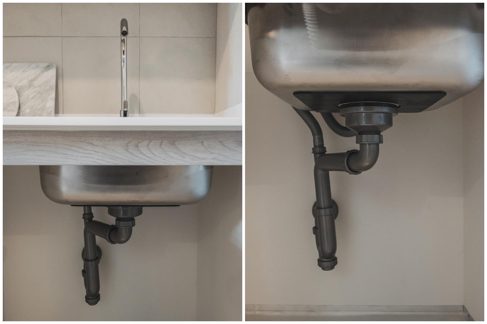 ก้มไปเป็นตู้ใต้ซิงค์ เหลือเนื้อที่ให้เก็บของชิ้นใหญ่ได้ หรือจะวางถังขยะไว้ข้างในก็ช่วยเก็บกลิ่นได้ในระดับหนึ่ง