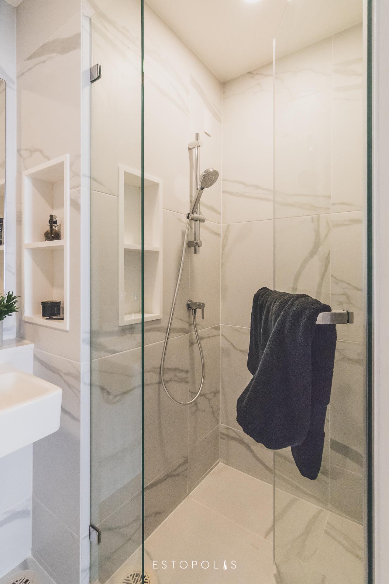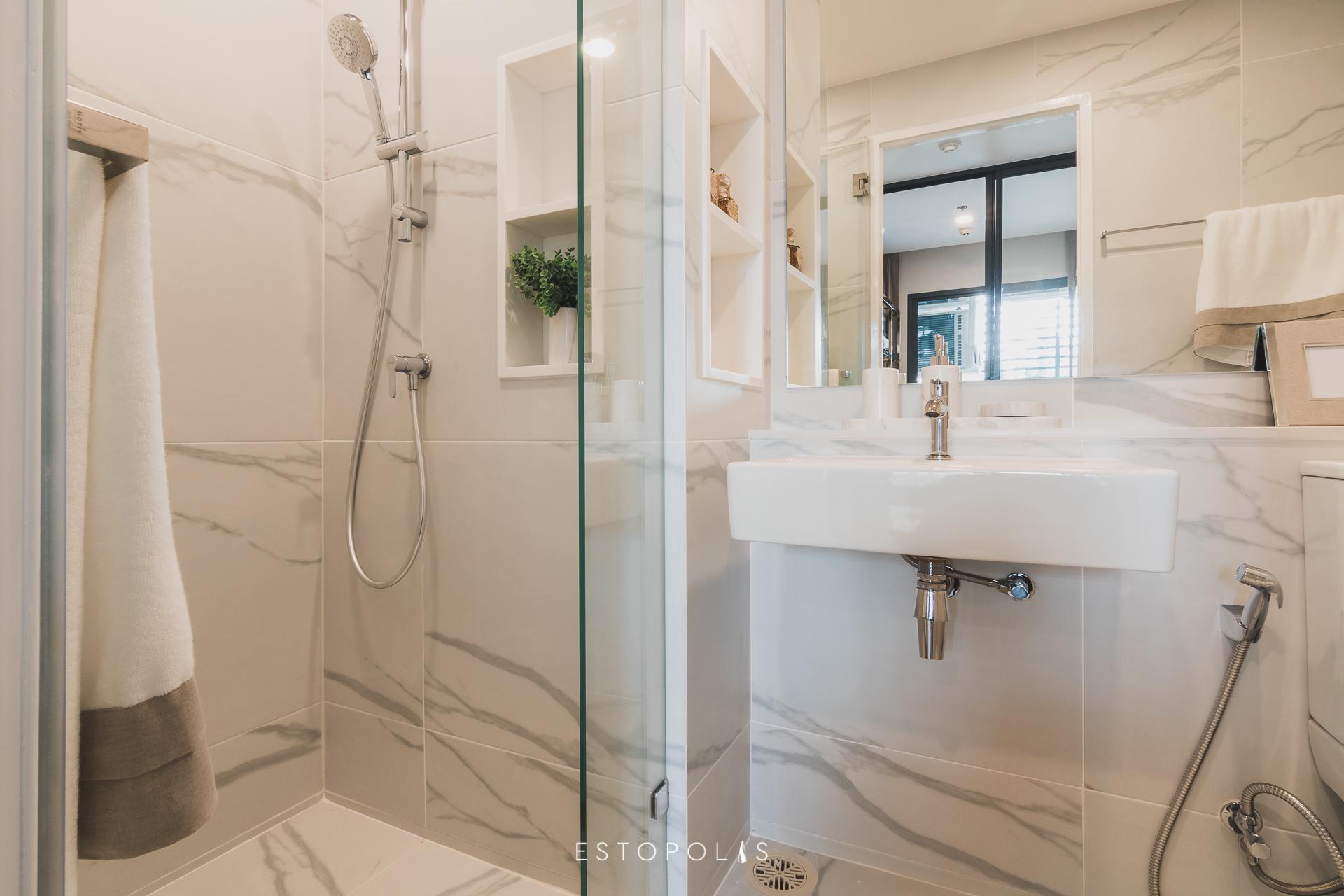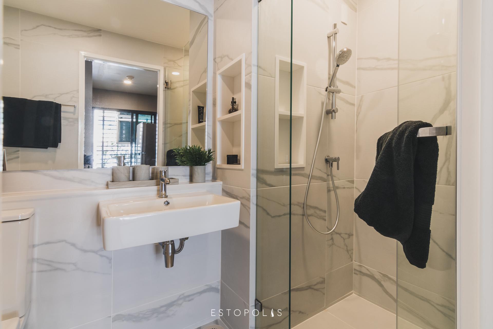ห้องอาบน้ำกว้างประมาณ 90 x 90 เซนติเมตร พาร์ติชั่นกระจกแบบผลักเข้าใน จึงไม่มีปัญหาชนขอบอ่าง และมีราวจับขนาดใหญ่ให้แขวนผ้าขนหนูได้อีกจุดหนึ่ง