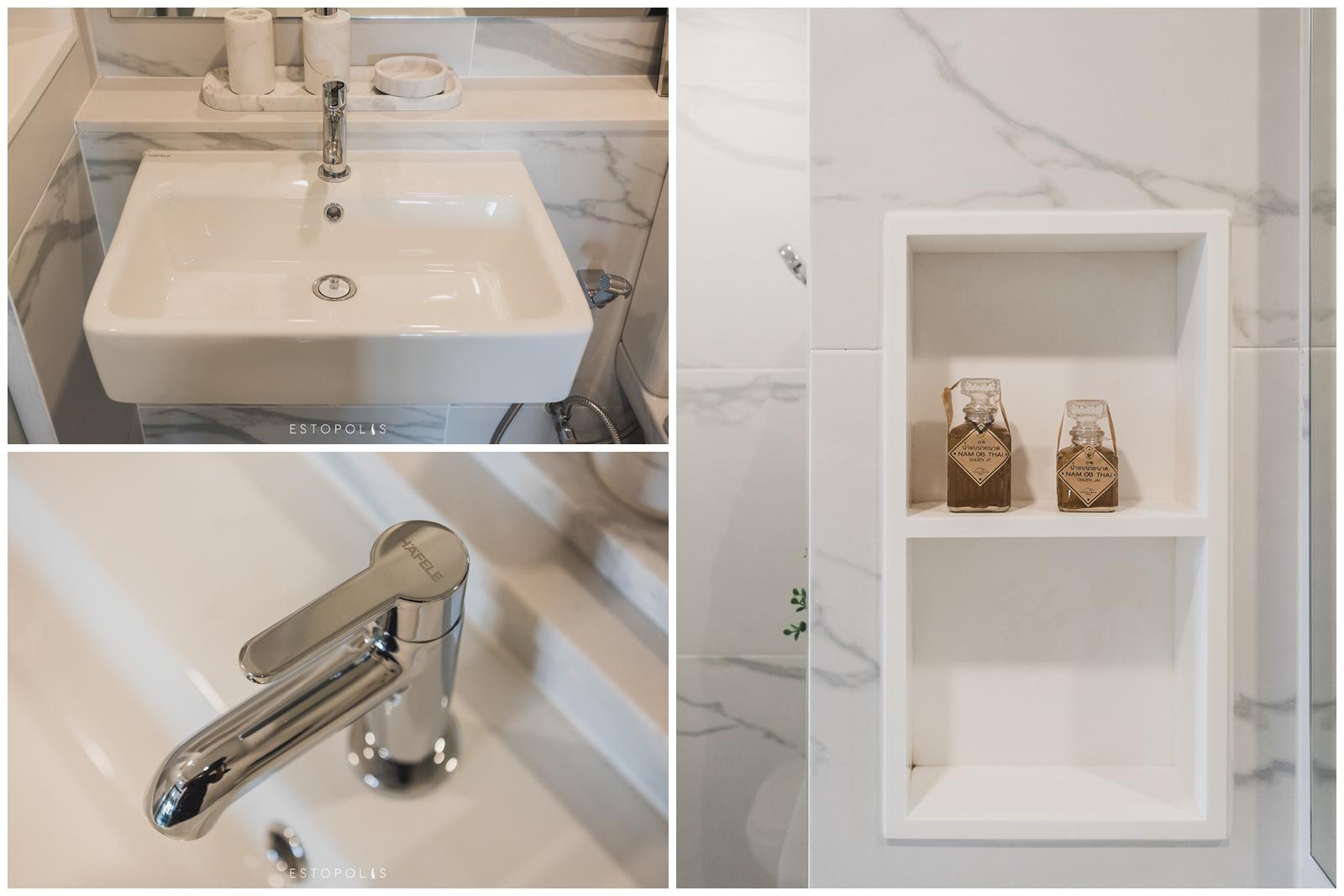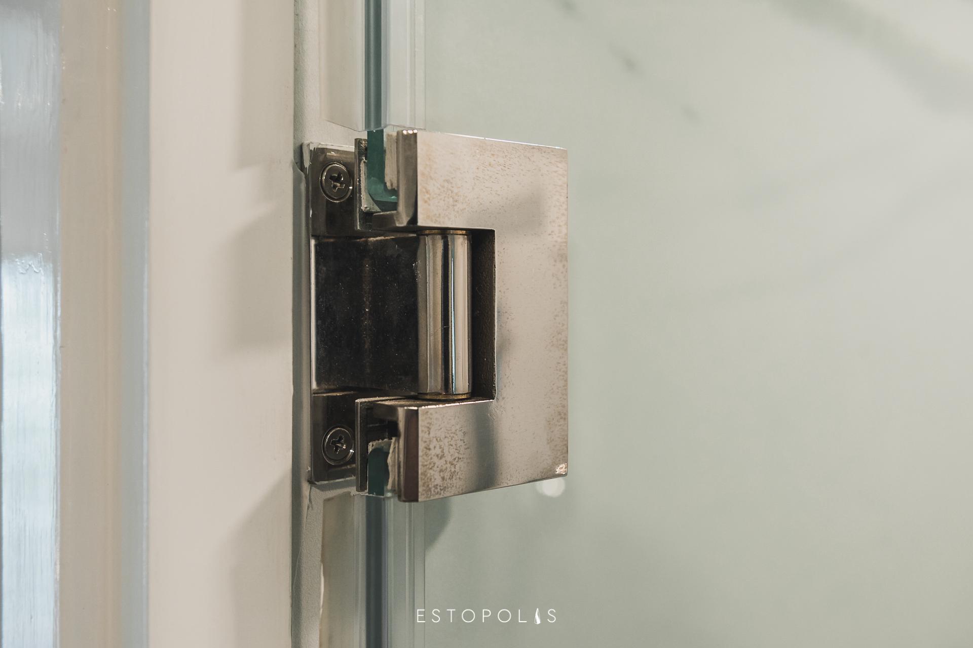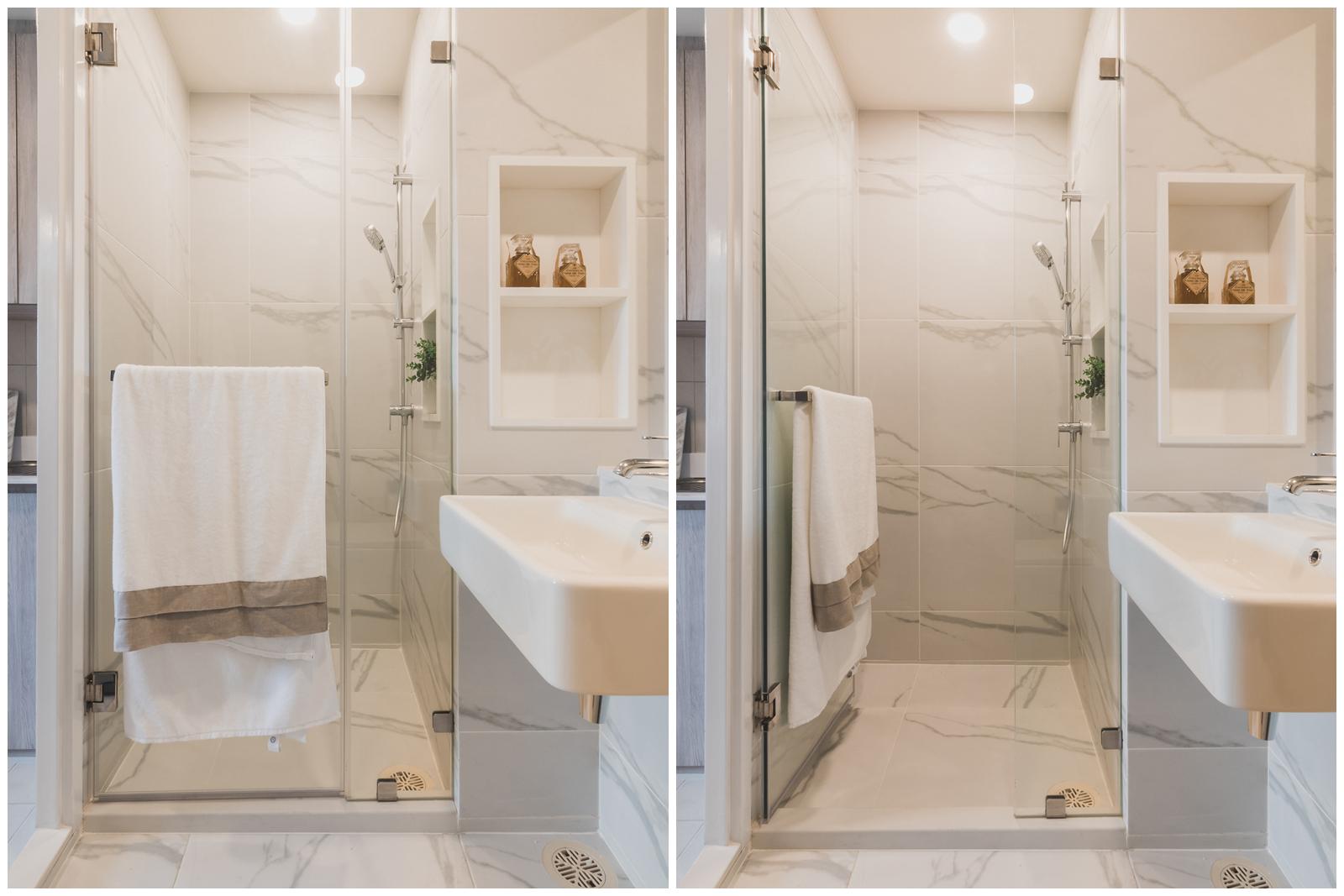 อีกฝั่งจะเป็นโซนเปียกที่กั้นด้วยพาร์ติชั่นกระจก Tempered glass สูงเกือบ 2 เมตร จึงช่วยกันน้ำกระเด็นออกมาข้างนอกได้เป็นอย่างดี